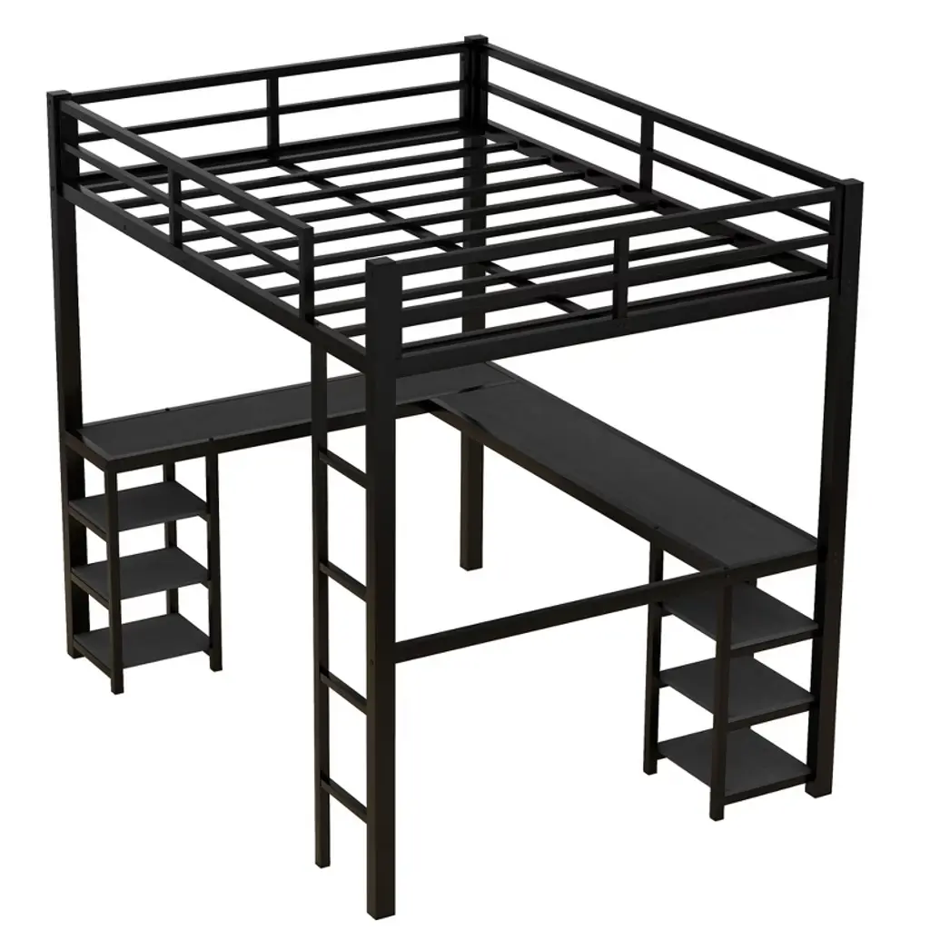 Okak Full Size Loft Bed With L-shaped Desk,metal Bunk Beds With Bookshelf & Safety Rails For Small Bedrooms,high Loft Beds For Kids,teens,black