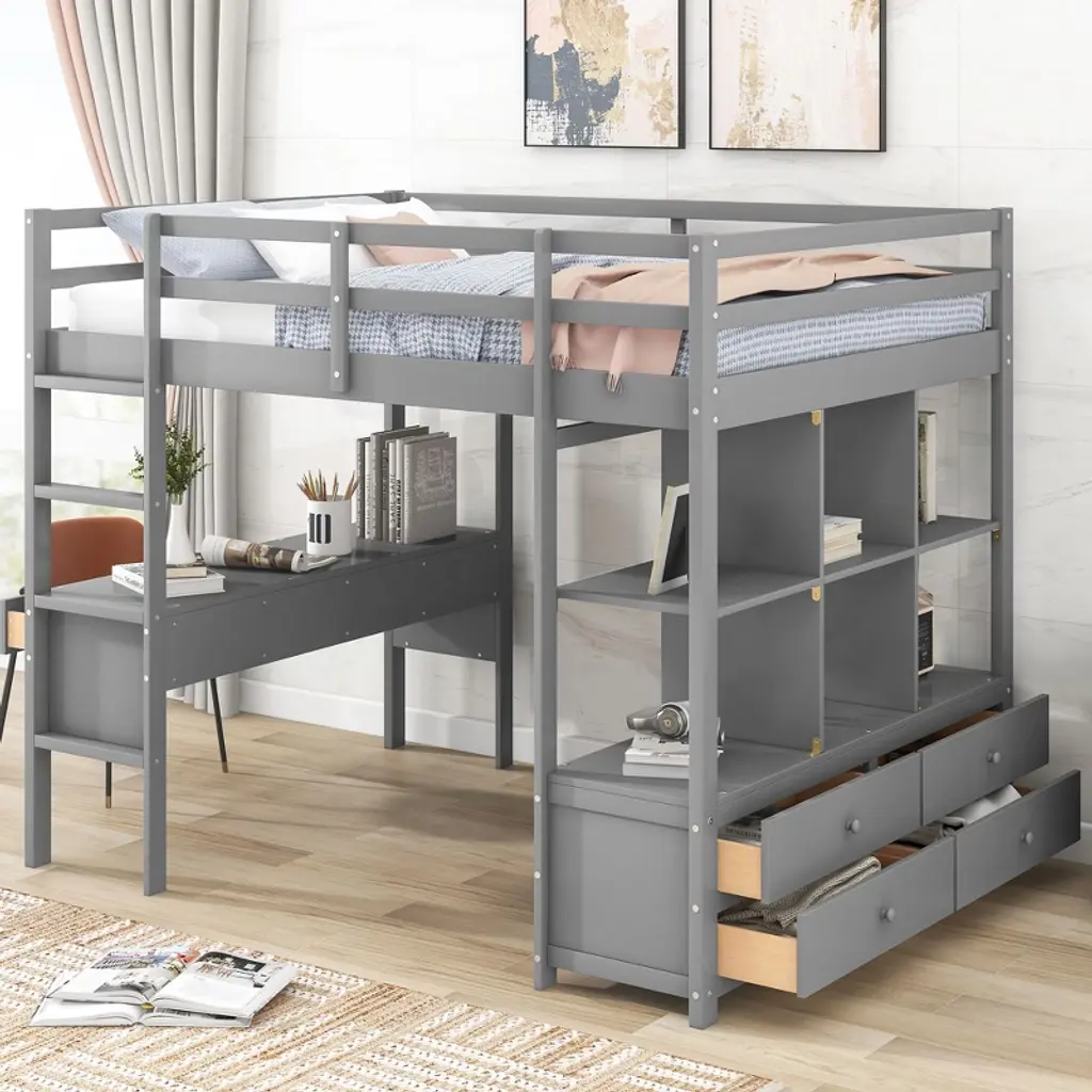 Okak Full Size Pine Wood Bunk Bed With Built-in Desk & Storage Cabinets Loft Bunk Bed With 2 Drawers For Teens, Easy Assemble, Gray