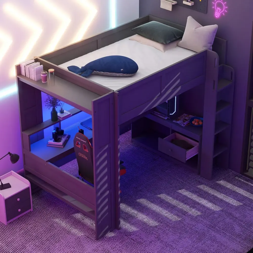 This versatile full loft bed with desk combines sleeping, studying and storage in one space-saving unit. The bunk bed features built-in LED lighting with 4 color options, plus a convenient charging station with 2 outlets and 2 USB ports. Made from sturdy wood with full-length guardrails and integrated ladder, this loft bed with storage provides both safety and functionality. Perfect for kids' bedrooms, it includes multiple shelves, cabinets and a drawer for organized storage.