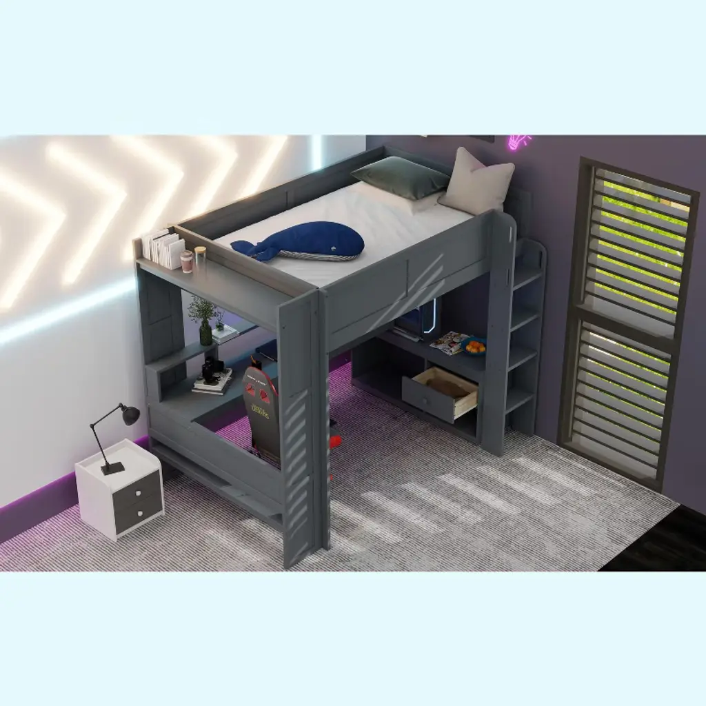 Okak Full Size Wooden Loft Bed With Desk & Multi-storage Shelves,bunk Bed With Leds,charging Station,multi-functional Loft Beds For Kids,teens,gray