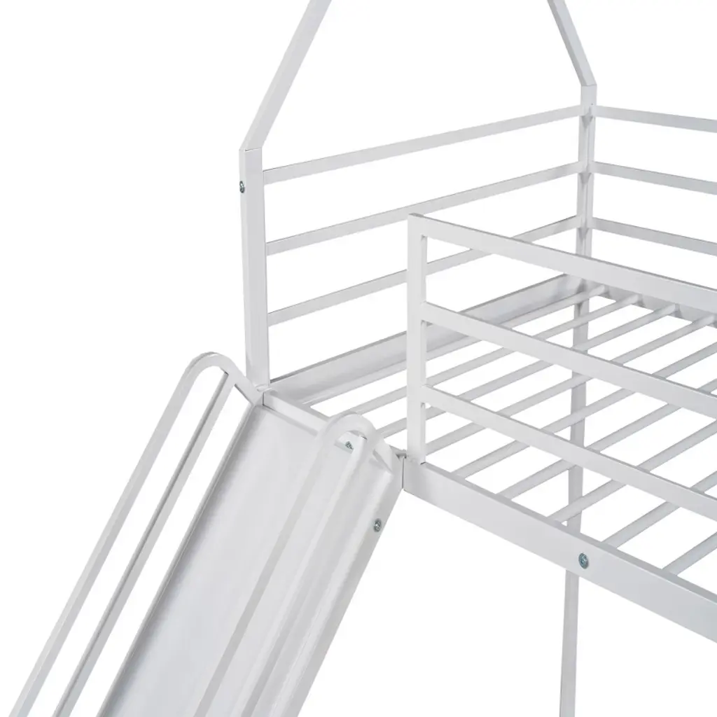 Okak Twin Over Twin Metal House Bunk Bed With Slide And Built-in Ladder Low Loft Bunk Bed With Safety Guardrail For Kids Teens, Easy Assemble, White