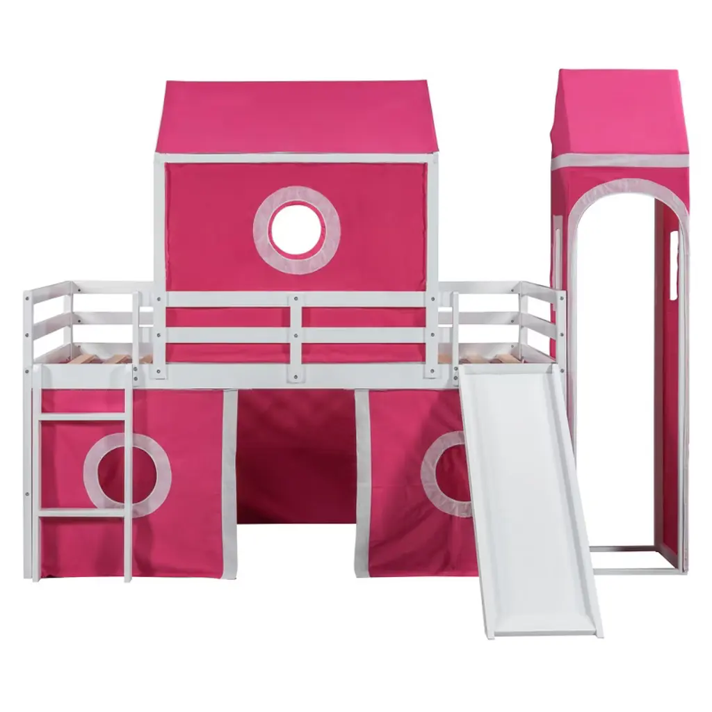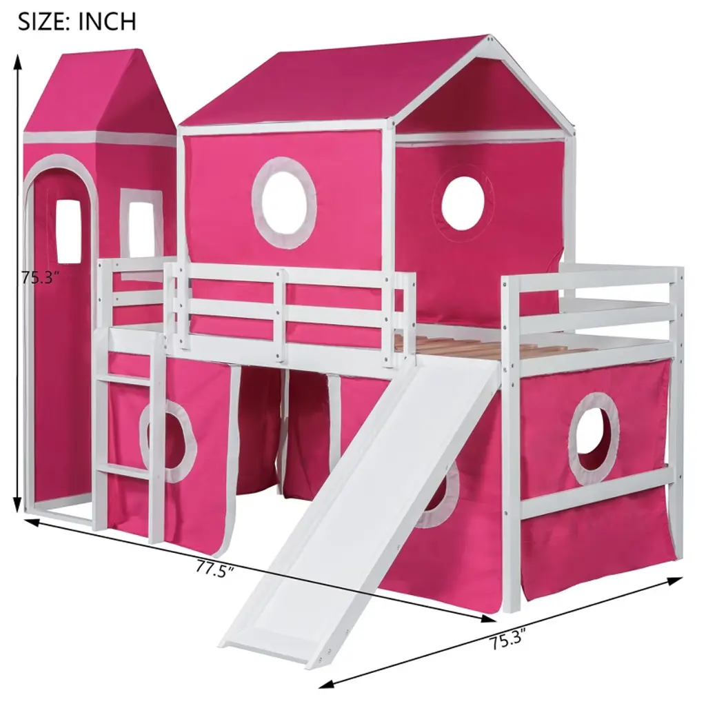 Okak Twin Size Solid Wood Loft Bed With Slide & House Tent & Tower Design,modern Colorful Bed Frame For Kids Room,bedroom,pink