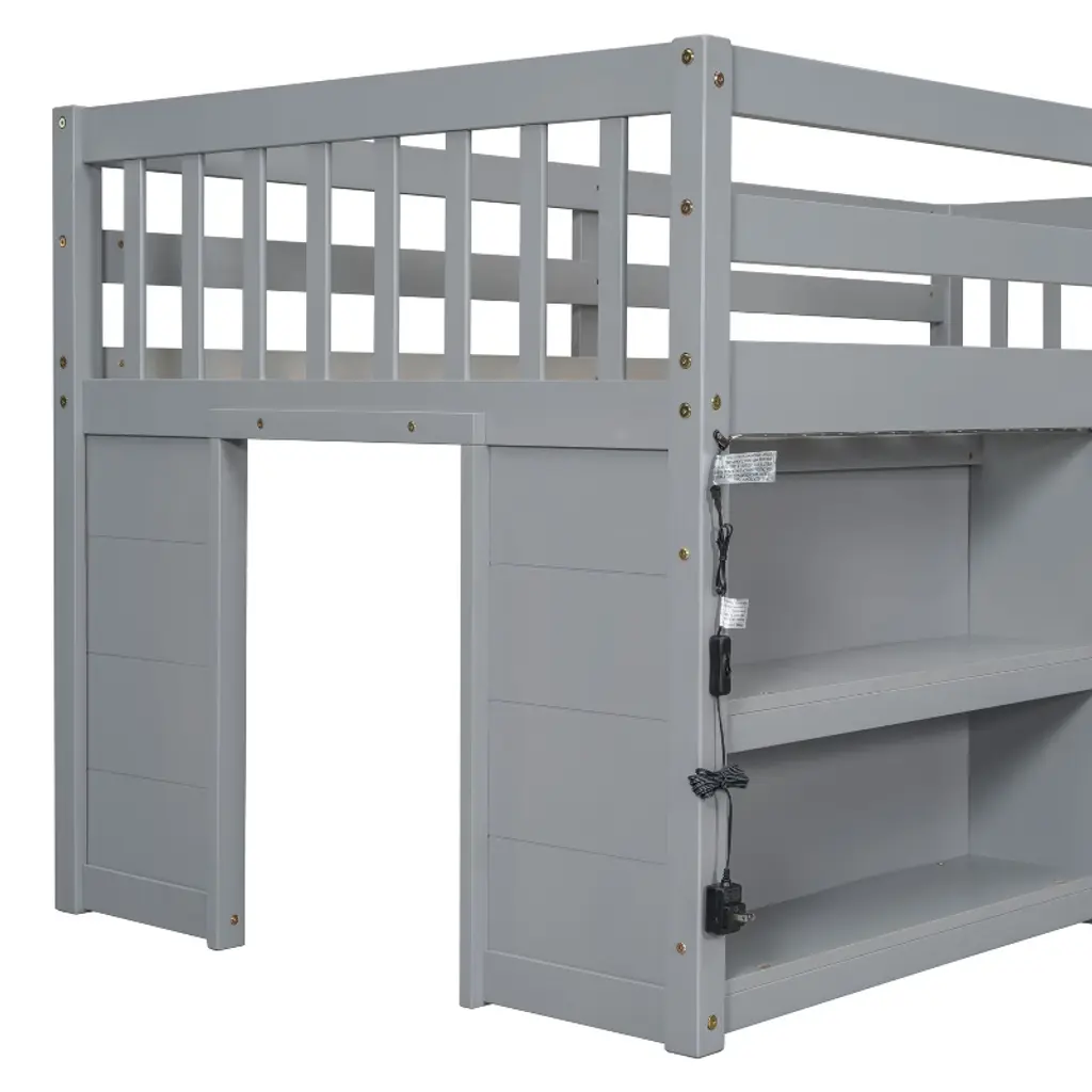 Okak Twin Size Wood Bunk Bed With Two-tier Shelves & Safety Guardrail Low Loft Bunk Bed With Led For Kids, Easy Assemble, Grey