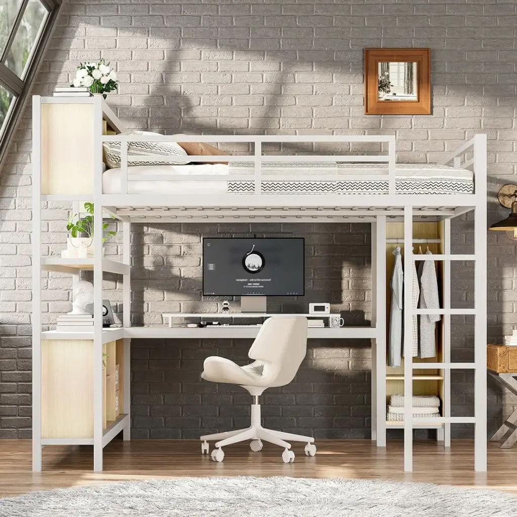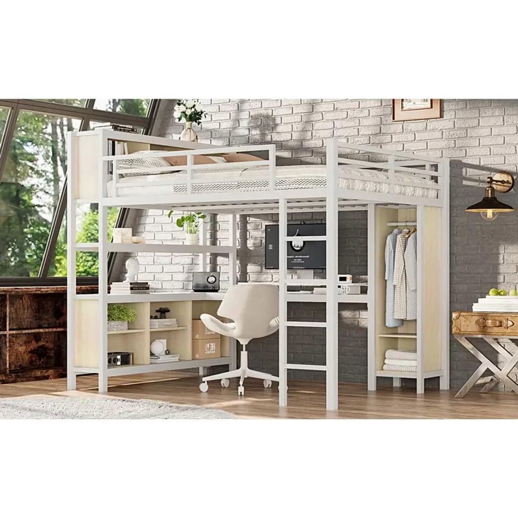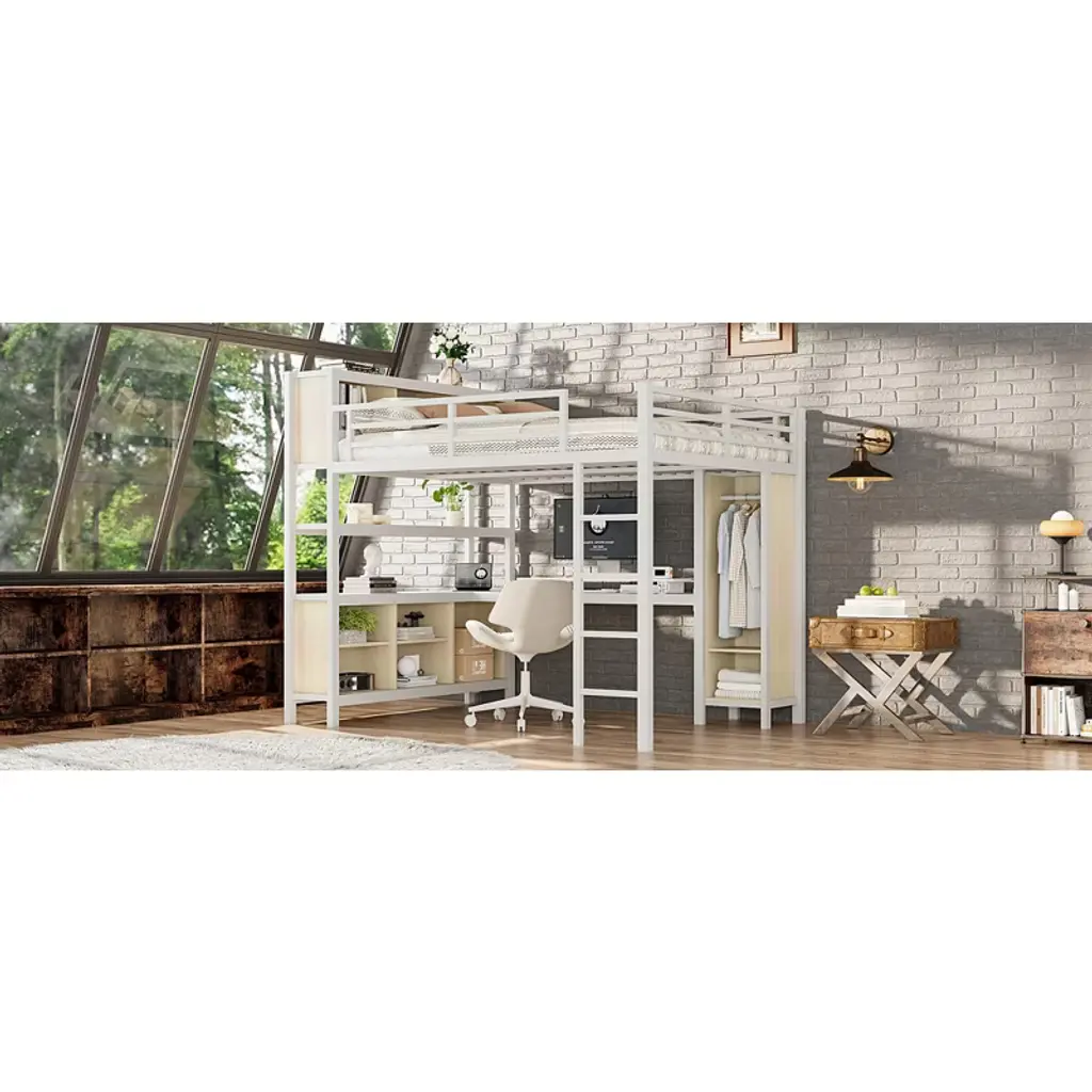 Product Features Modern Style: This queen metal loft bed with desk is an ideal gift for a child! The simple and airy look suits any room style. Our loft bed is versatile and perfect for apartments, dorms, and teenage rooms!Queen Loft Bed with Wardrobe and Desk: This metal loft bed has a cozy sleeping space, a spacious and practical L-shaped desk that can be used as a workbench or reading area, and the wardrobe can provide a great place for your everyday clothes.Space Saving: This metal bunk loft bed with wardrobe¡¢desk and storage shelves is designed for rooms with limited floor space. It's the perfect addition for growing teens, giving them the freedom to rest and entertain!Solid Metal Loft Bed: The Metal Loft Bed Frame is made of sturdy metal with a full-length guardrail for safety and stability. No springs required.Easy to Assemble: The packages comes with a clear and detailed assembly instruction guide, and all the necessary tools for you to assemble the metal loft bed immediately. Please Kindly note that full loft bed will comes in 3 box. Descriptions This queen size loft bed with armoire has an elegant look that will complement any decor. There is an L-shaped desk and 4 storage compartments under the bed for your different needs. Storage squares at the end of the bed keep items within reach. This queen-size metal loft bed with storage will fulfill your needs for resting, working and reading! Weight & Dimensions Product Type: Metal Loft BedMaterial: Metal+MDFSize: QueenOverall Product Dimension: Overall Product DimensionOverall Product Weight: 225.53 LBSNumber of Package: 3Package Dimension & Weight: Please refer to the SpecificationWeight Capacity: 350LBSRecommend Bed Mattress Thickness: 6''Level of Assembly: Full Assembly NeededEligible for Hardware Packs: YesNote: All the pictures are taken by actual samples, slight chromatic aberration may occur due to lighting or display.