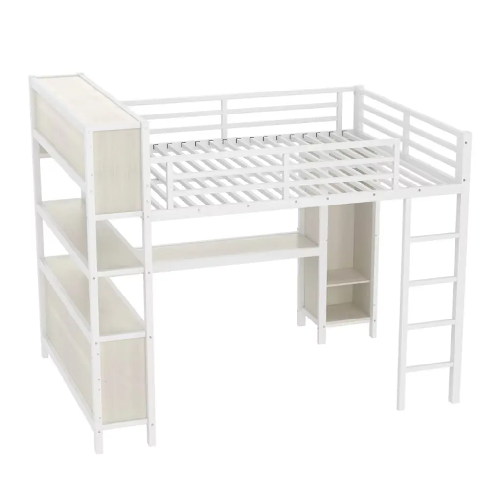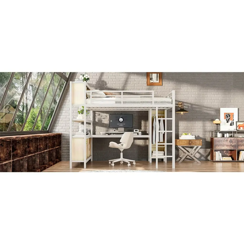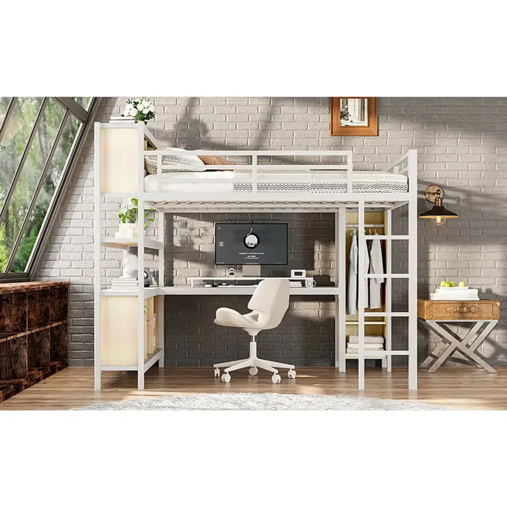 Product Features Modern Style: This queen metal loft bed with desk is an ideal gift for a child! The simple and airy look suits any room style. Our loft bed is versatile and perfect for apartments, dorms, and teenage rooms!Queen Loft Bed with Wardrobe and Desk: This metal loft bed has a cozy sleeping space, a spacious and practical L-shaped desk that can be used as a workbench or reading area, and the wardrobe can provide a great place for your everyday clothes.Space Saving: This metal bunk loft bed with wardrobe¡¢desk and storage shelves is designed for rooms with limited floor space. It's the perfect addition for growing teens, giving them the freedom to rest and entertain!Solid Metal Loft Bed: The Metal Loft Bed Frame is made of sturdy metal with a full-length guardrail for safety and stability. No springs required.Easy to Assemble: The packages comes with a clear and detailed assembly instruction guide, and all the necessary tools for you to assemble the metal loft bed immediately. Please Kindly note that full loft bed will comes in 3 box. Descriptions This queen size loft bed with armoire has an elegant look that will complement any decor. There is an L-shaped desk and 4 storage compartments under the bed for your different needs. Storage squares at the end of the bed keep items within reach. This queen-size metal loft bed with storage will fulfill your needs for resting, working and reading! Weight & Dimensions Product Type: Metal Loft BedMaterial: Metal+MDFSize: QueenOverall Product Dimension: Overall Product DimensionOverall Product Weight: 225.53 LBSNumber of Package: 3Package Dimension & Weight: Please refer to the SpecificationWeight Capacity: 350LBSRecommend Bed Mattress Thickness: 6''Level of Assembly: Full Assembly NeededEligible for Hardware Packs: YesNote: All the pictures are taken by actual samples, slight chromatic aberration may occur due to lighting or display.