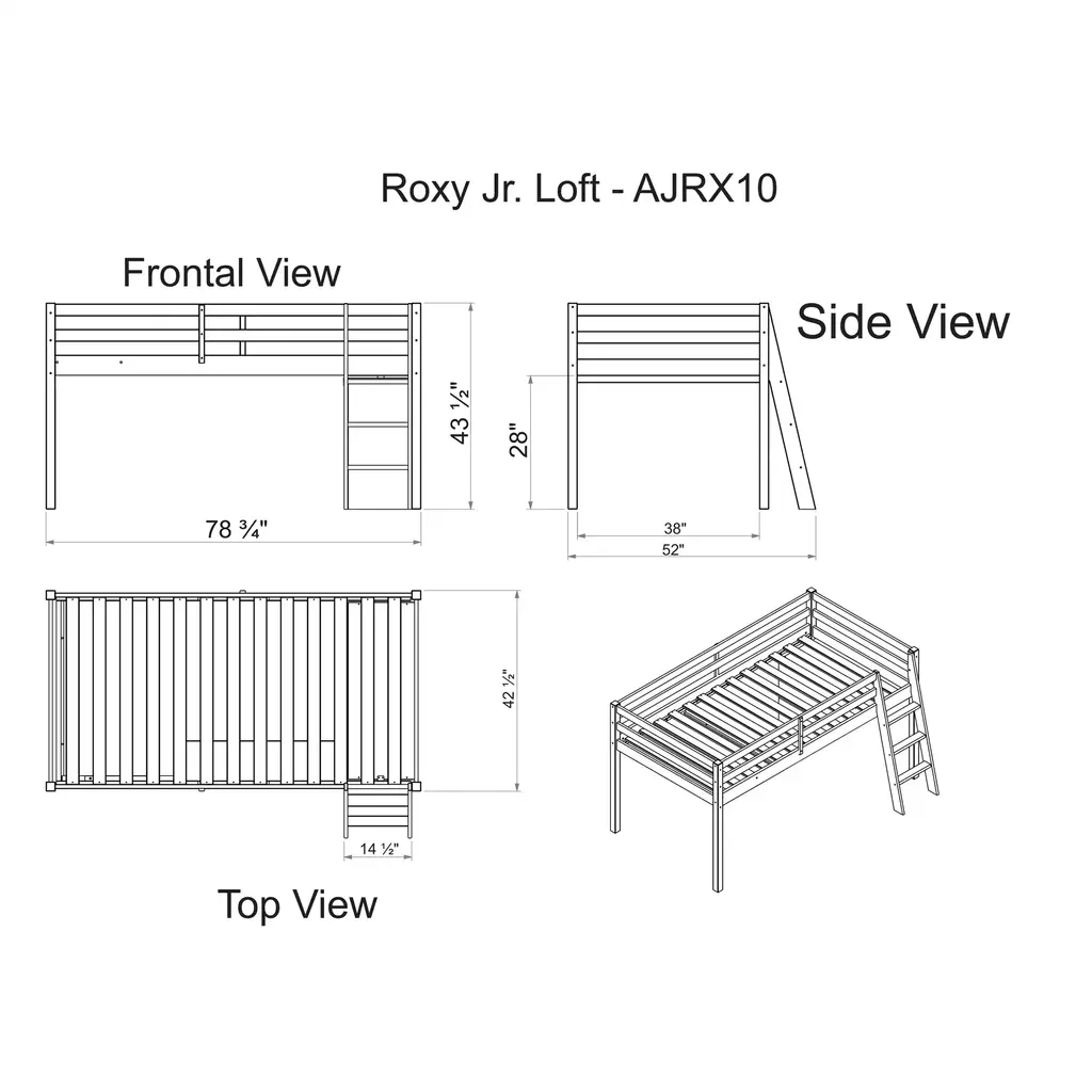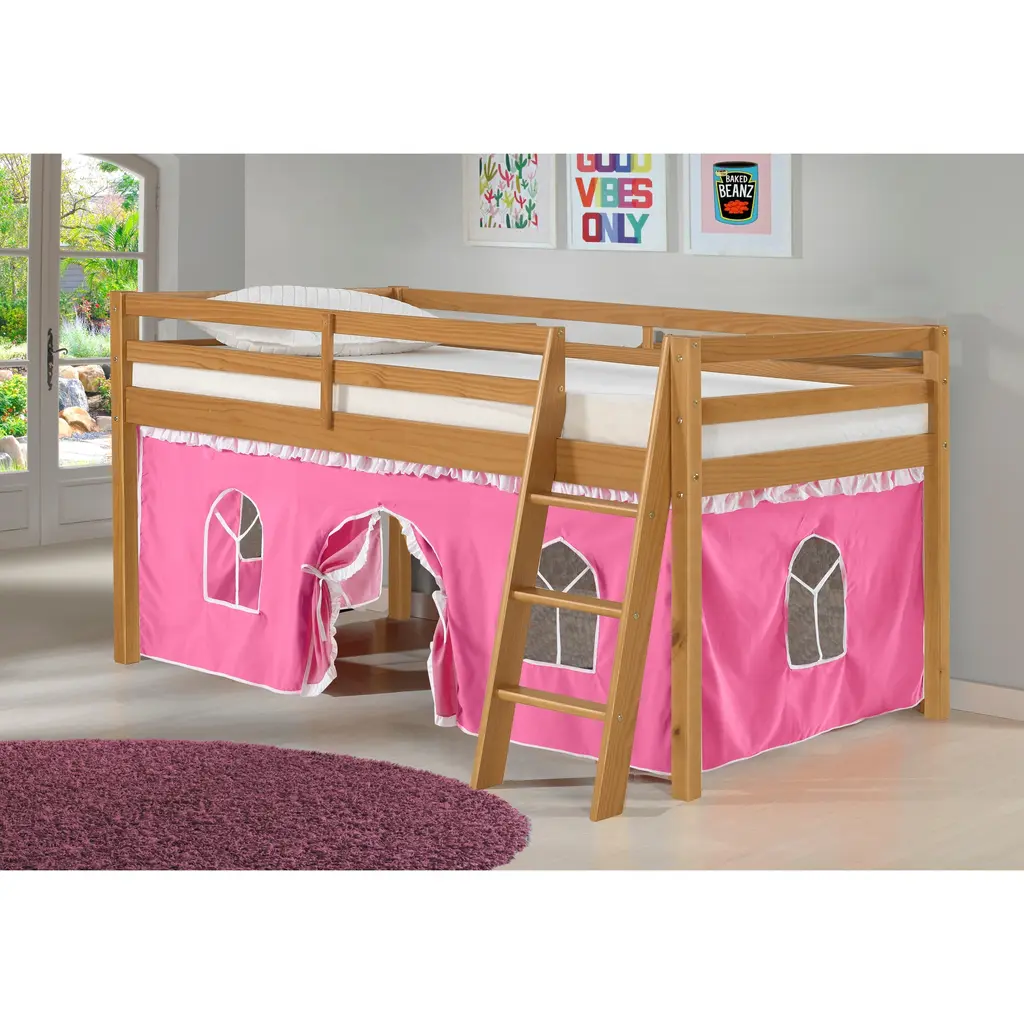The Roxy Twin Junior Loft Solid Wood Bed with Playhouse Tent will ignite your child's imagination as they play, sleep, and dream in their very own playhouse. With safety guardrails on all sides, this bed is perfect for your child's bedroom. The included ladder can be assembled on either side for added convenience. The tent is removable and machine washable, making maintenance a breeze.Features:Dimensions: