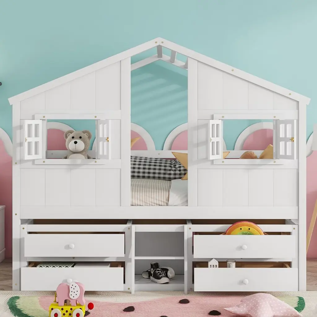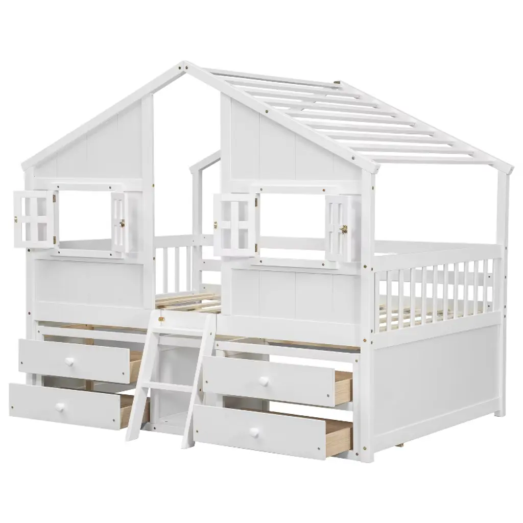 Sapphtopaz Full Size House Loft Bed With Roof&windows,wood Bed With Ladder&guardrail,kids Bed Frame With 4 Storage Drawer For Boys&girls,nursery,white