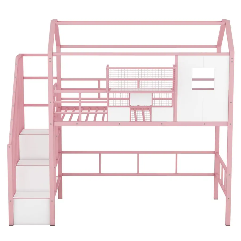 Sapphtopaz Twin Size Loft Bed With Roof & Window Metal Kids Bed Frame With Guardrail & Stairs,space-saving Loft Bed With Storage Box For Kids,pink