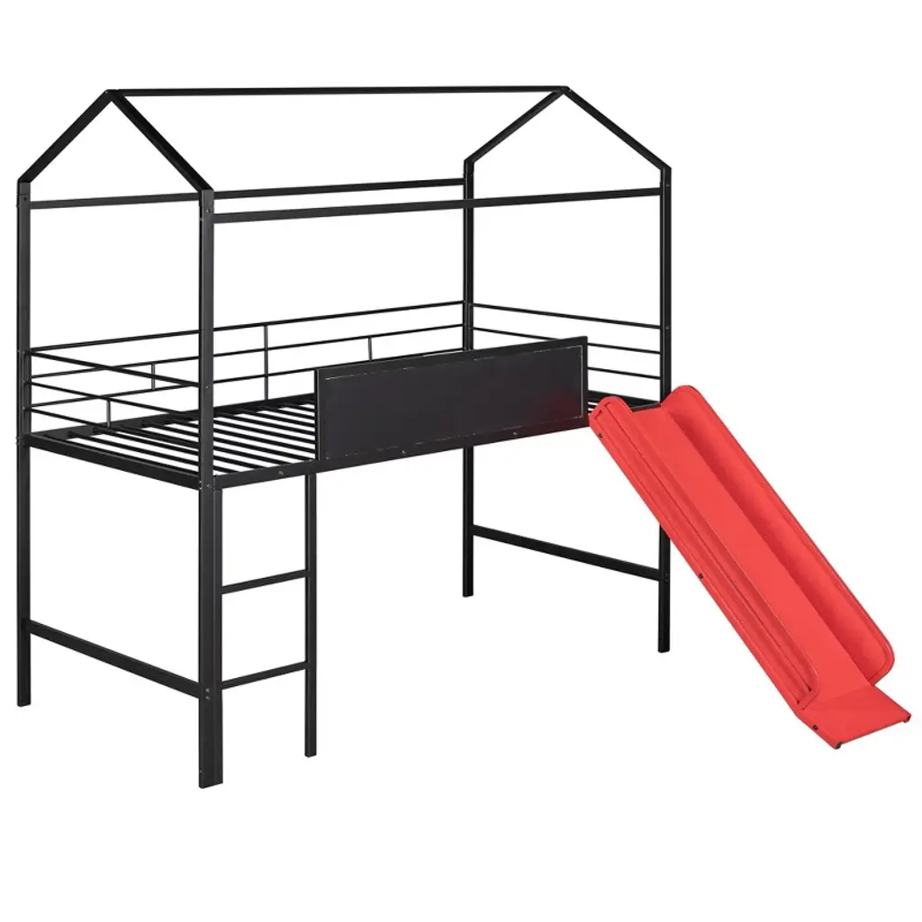 Sapphtopaz Twin Size Metal Loft Bed With Slide,house Bed With Guardrail&ladder,space-saving Kids Bed Frame With Writableboard For Boys&girls,black/red