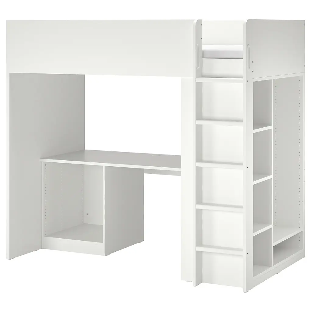 SMÅSTAD Loft bed frame, desk and storage - white Twin. With this loft bed you get a complete solution for your child’s room – including desk, wardrobe and open shelf unit. You can assemble the desk parallel or perpendicula with the bed. Min. ceiling height required: 94½". Bed base included.