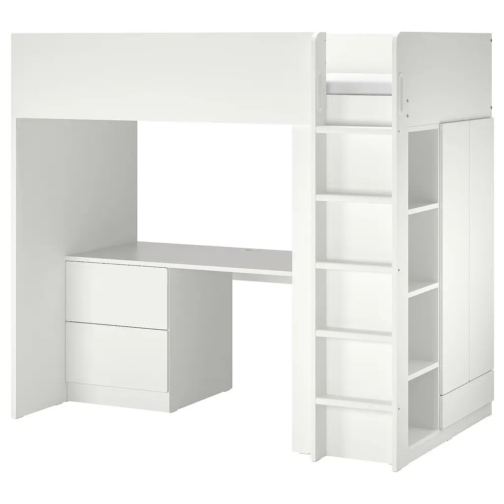 SMÅSTAD Loft bed - white white/with desk with 3 drawers Twin. Having your own space is important when growing up. This combination is just the remedy when living in small spaces or sharing rooms with siblings. The ladder mounts on the right or the left side of the bed. Mattress is sold separately.