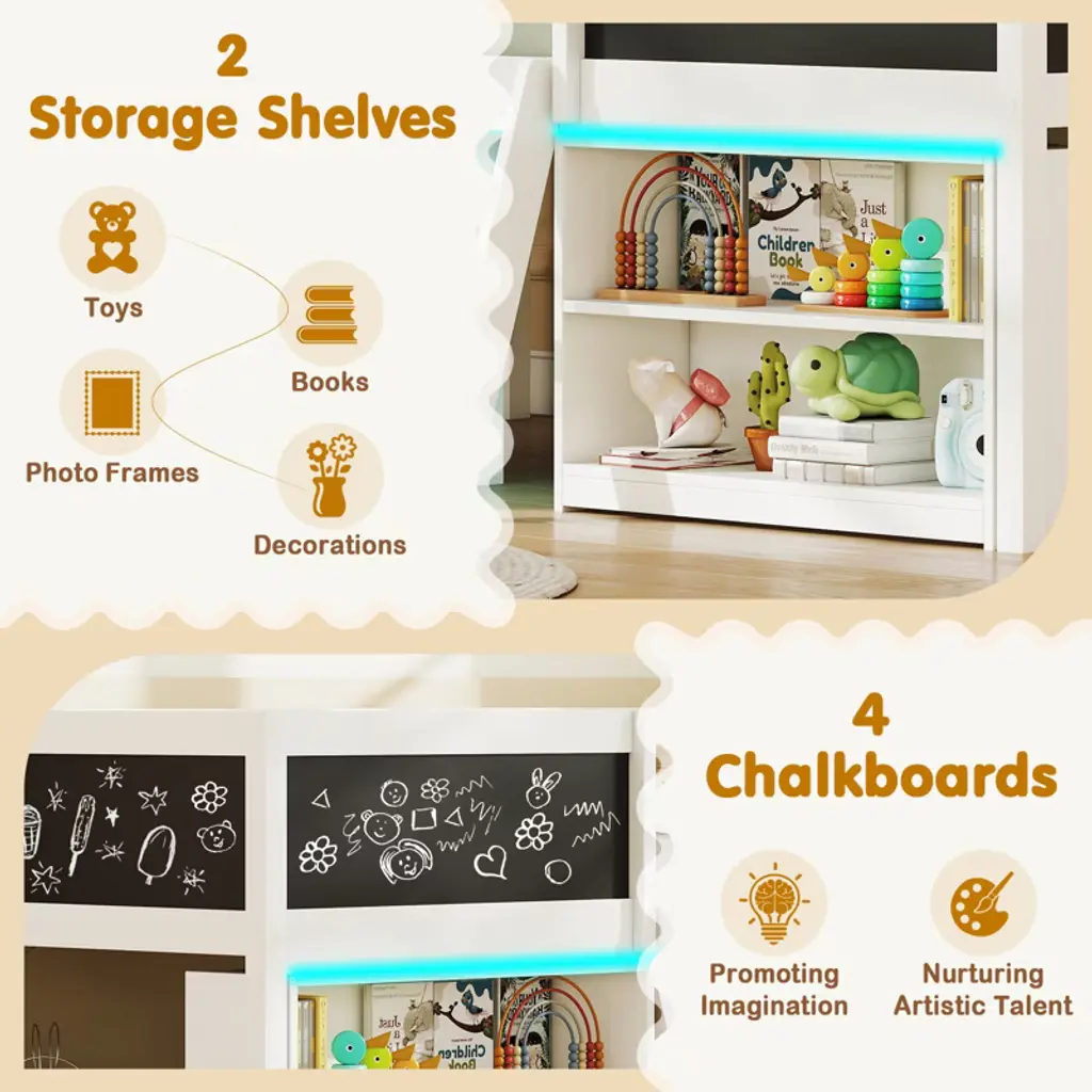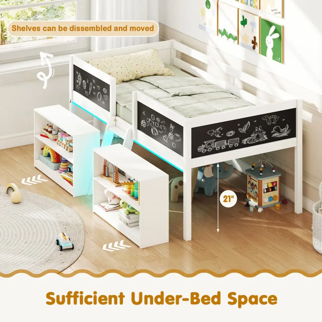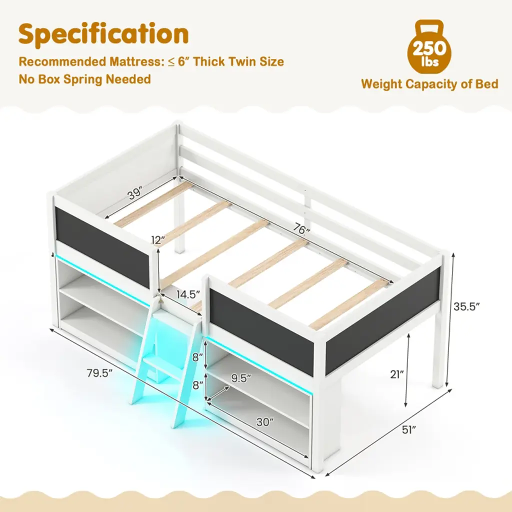 Transform your child's room into a magical haven of fun and creativity with our LED low loft bed! Watch as 20 vibrant LED colors dance in 22 preset modes, controlled easily via a remote - an enchanting light show every night! Nurture your child's artistic and intellectual sides with the 2 movable bookcases and 4 chalkboards. Crafted from solid wood with sturdy slats, this loft bed holds up to 250 lbs, ensuring years of safe, comfortable sleep. The integrated high guardrails and gentle step ladder enhance safety with stylish ease. Ideal for compact spaces, this bed also provides ample storage beneath to keep clutter at bay. Create the superior creative retreat for your little one!FeaturesAmazing light show with adjustable LED light in 20 colors and 22 modes Remote control for customized settings with adjustable speed and brightness 4 Chalkboards for promoting imagination and nurturing artistic talentSpecifications:Color: Grey / White Material: Solid Wood, Plywood, MDF, Engineered Wood Overall Dimensions: 79.5" x 51" x 35.5" (L x W x H) Bed Platform Size: 76" x 39" (L x W) Bed Entrance Size: 14.5" x 12" (W x H) Under-bed Space Height: 21" Storage Shelf Size: 30" x 9.5" x 8"(W x D x H) Recommended Mattress: ≤6" Thick Twin Size Weight Capacity of Bed: 250 lbs Weight Capacity of Shelf: 50 lbs Net Weight: 101.5 lbs Package Includes: 1 x Cabin Bed 1 x User Manual