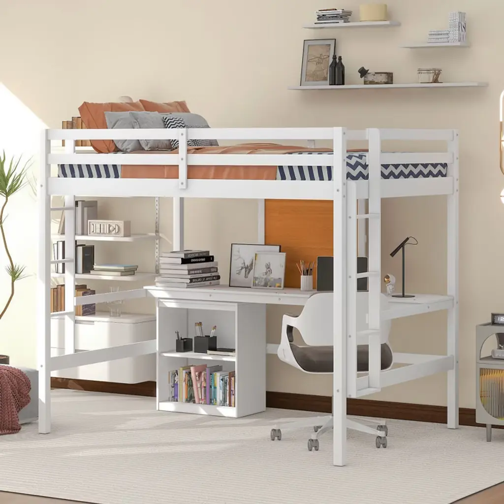 This modern bunk bed features a strong metal frame with full-length guardrails, an integrated ladder, and 21 secured slats for safety and stability. It includes two built-in ladders, a large desk, and triangular shelves underneath. The 58.3-inch clearance offers extra space for a workstation or study area. No box spring needed, mattress sold separately. Perfect for children's rooms.