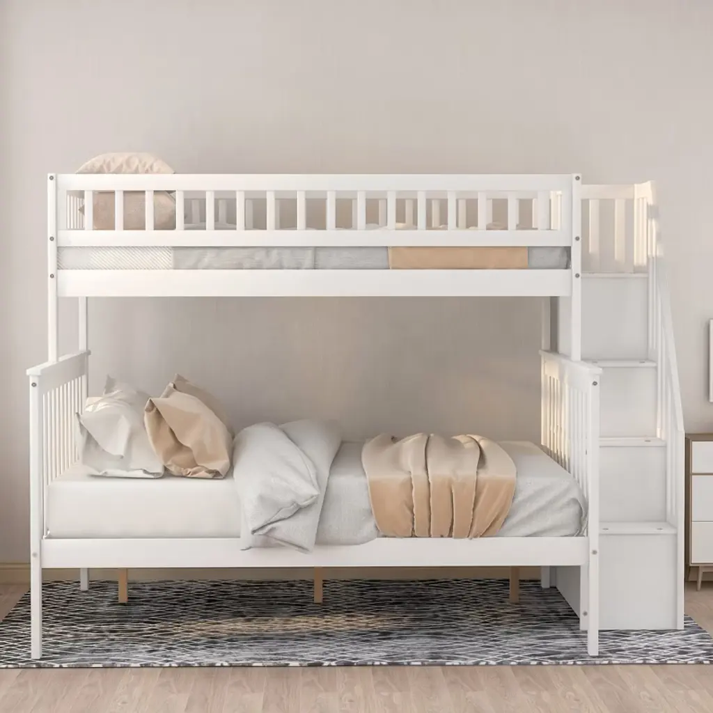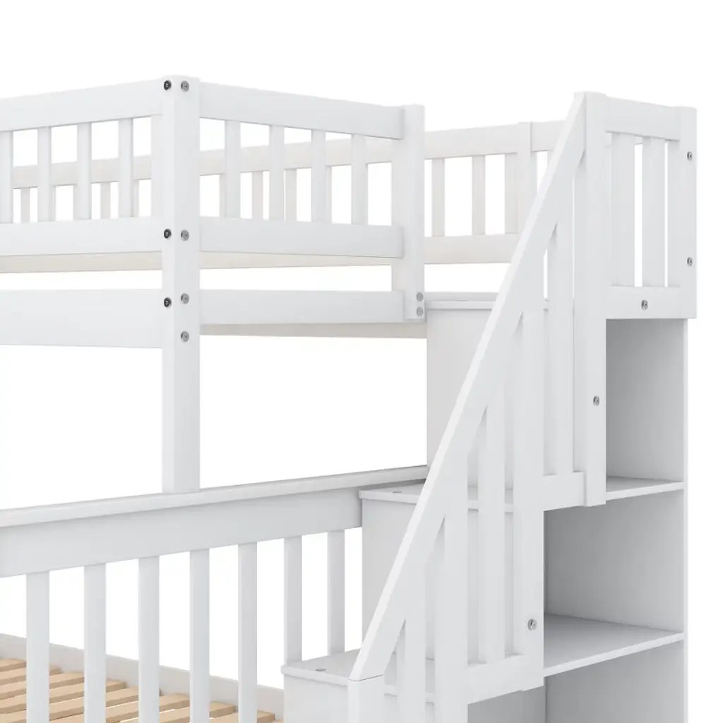 Twin Over Full Loft Bed With Stairs, Solid Wood Stairway Bunk Bed With Storage And Guard Rail For Kids Teens Adults, White