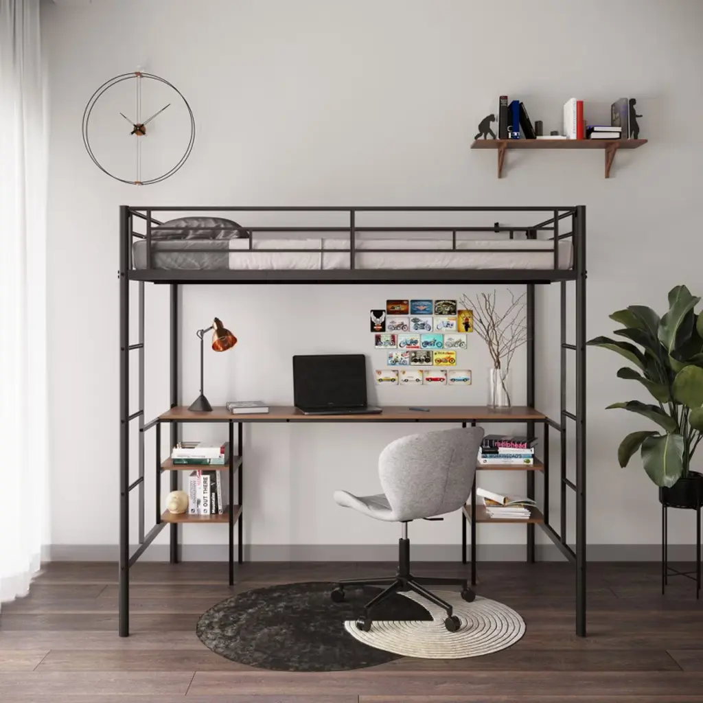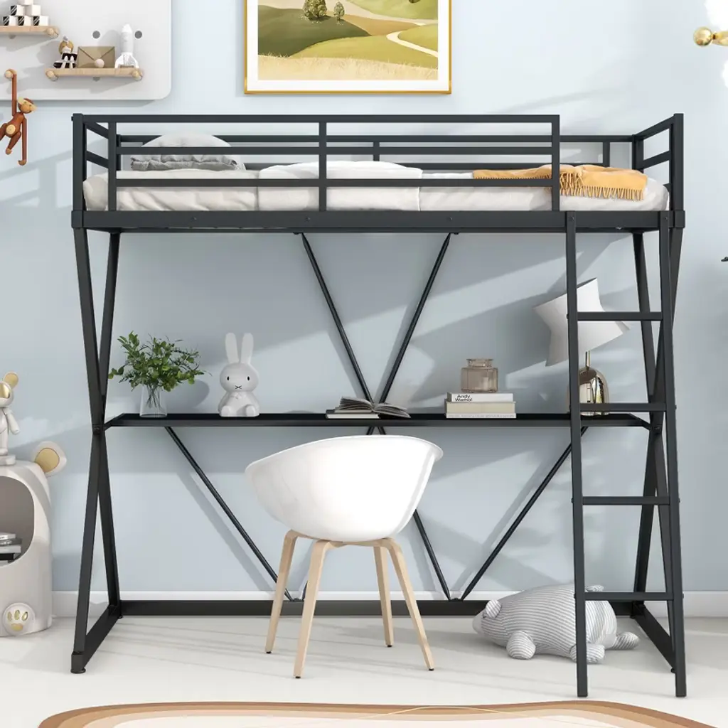 Product Features Solid construction: Made by strong and sturdy metal provides durability and stability. The metal slats support the mattresses not to slide and increase the mattresses life.Safety guaranteed: Surrounded with full length guard rails for top bunk gives extra safety. Built-in ladders on each side let you reach upper bunk easily and safely. More than that, this bunk bed has passed several Children's Product Certificate (CPC) tests and keep your kids away from accidentally harm.Space saving: This loft bed with table is designed for rooms with limited floor space. Built-in desk beneath the bed provides a study area or a workstation. Shelves on each side create extra storage space.Noise Reduced: With the design of EVA center support beam and slat lockers, we have significantly reduced squeak noise that metal beds usually have in common. You will have a good and quiet sleep from now on.Fast assembly: Each order comes with a clear and detailed assembly instruction guide and all necessary tools are provided to get your bed assembled in no time.Mattresses are not included. Descriptions Experience efficient space utilization as you create a dedicated study haven, surrounded by convenient storage shelves for books and essentials. But that's not all – we've taken care of every detail. Our loft bed boasts EVA on supporting beams, ensuring noise reduction for undisrupted focus. The added slat lockers further enhance the quietness of your environment. Embrace versatility, organization, and peace of mind, all in one stylish package. Make the most of your space with our exceptional loft bed design today. Built-in Table & Shelves for Extra Storage Space This all-in-one design combines sleeping, studying, and storage, making it an ideal choice for kids, teens, or adults seeking a versatile and space-efficient solution. Solid and Stable Structure The combination of metal slats and supporting beam creates a foundation of unparalleled solidity and stability night after night. The EVA sticker on the center beam minimizes noise, ensuring a quiet and peaceful environment for better sleep and concentration. Anti-Noise Slat Lockers Minimizing noise and vibrations, the slat locker reinforces the bed's overall stability, ensuring a secure and safe foundation for a comfortable night's sleep. Weight & Dimensions Overall Product Dimension: 78.11"L x 41.42"W x 71.65"HDetail Product Dimension: Please refer to the size imageNumber of Package: 1Package Dimension: 78.74 "L x 16.54 "W x 6.69 "HOverall Product Weight: 100.91 LBSPackage Weight: 109.72 LBSWeight Capacity: Bed: 250 LBS; Table: 80 LBS; Shelf: 10 LBSRecommended Mattress Thickness: 6" - 8" Specifications Product Type: Loft Bed with TableSize: TwinMaterial: STEELBox Spring Required: NoNumber of Slats: Bed: 21Assembly Required: YesNote: Manual measurement has been used, there may be some reasonable error. All the pictures are taken by actual samples, slight chromatic aberration may occur due to lighting or display.