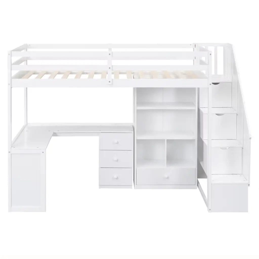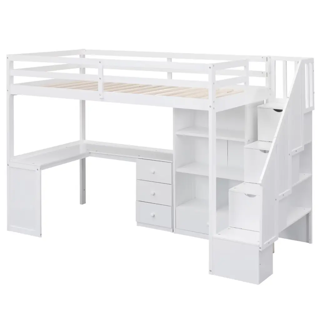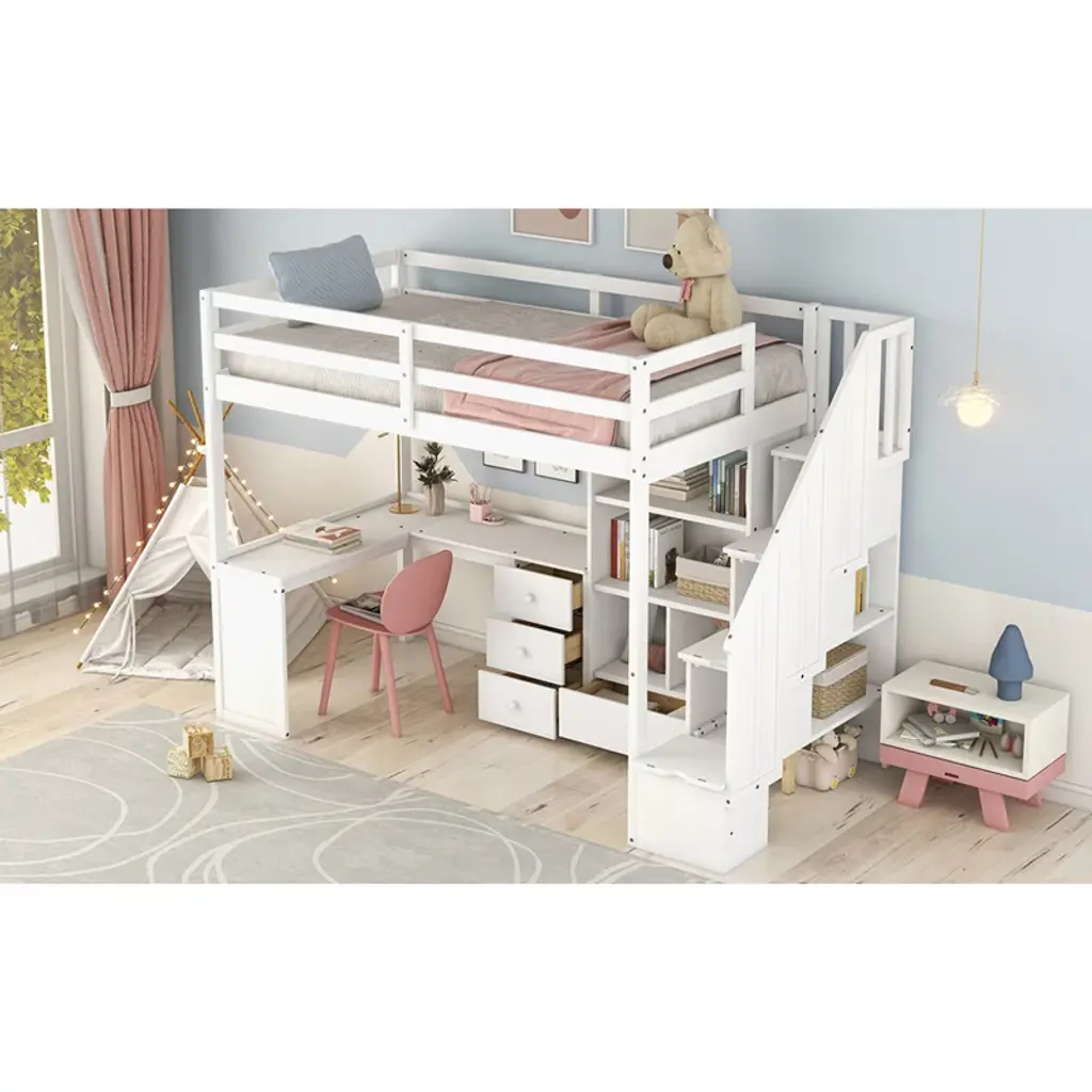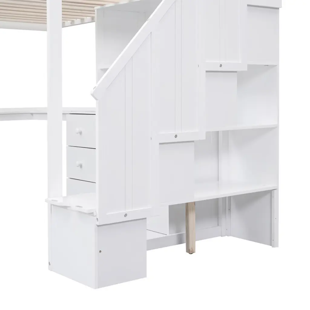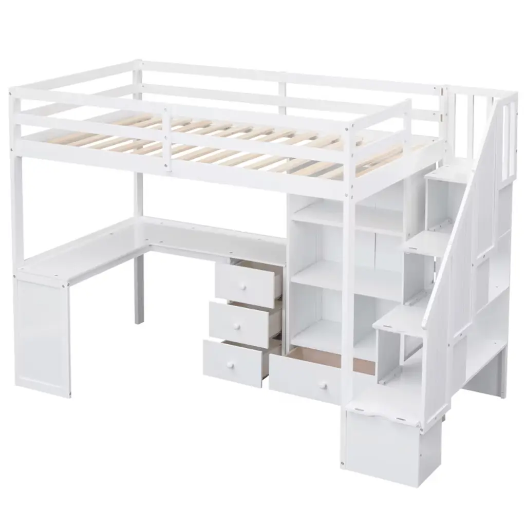 Product Features Space Saving The ultimate in a space-saving design, the loft bed with desk, drawers, cabinet and staircase replaces a room of furniture within the footprint of a standard twin bed.Large Storage Space The attached staircase not only can be used as a staircase, but also as a 3-tier storage space. And the cabinet under the bed can also place a lot of items, coupled with the design of the storage drawer, so that this bed has a large storage space.L-Shaped Desk This loft bed with a L-Shaped desk which includes three drawers and an open storage cabinet for using as a working area.Sturdy and Durable Crafted with high quality pine wood and MDF, this bed is sturdy and solid. Closely connected solid wood slats provide stable support.No Box Spring Required The wood slats support the mattresses not to slide and increase the service life. Description This loft bed offers exceptional solid wood construction and includes a L-shaped desk with drawers and a storage cabinet. The staircase contains three storage shelves, and the stairway itself offers safe and comfortable climbing. And you can choose to place the staircase on the left or right. This is an all-in-one loft bed with three drawers under the desk and an open storage cabinet. Multi-storage function to meet your space-saving design needs. Description Material: Pine wood+MDFSize: TwinNumbers of Package: 3Spring Box: No needAssembly Required: Yes Dimensions Overall Product Dimension: 93.3''L x 42.4''W x 65.8''HPackage Dimension: Please refer to the SpecificationBed Dimension: 76'' x 39.5''Total Height: 65.8''Number of Bed Slats: 14pcsOverall Product Weight: 248.5lbBed Weight Capability: 400lbRecommend Mattress Thickness of Bed: 6''