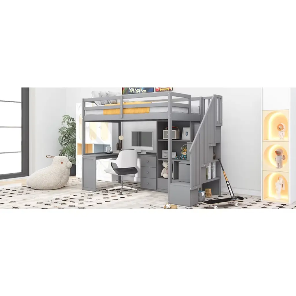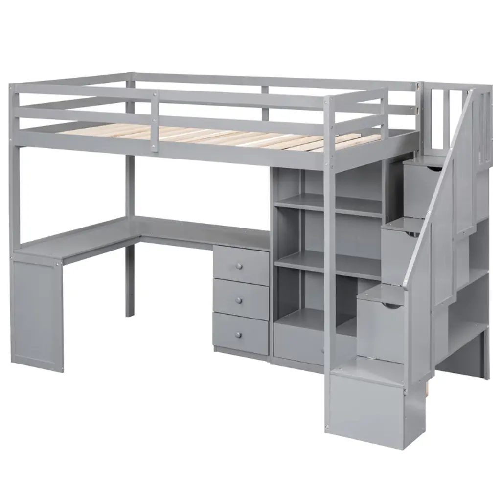 Product Features Space Saving The ultimate in a space-saving design, the loft bed with desk, drawers, cabinet and staircase replaces a room of furniture within the footprint of a standard twin bed.Large Storage Space The attached staircase not only can be used as a staircase, but also as a 3-tier storage space. And the cabinet under the bed can also place a lot of items, coupled with the design of the storage drawer, so that this bed has a large storage space.L-Shaped Desk This loft bed with a L-Shaped desk which includes three drawers and an open storage cabinet for using as a working area.Sturdy and Durable Crafted with high quality pine wood and MDF, this bed is sturdy and solid. Closely connected solid wood slats provide stable support.No Box Spring Required The wood slats support the mattresses not to slide and increase the service life. Description This loft bed offers exceptional solid wood construction and includes a L-shaped desk with drawers and a storage cabinet. The staircase contains three storage shelves, and the stairway itself offers safe and comfortable climbing. And you can choose to place the staircase on the left or right. This is an all-in-one loft bed with three drawers under the desk and an open storage cabinet. Multi-storage function to meet your space-saving design needs. Description Material: Pine wood+MDFSize: TwinNumbers of Package: 3Spring Box: No needAssembly Required: Yes Dimensions Overall Product Dimension: 93.3''L x 42.4''W x 65.8''HPackage Dimension: Please refer to the SpecificationBed Dimension: 76'' x 39.5''Total Height: 65.8''Number of Bed Slats: 14pcsOverall Product Weight: 248.5lbBed Weight Capability: 400lbRecommend Mattress Thickness of Bed: 6''