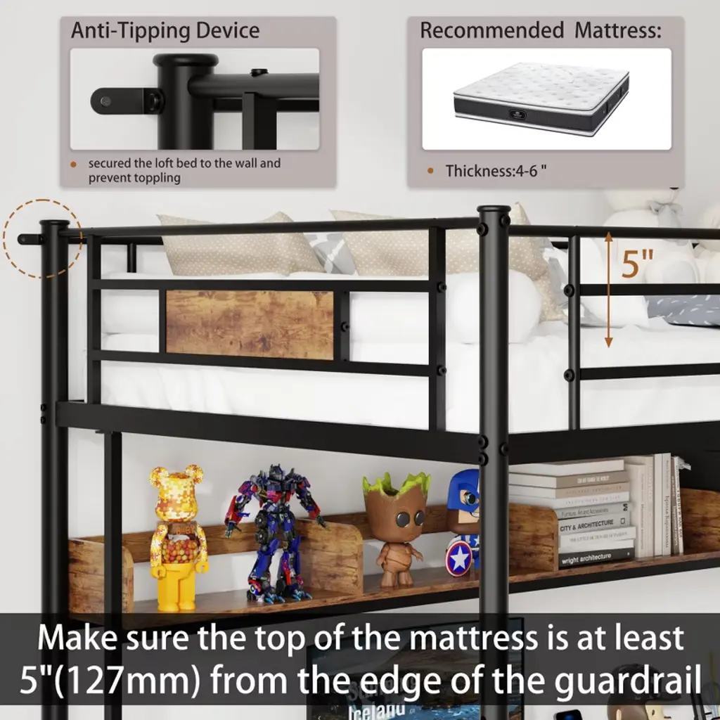 Product Features Loft Bed with L-Shaped Desk and Shelves: This twin loft bed includes an L-shaped desk and 3 drawers. The under-bed clearance allows you to transform the space into a clever workstation, a reading nook, or a craft area. The large desk and shelves are made of thickened MDF board, which provides better weight capacity.Safety Guaranteed: The top bed is surrounded by full-length raised guardrails, which prevent falling while tossing and turning. Additionally, anti-tilting nails securely fasten the bed to the wall for added safety, creating and maintaining a safe space for you.Innovative Structure, Heavy Duty Metal: Constructed with 12 stronger square heavy-duty metal slats. In terms of structure, square slats are more durable and solid than round ones. There’s no need to worry about the frame breaking—its maximum bearing capacity can reach 400 lbs.Ample Storage Space: Comes with 3 fabric drawers (ideal for storing books, decorations, or other items), providing abundant under-bed storage space. The storage shelf under the desk can also be used as a CPU stand.