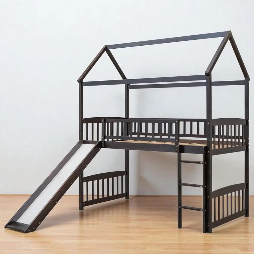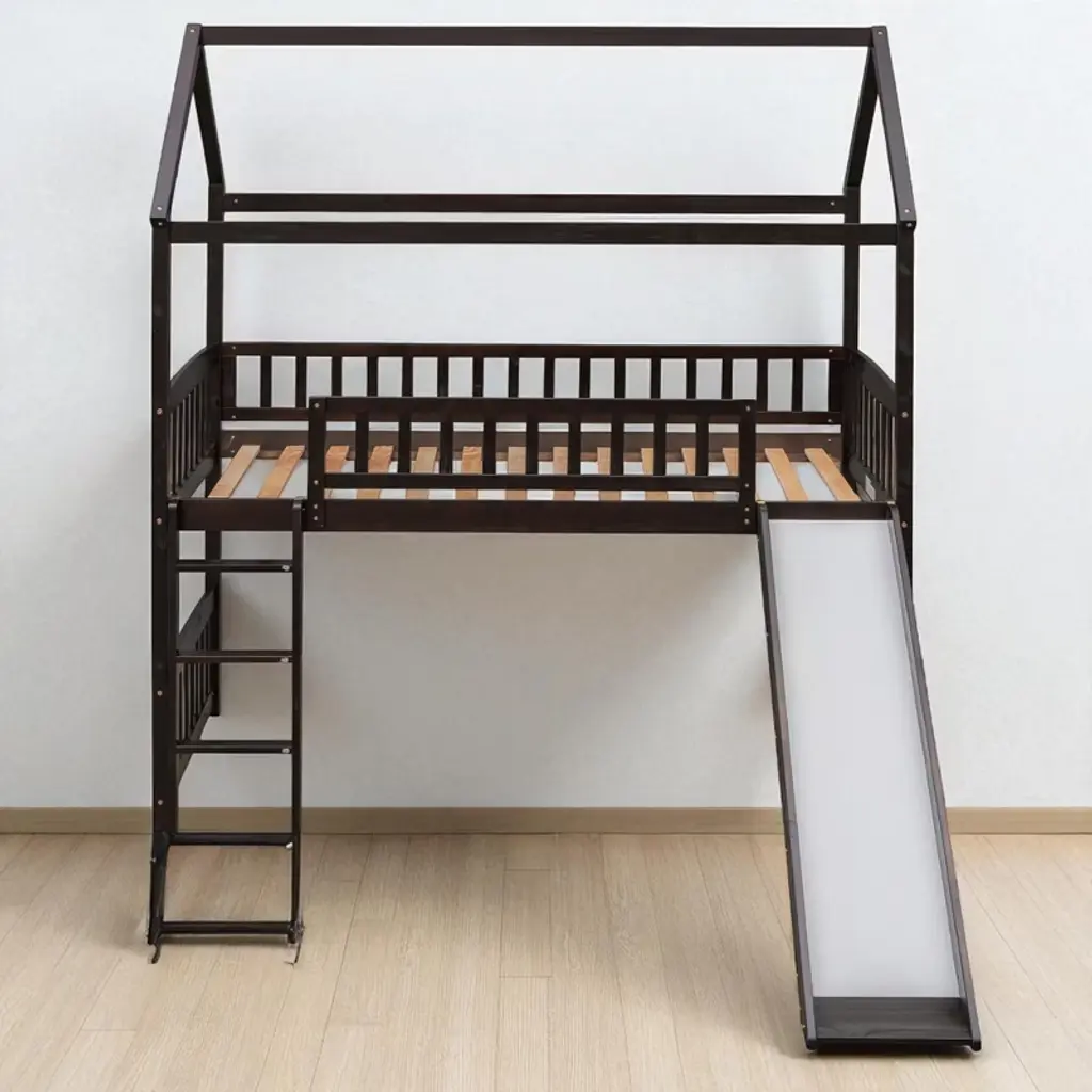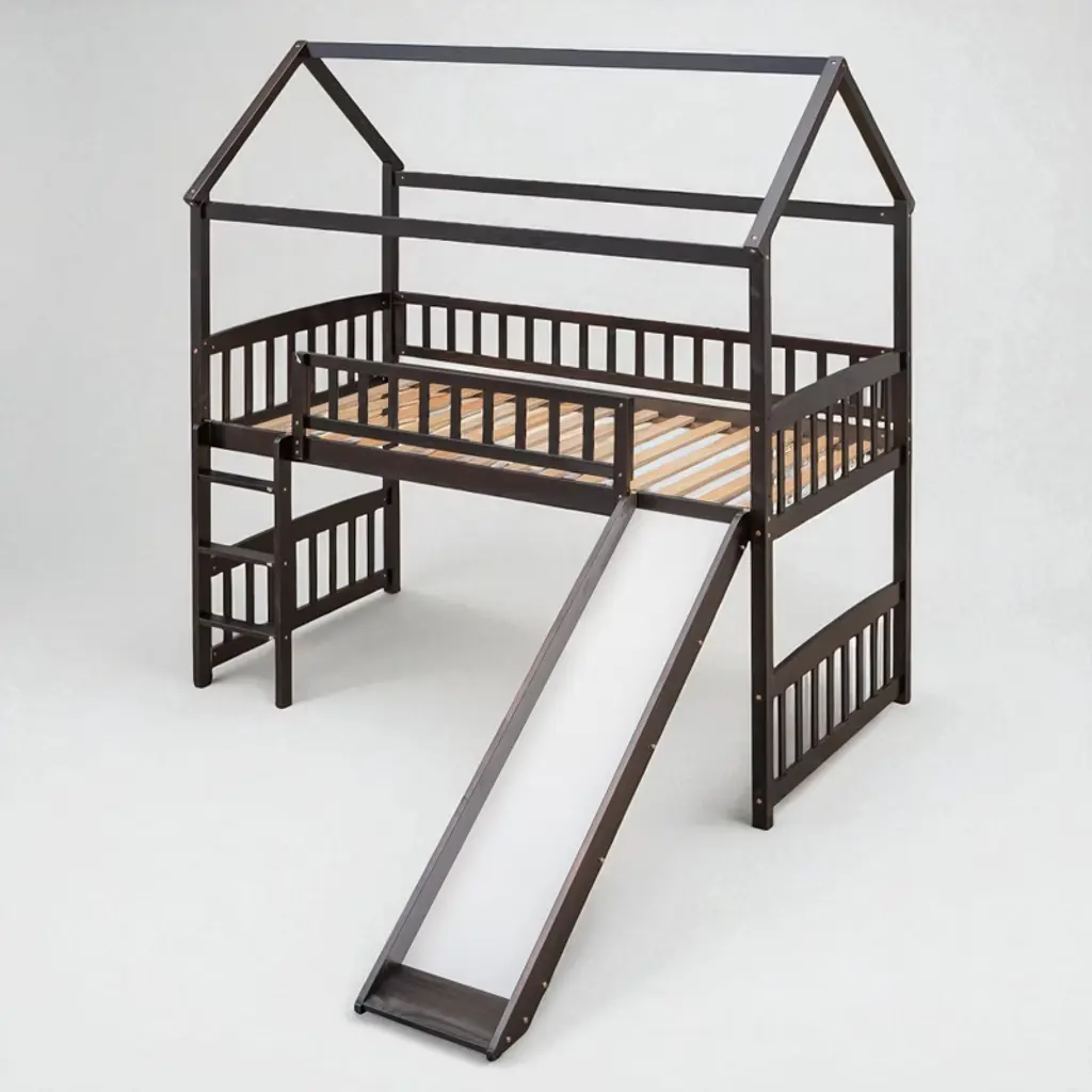 Product Overview Make bedtime exciting and fun with this twin-size loft bed featuring a built-in slide and whimsical playhouse design. Perfectly combining entertainment and functionality, this bed offers a spacious area underneath for play or storage, making it a smart space-saving solution for any child’s bedroom. Crafted from high-quality pinewood, MDF, and plywood, the sturdy construction ensures safety and stability for long-term use. The clean silhouette and charming finish make this loft bed a centerpiece in any decor style. Product Features Maximized Space Saving: Designed to make the most of vertical space, the elevated bed frame frees up the area underneath, offering an open play zone, reading nook, or storage space for toys and essentials.Whimsical Playhouse Design: This creative bed features a fun slide and playhouse-like structure that encourages imaginative play. It’s the ideal balance of fun and comfort, providing your child with a unique and engaging bedroom centerpiece.Safety First Construction: Built from solid pine wood and MDF, reinforced with iron alloy bolts, this bed frame offers excellent durability and stability. The high guardrails on all sides of the upper bunk and a sturdy ladder ensure your child’s safety during sleep and play.No Box Spring Needed: With a strong plywood slat kit included, the bed supports a standard twin-size mattress without the need for a box spring, offering direct mattress placement with enhanced airflow and support.Elegant and Modern: Designed with a clean silhouette and timeless color options—white, gray, or espresso—this bed blends effortlessly into a wide range of decor themes, from playful to minimalist. Specifications Product Type: Loft Bed with SlideSize: TwinOverall Dimensions: 79.5""L x 41.8""W x 94""HMaterial: Pinewood + MDF + PlywoodSlat Material: PlywoodColor Options: White / Gray / EspressoNumber of Slats: 14Recommended Mattress Thickness: 4-6""Box Spring Required: NoMattress Included: NoAssembly Required: Yes (Estimated time: 40 minutes with 2 people)Tools Required: All tools included (avoid power tools)Country of Origin: Vietnam Suitable Scenarios Ideal for kids' bedrooms, shared rooms, or smaller living spaces where vertical space optimization is essential. Great for children aged 6 and older who love to play, climb, and slide—perfect for encouraging creativity and active fun indoors. Notes This product comes in 2 separate packages. Mattress not included. Manual measurement has been used—please allow for slight variations. Product images are taken from actual samples; slight color differences may occur due to lighting or monitor settings.