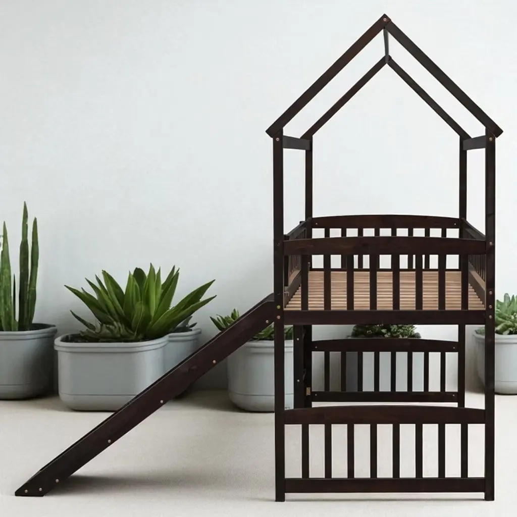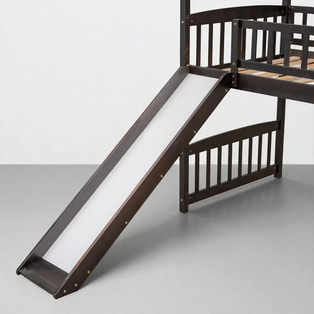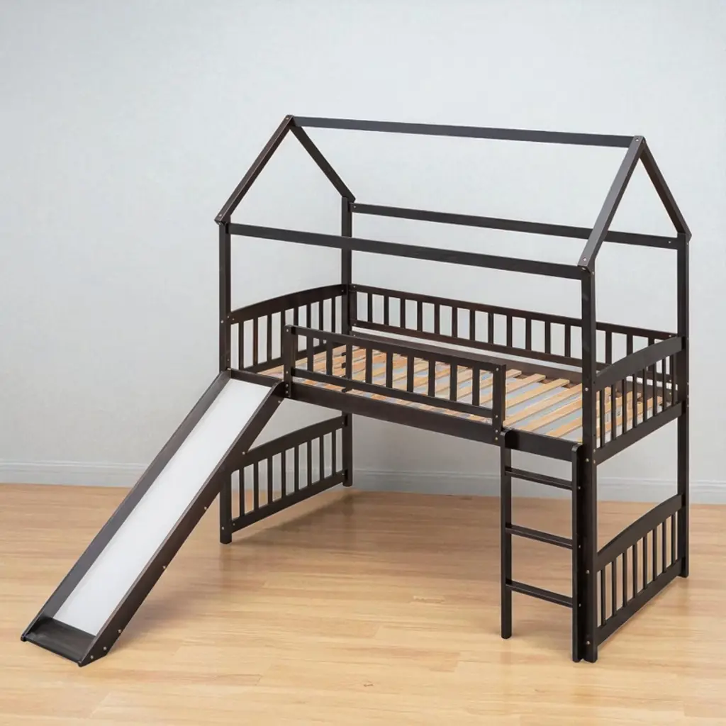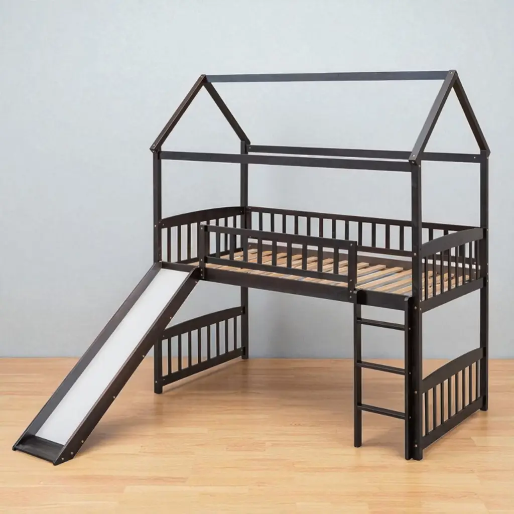 Product Overview Make bedtime exciting and fun with this twin-size loft bed featuring a built-in slide and whimsical playhouse design. Perfectly combining entertainment and functionality, this bed offers a spacious area underneath for play or storage, making it a smart space-saving solution for any child’s bedroom. Crafted from high-quality pinewood, MDF, and plywood, the sturdy construction ensures safety and stability for long-term use. The clean silhouette and charming finish make this loft bed a centerpiece in any decor style. Product Features Maximized Space Saving: Designed to make the most of vertical space, the elevated bed frame frees up the area underneath, offering an open play zone, reading nook, or storage space for toys and essentials.Whimsical Playhouse Design: This creative bed features a fun slide and playhouse-like structure that encourages imaginative play. It’s the ideal balance of fun and comfort, providing your child with a unique and engaging bedroom centerpiece.Safety First Construction: Built from solid pine wood and MDF, reinforced with iron alloy bolts, this bed frame offers excellent durability and stability. The high guardrails on all sides of the upper bunk and a sturdy ladder ensure your child’s safety during sleep and play.No Box Spring Needed: With a strong plywood slat kit included, the bed supports a standard twin-size mattress without the need for a box spring, offering direct mattress placement with enhanced airflow and support.Elegant and Modern: Designed with a clean silhouette and timeless color options—white, gray, or espresso—this bed blends effortlessly into a wide range of decor themes, from playful to minimalist. Specifications Product Type: Loft Bed with SlideSize: TwinOverall Dimensions: 79.5""L x 41.8""W x 94""HMaterial: Pinewood + MDF + PlywoodSlat Material: PlywoodColor Options: White / Gray / EspressoNumber of Slats: 14Recommended Mattress Thickness: 4-6""Box Spring Required: NoMattress Included: NoAssembly Required: Yes (Estimated time: 40 minutes with 2 people)Tools Required: All tools included (avoid power tools)Country of Origin: Vietnam Suitable Scenarios Ideal for kids' bedrooms, shared rooms, or smaller living spaces where vertical space optimization is essential. Great for children aged 6 and older who love to play, climb, and slide—perfect for encouraging creativity and active fun indoors. Notes This product comes in 2 separate packages. Mattress not included. Manual measurement has been used—please allow for slight variations. Product images are taken from actual samples; slight color differences may occur due to lighting or monitor settings.