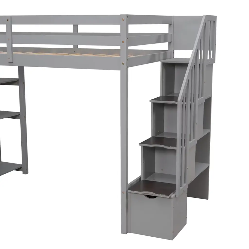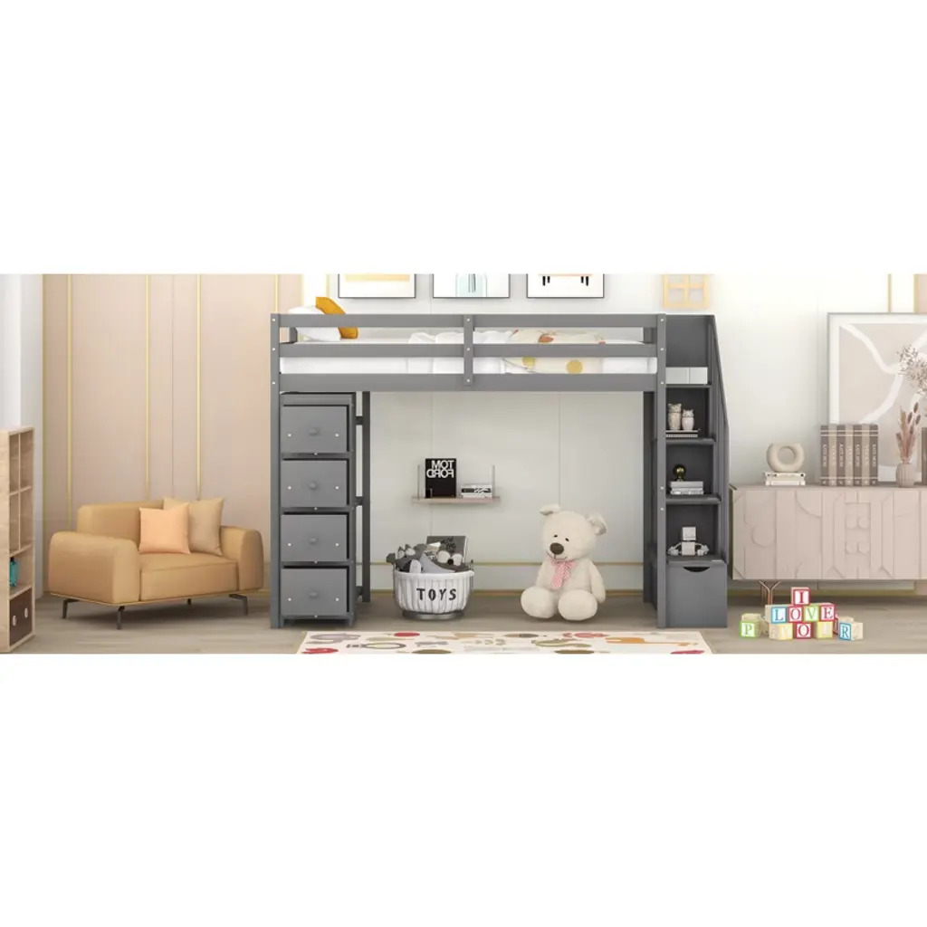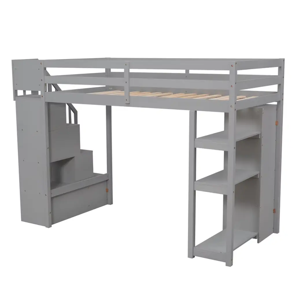 Product Features Maximized space – It takes advantage of the floor space, and allows for a cozy rest, extra work and play space, and makes a great piece of furniture for growing families. 4 storage drawers, as well as shelves and storage stairs, provide a lot of storage space.Multifunctional bed – The space under the twin size loft bed is a great place for you to read, do homework, or play, creating your own world of exploration. The storage space is strong, and the stairs protect the safety of children.Solid Construction – This multifunctional loft bed is crafted from a solid pine wood frame, with commercial grade MDF board for quality control and durability. Guardrails are solidly attached for added safety.Health and Comfort – No box spring required, and no need for a foundation. The wood frame is sturdy and comes with slats for extra support, ensuring air moves freely around your mattress to keep it fresh for years to come.Dimensions: 94.4"L x 41.8"W x 65"H. Mattress not included. Some assembly is required, although we have provided clear instructions and tools. Description If your family needs a functional bed, then this loft bed will be a good choice for you. It will save you space and maximize functionality with multiple functions. This is the perfect study area while also having room to store your belongings. Beds with full rails ensure your sleep is safe. You don't have to worry about its quality. The bed has an elegant design that will fit nicely into your bedroom. Weight & Dimensions Overall Product Dimension: 94.4"L x 41.8"W x 65"HDetail Product Dimension: Please refer to the Size imageNumber of Package: 3Package Dimension: Please refer to the SpecificationOverall Product Weight: 225 LBSPackage Weight: Please refer to the SpecificationWeight Capacity: 300LBSRecommended Mattress Thickness: 6"Recommended Age: > 6 years old Specifications Product Type: Loft BedSize: TwinProduct material: Plywood + MDF + PinewoodNumber of slats: 14Level of Assembly: Partial assemblyBox Spring Required: NoMattress Included: NoEstimated Time to Assemble: 60 minsSuggested Number of People: 2Additional Tools Required: All Tools IncludedAvoid power tools: Yes