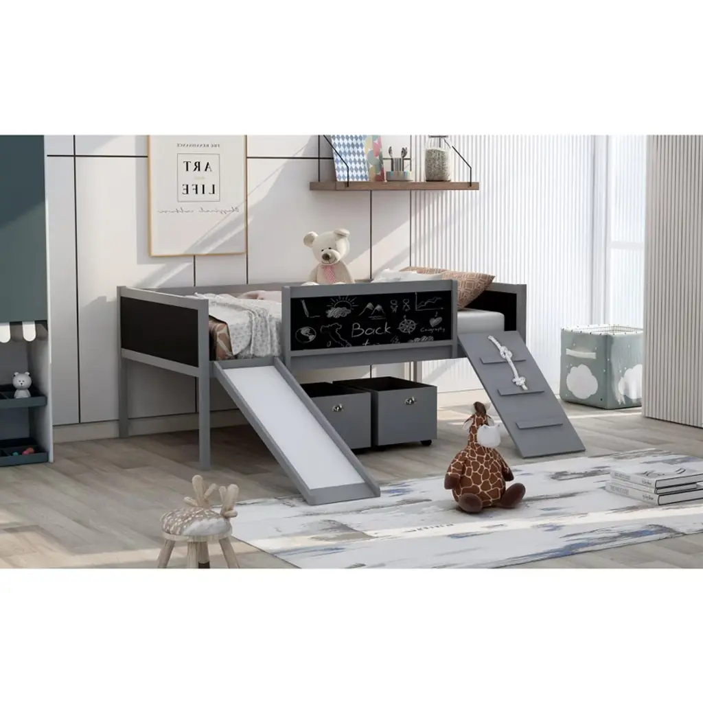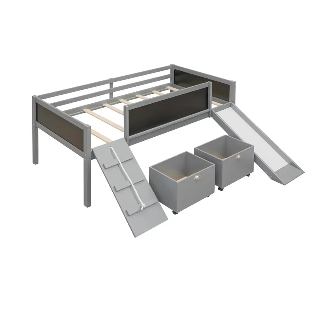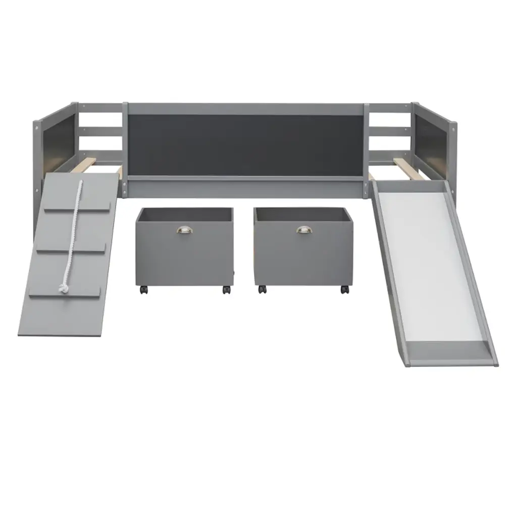 Product Features Climbing Frame & Rope – This loft bed comes with a few new elements: a climbing frame is used instead of a ladder, which adds interest to bedtime routines. A climbing rope is also included, allowing you to experience the joy of climbing every night before going to bed. The climbing experience can also help train physical coordination over time.Pine Wood Frame & Double-sided Chalkboard – This novel design loft bed is manufactured with a solid pine wood frame to guarantee stability and durability. Pine provides good elasticity, breathability, and acceptable heat conduction. Three sides of this loft bed are equipped with double-sided chalkboards, complete with a thoughtful chalk slot. Customers can always pick up chalk and write down their colorful dreams and imaginations through drawings and writing.Safety & Fun – After waking up, you can get out of bed in the quickest and happiest way every morning thanks to the built-in slide. The bottom plate of the slide is made from MDF with a smooth surface for a fun sliding experience. The wood slats and side rails of this loft bed are made of plywood. This slat design allows air to pass freely beneath the bed, keeping it cool and ensuring the mattress remains fresh and long-lasting.Additional Storage Boxes – Considering the need to store many daily items, two storage boxes are shipped with this functional loft bed to meet your storage needs. These two storage boxes are made of plywood and are open-top for easy access. They provide the perfect space for storing various tools and toys. The casters on the storage boxes can be locked in place to keep them securely positioned beneath the bed.Dimensions: Overall Product Dimension: 78.5" x 79.2" x 34" (L x W x H). Mattress not included. Some assembly is required, although we have provided clear instructions and tools. Description A novel idea was put into the design when manufacturing this marvelous loft bed — the traditional ladder has been replaced with a climbing frame, which appeals to most people even more. And the way to get out of bed? Sliding! This interesting design offers the chance to train physical coordination in daily life and bring more happiness into the bedroom. The double-sided chalkboards set on three sides allow you to use your imagination and creativity anytime, stimulating brain potential. Additional storage boxes are another shining aspect of the design, offering parents a practical and helpful solution. The open-design storage boxes are perfect for storing all sorts of toys and daily necessities. Four classic color options let you choose your favorite easily. Weight & Dimensions Overall Product Dimension: 78.5"L x 79.2"W x 34"HDetail Product Dimension: Please refer to the Size imageNumber of Package: 1Package Dimension: Please refer to the SpecificationOverall Product Weight: 107 LBSPackage Weight: Please refer to the SpecificationWeight Capacity: 175LBSRecommended Mattress Thickness: 6"Recommended Age: £¾ 6 years old Specifications Product Type: Loft BedSize: TwinProduct material: Plywood + MDF + Pine woodBed slat material: PlywoodLevel of Assembly: Partial assemblySplit into two beds: NoBox Spring Required: NoMattress Included: NoEstimated Time to Assemble: 30 minutesSuggested Number of People: 2Additional Tools Required: ScrewdriverAvoid power tools: YesNotes: Manual measurement has been used, there may be some reasonable error. All the pictures are taken by actual samples, slight chromatic aberration may occur due to lighting or display.