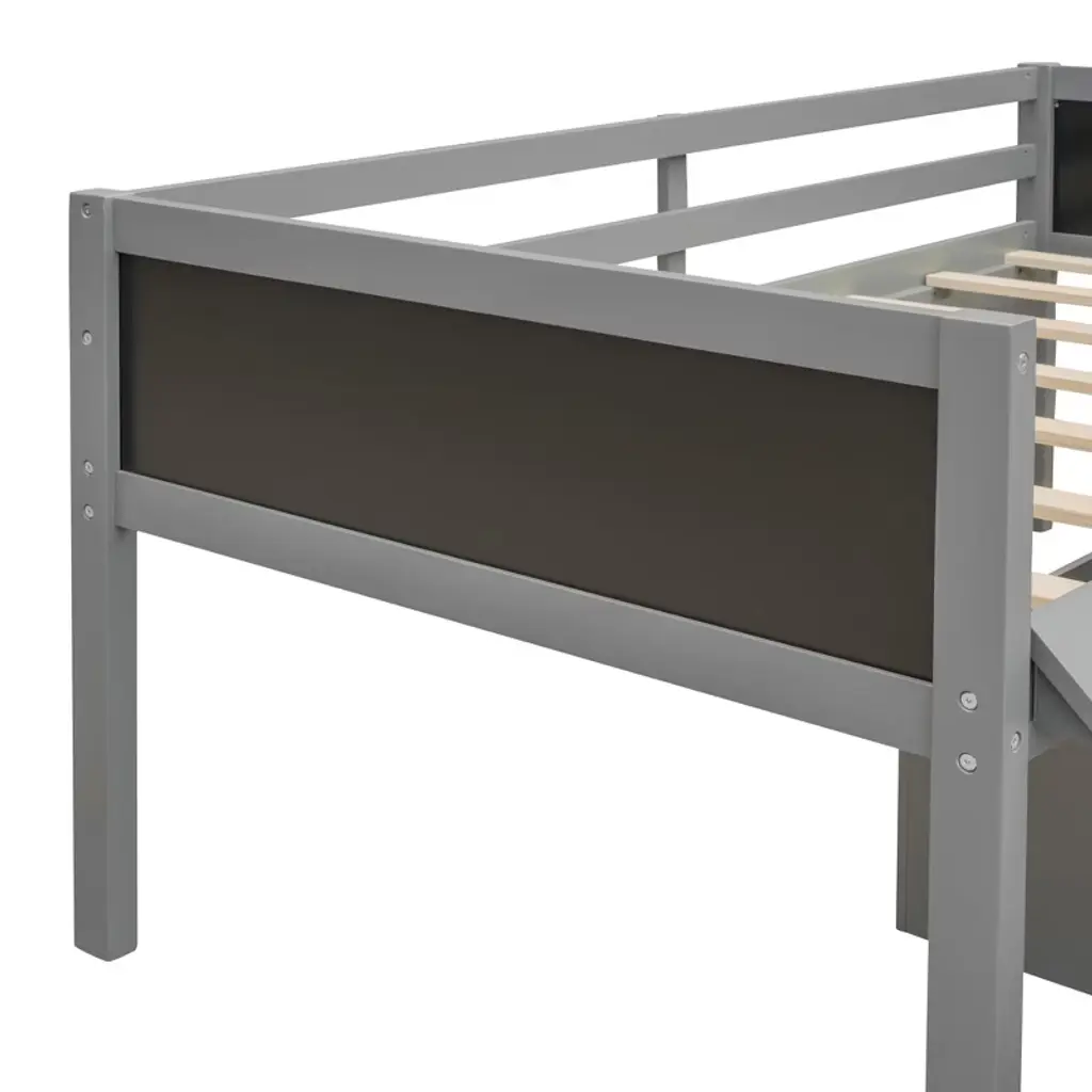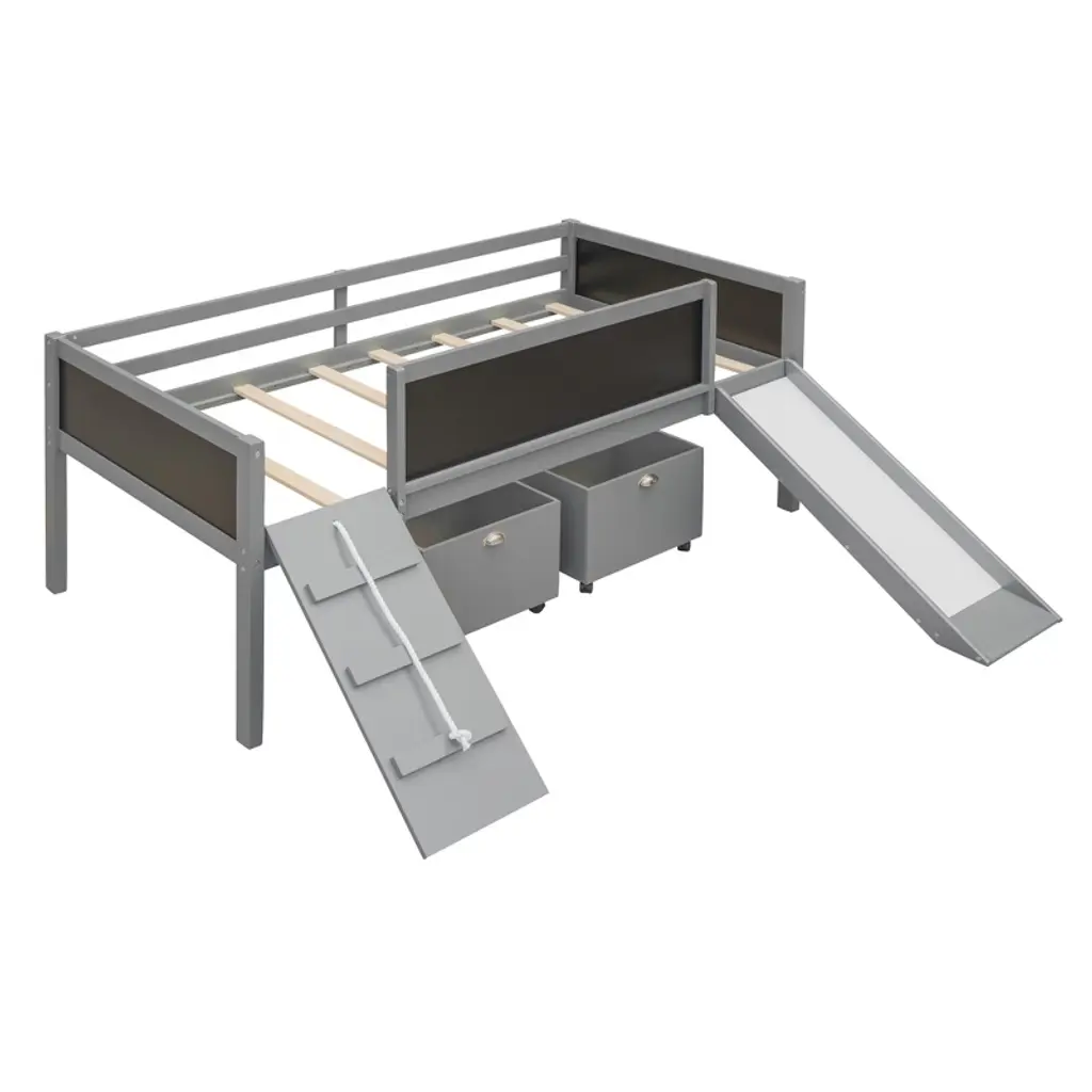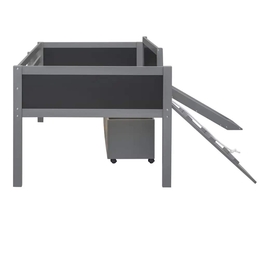 Product Features Climbing Frame & Rope – This loft bed comes with a few new elements: a climbing frame is used instead of a ladder, which adds interest to bedtime routines. A climbing rope is also included, allowing you to experience the joy of climbing every night before going to bed. The climbing experience can also help train physical coordination over time.Pine Wood Frame & Double-sided Chalkboard – This novel design loft bed is manufactured with a solid pine wood frame to guarantee stability and durability. Pine provides good elasticity, breathability, and acceptable heat conduction. Three sides of this loft bed are equipped with double-sided chalkboards, complete with a thoughtful chalk slot. Customers can always pick up chalk and write down their colorful dreams and imaginations through drawings and writing.Safety & Fun – After waking up, you can get out of bed in the quickest and happiest way every morning thanks to the built-in slide. The bottom plate of the slide is made from MDF with a smooth surface for a fun sliding experience. The wood slats and side rails of this loft bed are made of plywood. This slat design allows air to pass freely beneath the bed, keeping it cool and ensuring the mattress remains fresh and long-lasting.Additional Storage Boxes – Considering the need to store many daily items, two storage boxes are shipped with this functional loft bed to meet your storage needs. These two storage boxes are made of plywood and are open-top for easy access. They provide the perfect space for storing various tools and toys. The casters on the storage boxes can be locked in place to keep them securely positioned beneath the bed.Dimensions: Overall Product Dimension: 78.5" x 79.2" x 34" (L x W x H). Mattress not included. Some assembly is required, although we have provided clear instructions and tools. Description A novel idea was put into the design when manufacturing this marvelous loft bed — the traditional ladder has been replaced with a climbing frame, which appeals to most people even more. And the way to get out of bed? Sliding! This interesting design offers the chance to train physical coordination in daily life and bring more happiness into the bedroom. The double-sided chalkboards set on three sides allow you to use your imagination and creativity anytime, stimulating brain potential. Additional storage boxes are another shining aspect of the design, offering parents a practical and helpful solution. The open-design storage boxes are perfect for storing all sorts of toys and daily necessities. Four classic color options let you choose your favorite easily. Weight & Dimensions Overall Product Dimension: 78.5"L x 79.2"W x 34"HDetail Product Dimension: Please refer to the Size imageNumber of Package: 1Package Dimension: Please refer to the SpecificationOverall Product Weight: 107 LBSPackage Weight: Please refer to the SpecificationWeight Capacity: 175LBSRecommended Mattress Thickness: 6"Recommended Age: £¾ 6 years old Specifications Product Type: Loft BedSize: TwinProduct material: Plywood + MDF + Pine woodBed slat material: PlywoodLevel of Assembly: Partial assemblySplit into two beds: NoBox Spring Required: NoMattress Included: NoEstimated Time to Assemble: 30 minutesSuggested Number of People: 2Additional Tools Required: ScrewdriverAvoid power tools: YesNotes: Manual measurement has been used, there may be some reasonable error. All the pictures are taken by actual samples, slight chromatic aberration may occur due to lighting or display.