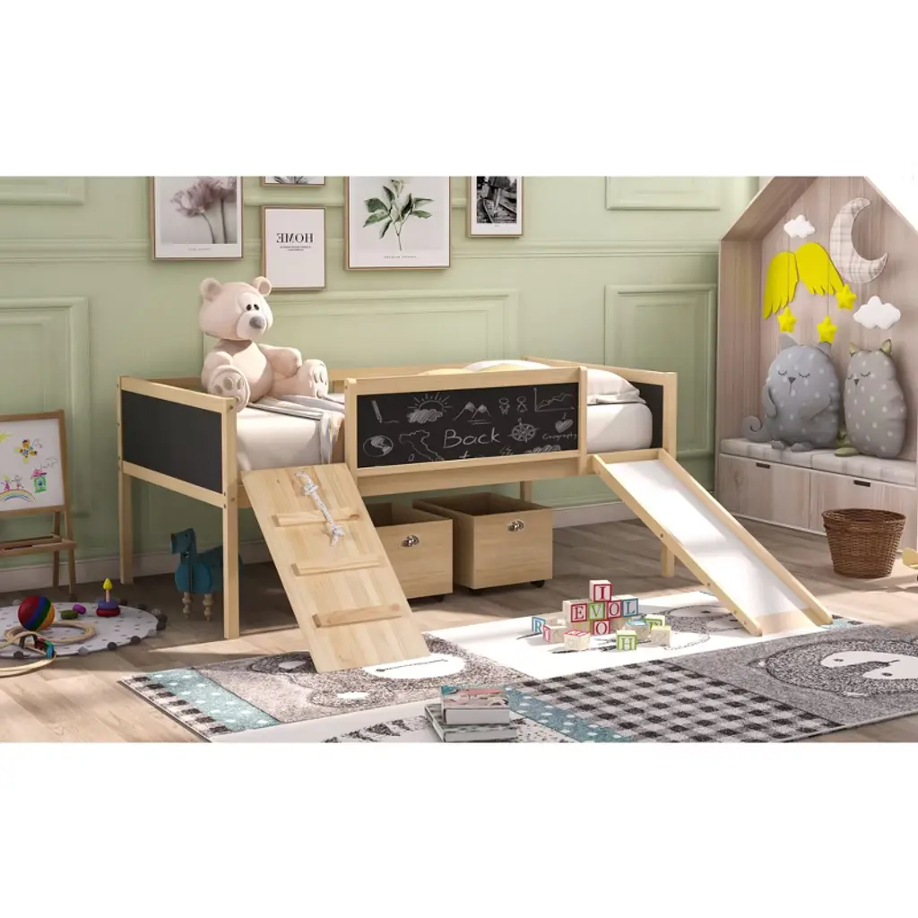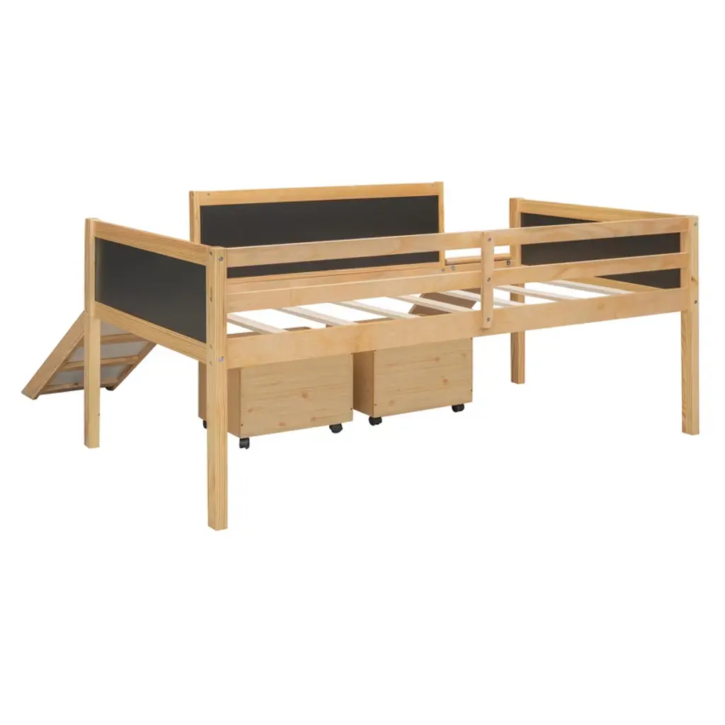 Product Features Climbing Frame & Rope – This loft bed comes with a few new elements: a climbing frame is used instead of a ladder, which adds interest to bedtime routines. A climbing rope is also included, allowing you to experience the joy of climbing every night before going to bed. The climbing experience can also help train physical coordination over time.Pine Wood Frame & Double-sided Chalkboard – This novel design loft bed is manufactured with a solid pine wood frame to guarantee stability and durability. Pine provides good elasticity, breathability, and acceptable heat conduction. Three sides of this loft bed are equipped with double-sided chalkboards, complete with a thoughtful chalk slot. Customers can always pick up chalk and write down their colorful dreams and imaginations through drawings and writing.Safety & Fun – After waking up, you can get out of bed in the quickest and happiest way every morning thanks to the built-in slide. The bottom plate of the slide is made from MDF with a smooth surface for a fun sliding experience. The wood slats and side rails of this loft bed are made of plywood. This slat design allows air to pass freely beneath the bed, keeping it cool and ensuring the mattress remains fresh and long-lasting.Additional Storage Boxes – Considering the need to store many daily items, two storage boxes are shipped with this functional loft bed to meet your storage needs. These two storage boxes are made of plywood and are open-top for easy access. They provide the perfect space for storing various tools and toys. The casters on the storage boxes can be locked in place to keep them securely positioned beneath the bed.Dimensions: Overall Product Dimension: 78.5" x 79.2" x 34" (L x W x H). Mattress not included. Some assembly is required, although we have provided clear instructions and tools. Description A novel idea was put into the design when manufacturing this marvelous loft bed — the traditional ladder has been replaced with a climbing frame, which appeals to most people even more. And the way to get out of bed? Sliding! This interesting design offers the chance to train physical coordination in daily life and bring more happiness into the bedroom. The double-sided chalkboards set on three sides allow you to use your imagination and creativity anytime, stimulating brain potential. Additional storage boxes are another shining aspect of the design, offering parents a practical and helpful solution. The open-design storage boxes are perfect for storing all sorts of toys and daily necessities. Four classic color options let you choose your favorite easily. Weight & Dimensions Overall Product Dimension: 78.5"L x 79.2"W x 34"HDetail Product Dimension: Please refer to the Size imageNumber of Package: 1Package Dimension: Please refer to the SpecificationOverall Product Weight: 107 LBSPackage Weight: Please refer to the SpecificationWeight Capacity: 175LBSRecommended Mattress Thickness: 6"Recommended Age: £¾ 6 years old Specifications Product Type: Loft BedSize: TwinProduct material: Plywood + MDF + Pine woodBed slat material: PlywoodLevel of Assembly: Partial assemblySplit into two beds: NoBox Spring Required: NoMattress Included: NoEstimated Time to Assemble: 30 minutesSuggested Number of People: 2Additional Tools Required: ScrewdriverAvoid power tools: YesNotes: Manual measurement has been used, there may be some reasonable error. All the pictures are taken by actual samples, slight chromatic aberration may occur due to lighting or display.