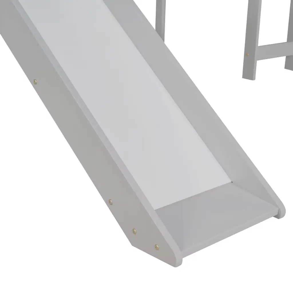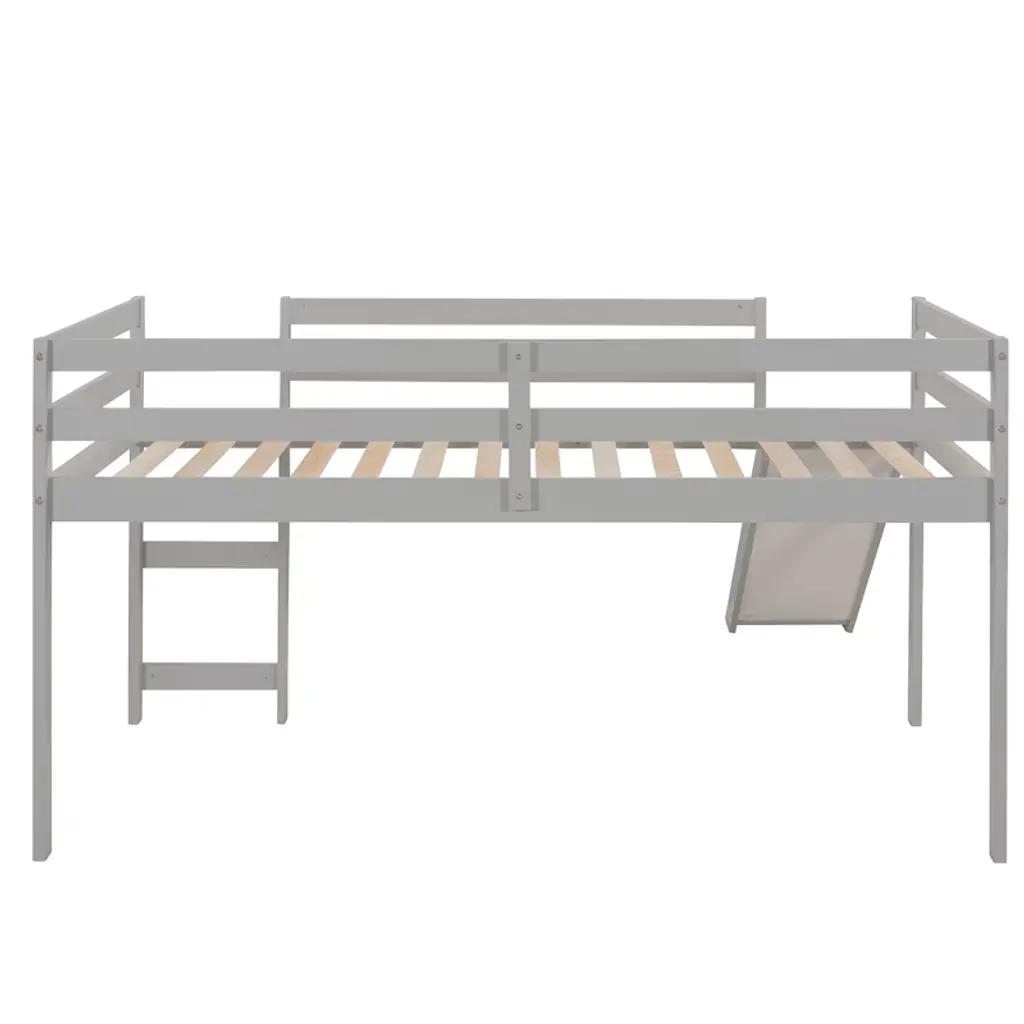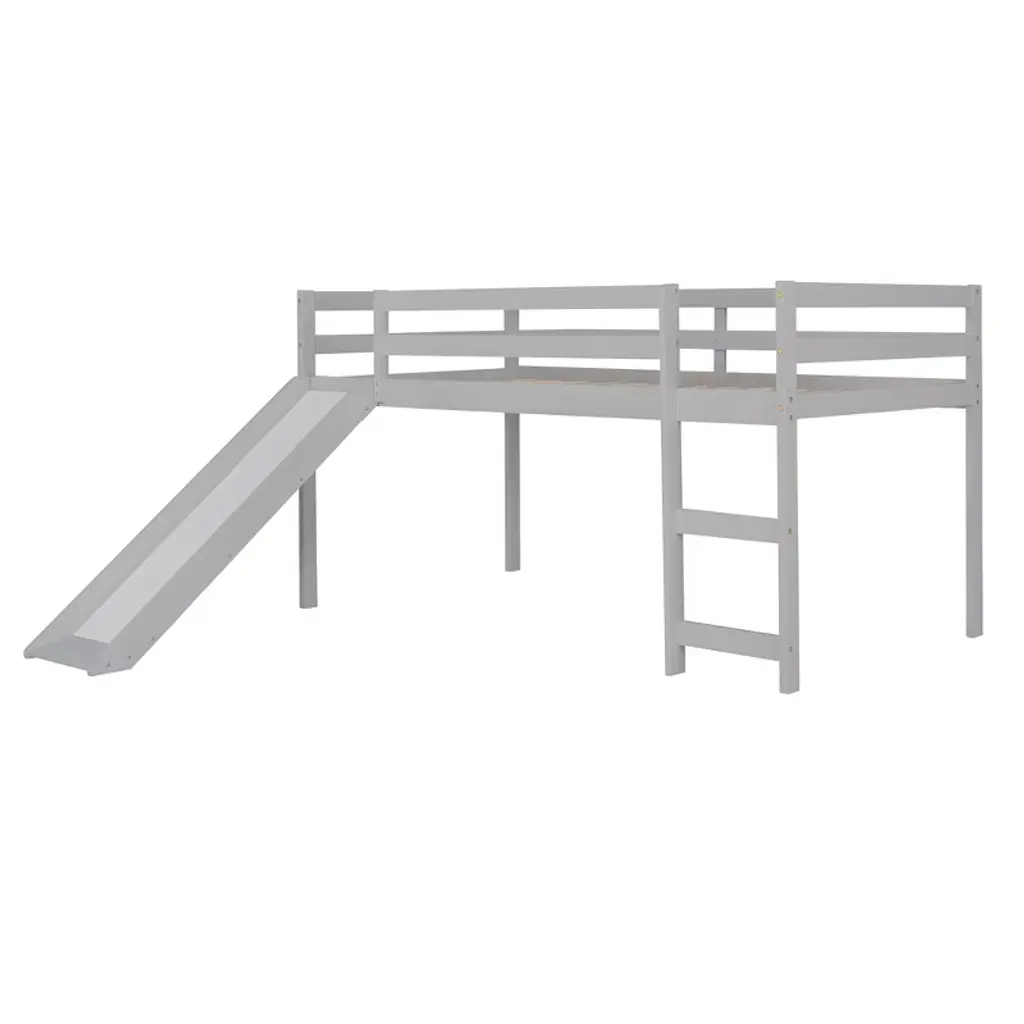 Wood Twin Size Loft Bed With Slide For Kids, Low Profile Kids Mini Twin Loft Bed With Ladder, Gray