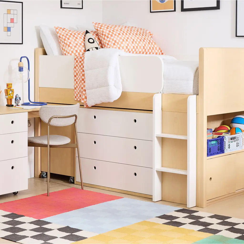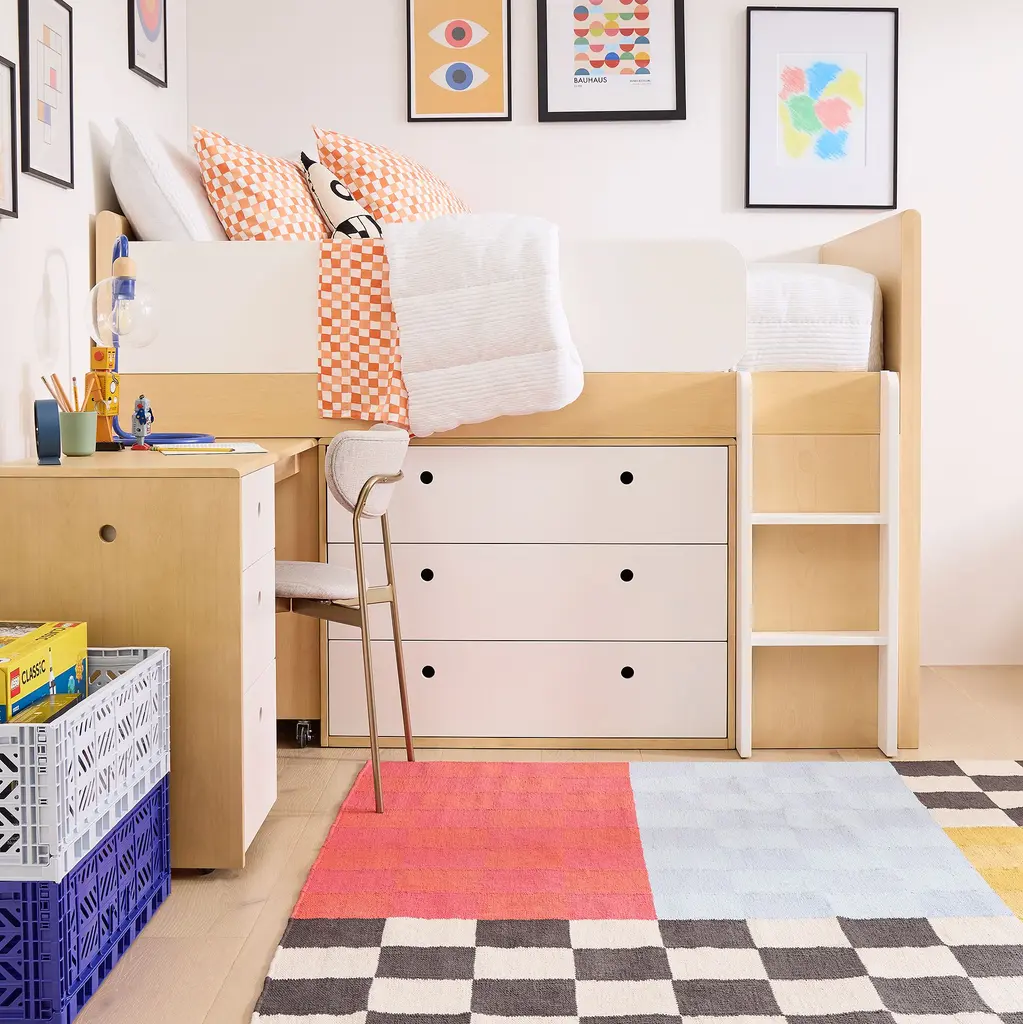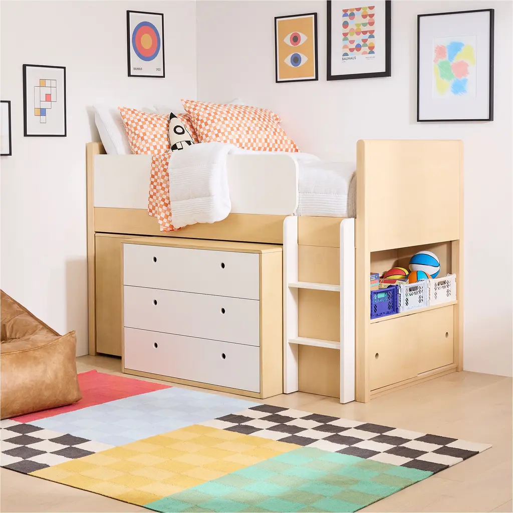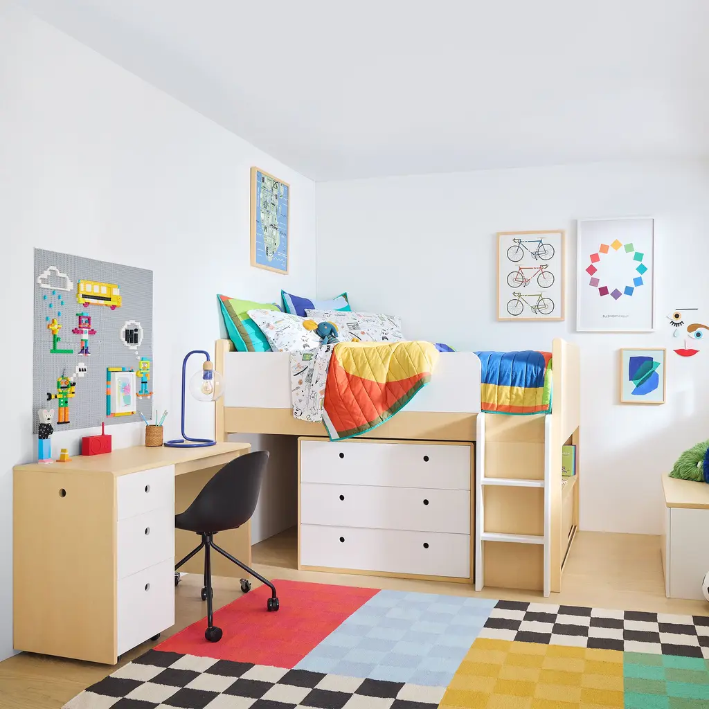 This three-in-one furniture will unify the look of your kids bedroom. Its compact design is a win for smaller rooms. Ample storage for clothes, toys, school supplies and more.