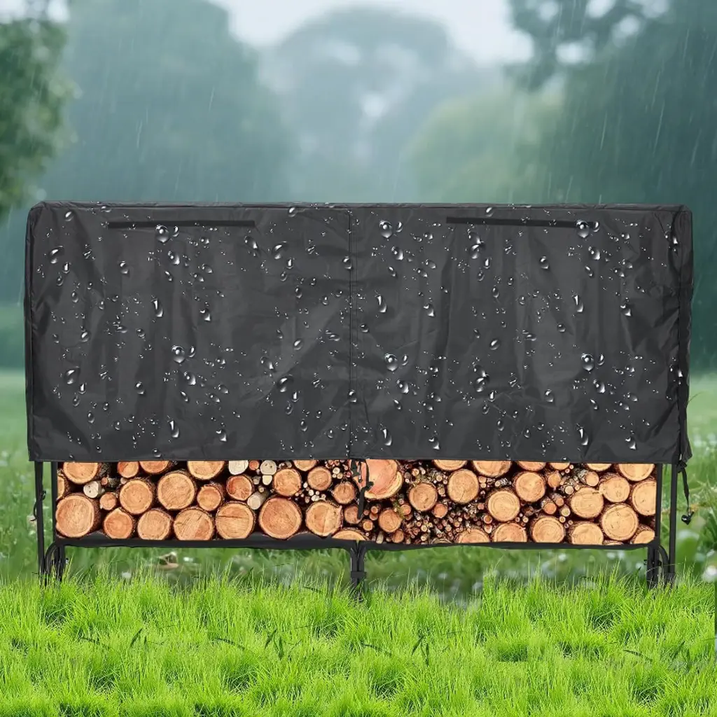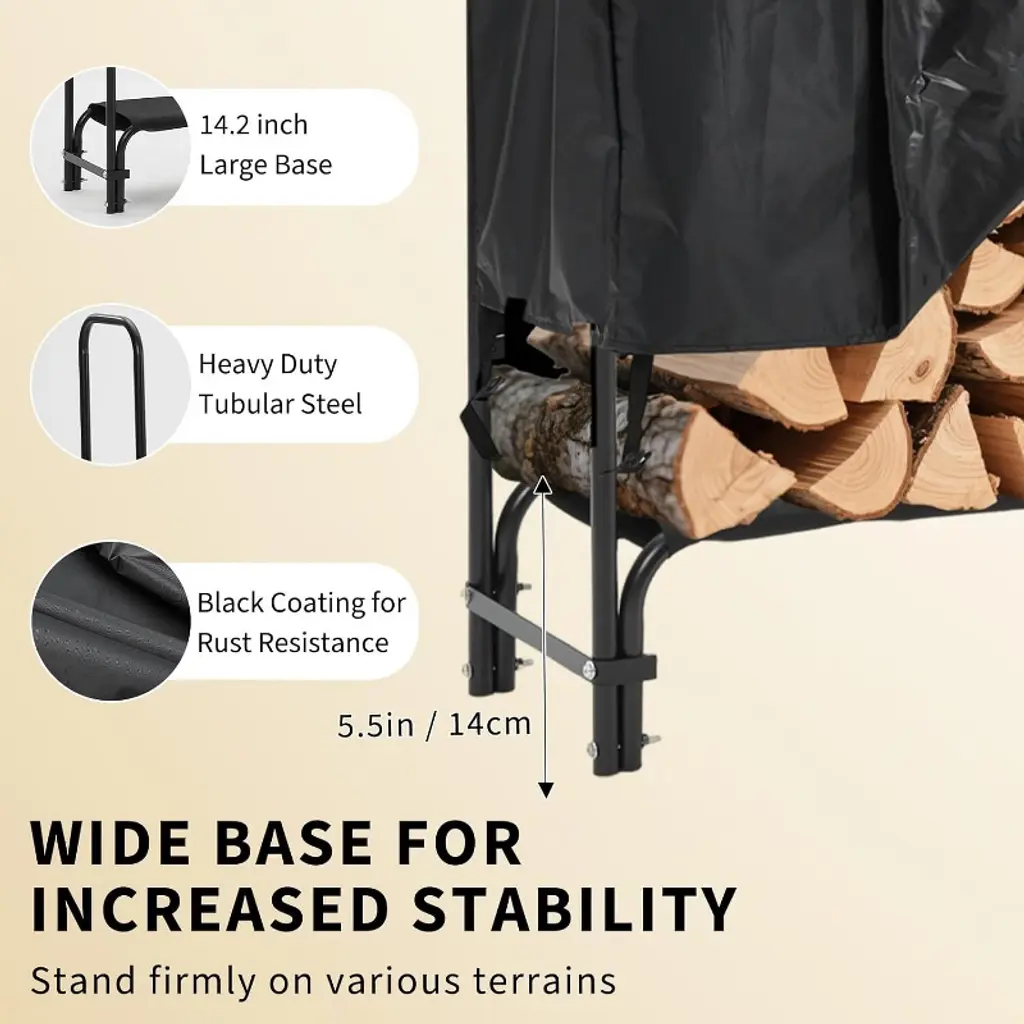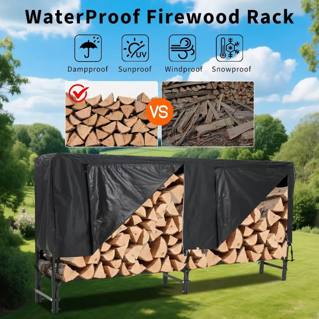 Acekool’s firewood rack with waterproof cover is designed for both indoor and outdoor wood storage. The sturdy steel frame supports logs while the heavy-duty cover shields them from tough weather, helping to keep firewood dry and ready for use. The open, elevated rack encourages airflow, reducing moisture buildup and making each fire easy to start.Setup is straightforward and tool-free. The zippered cover makes it simple to access wood while protecting it from rain, sun, and snow. Rust-resistant steel construction means less maintenance and long-lasting use. Place this rack on patios, in garages, or yards to organize and store wood for fireplaces, fire pits, or wood stoves.Size: 8Ft or 4Ft length x 4Ft height x 13.8" widthModel: Firewood Rack with CoverColor: BlackRecommended use: Patio, deck, garage, backyard, indoor spaces
