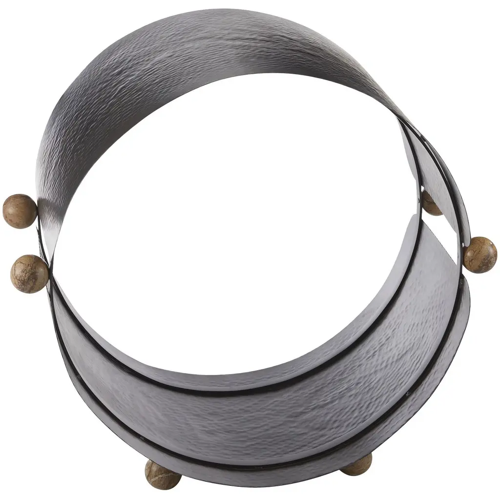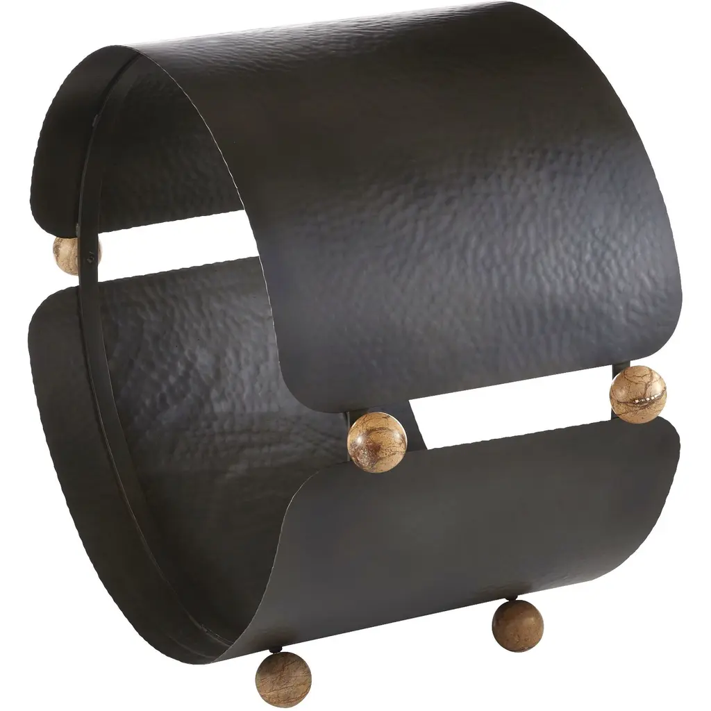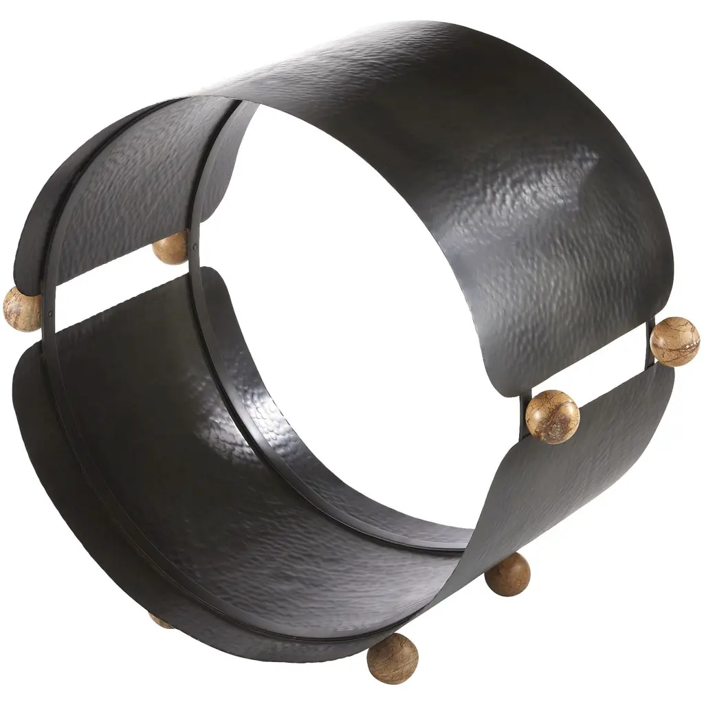 A Traditional Log Holder Is Updated In Hammered, Blackened Iron. Its Oversized Circular Profile Acts As Enclosed Storage, While Contrasting Spacers Of Sienna Marble Add An Element Of Surprise. Finished With Marble Feet, Its Modernist Silhouette Is A Work Of Functional Art For Any Hearth. Finish Will Vary.