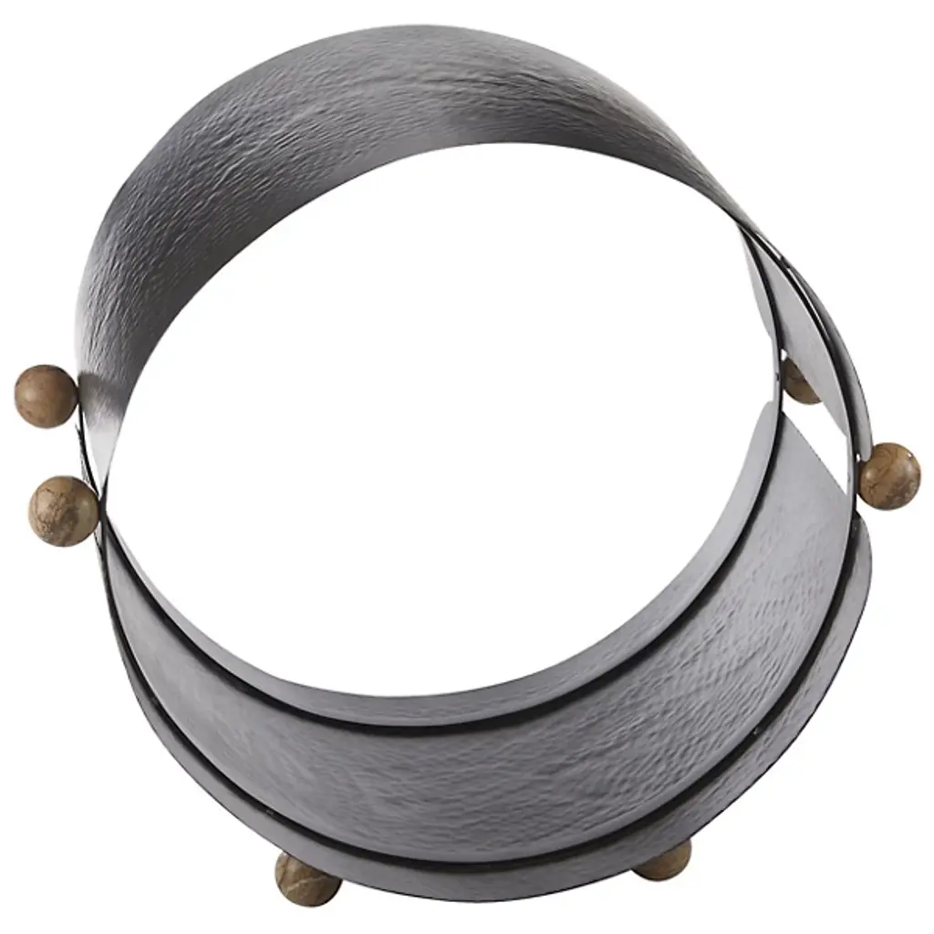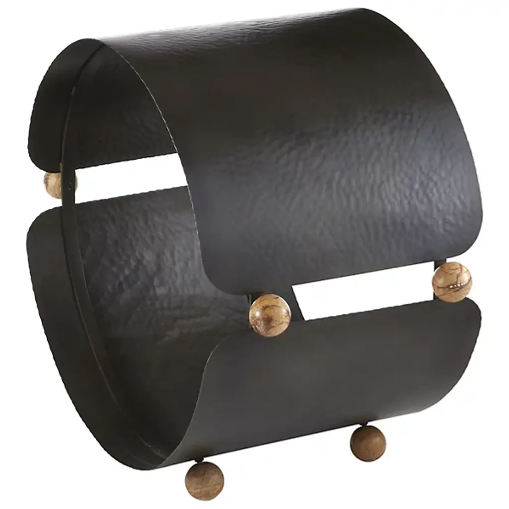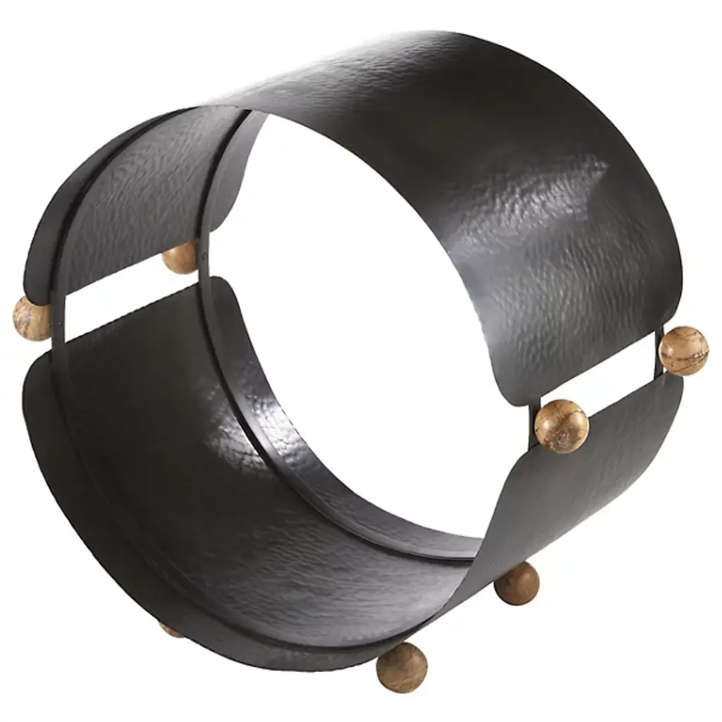 The Cannon Log Holder from Arteriors receives a modern update with hammered, blackened iron and an oversized circular profile for enclosed storage. The addition of sienna marble spacers offers a delightful contrast and unexpected detail. Completed with elegant marble feet, its modernist silhouette transforms it into a piece of functional art for any hearth. Each holder features unique finish variations, enhancing its distinct character and charm.