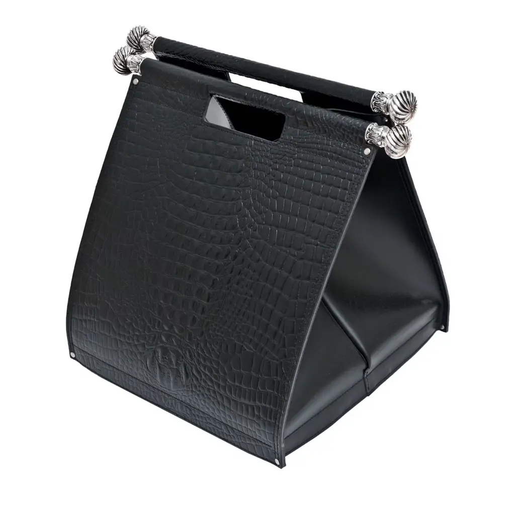 Sophisticated and stylish, this quality and functional Magazine Bag or Wood Holder is crafted in black crocodile print leather. The high level of craftsmanship includes sturdy and refined black seams and metal handles covered in leather. Made in marble powder and coated in sterling silver, the tortiglione shaped ends on the handles add exquisite detail.