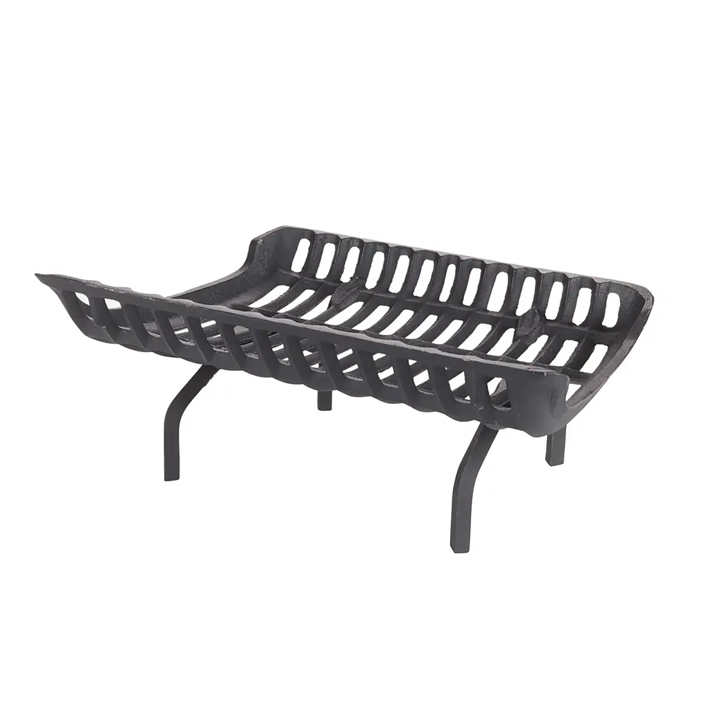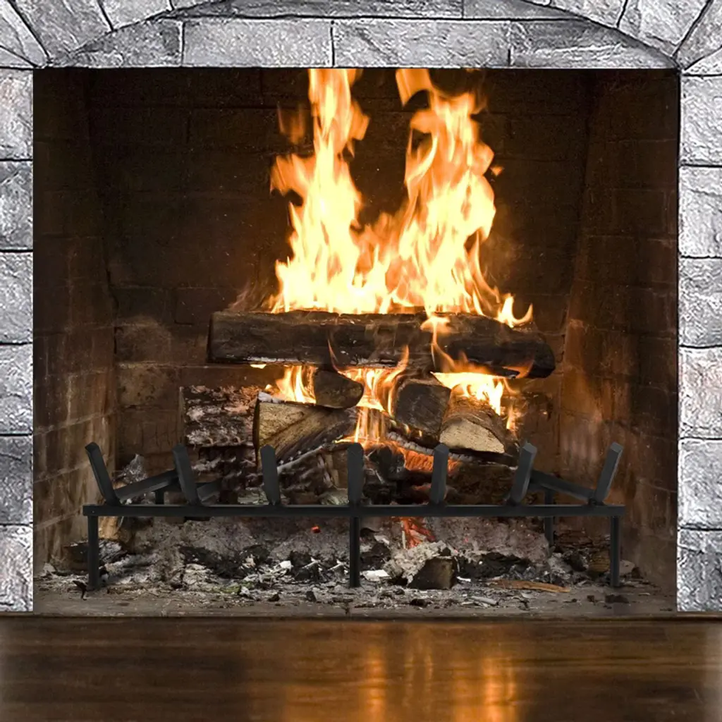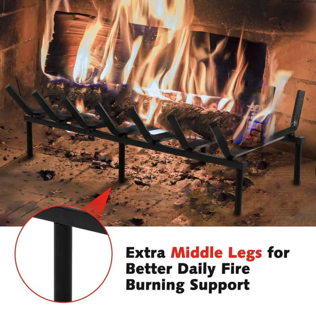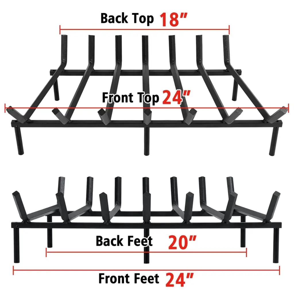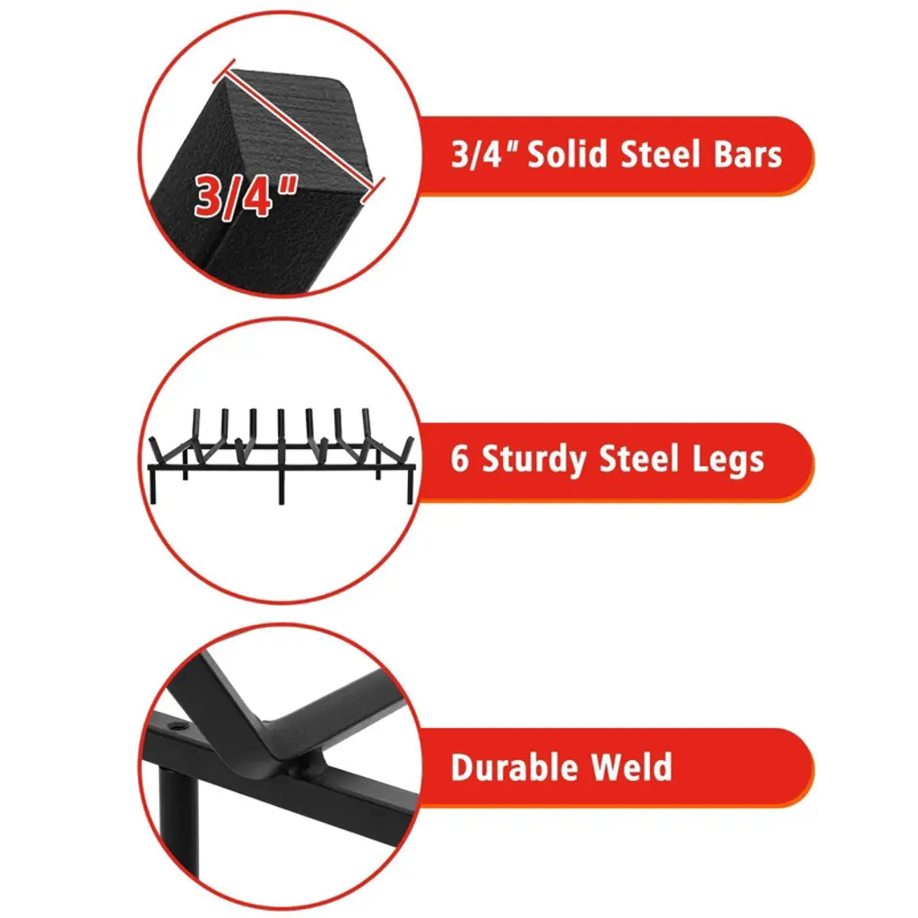 Enhanced Support: Our 24-inch fireplace grate features 4 solid thick side legs and 2 extra solid thick middle legs, ensuring optimal support and preventing sagging. Ideal for daily firewood burning. Heavy-Duty Construction: Constructed with 7 steel rods and 6 steel legs, this fireplace log holder is built to last. The V-shape design facilitates easier fire lighting and wood securement, while the 4-inch gap between the grates and the floor promotes better airflow and visual appeal. Sturdy & Durable: Crafted from thick and solid 3/4 inch x 3/4 inch steel bar rods with a black high-temperature paint finish, our cast iron fire grates boast durability and stability. Good welds at the joints further enhance their sturdiness. Compact Design: With an overall size of 24" W x 14.5" D x 7" H, this fireplace log grate offers a space-saving solution suitable for both indoor decorative wood-burning fireplaces and outdoor fire pits. Easy Assembly: Simple assembly required. Our fireplace grate is easy to set up and can be conveniently used in various settings, including indoor fireplace chimneys, outdoor fire pits, and wood-burning stoves in backyards and patios. Product Specifications: Material: Heavy-duty steel Overall Size: 24" W x 14.5" D x 7" H Gap between Grates and Floor: 4 inches Color: Black Package Contents: 1 x Fireplace Grate Installation Instructions Enjoy improved fire burning support and durability with our fireplace grate.