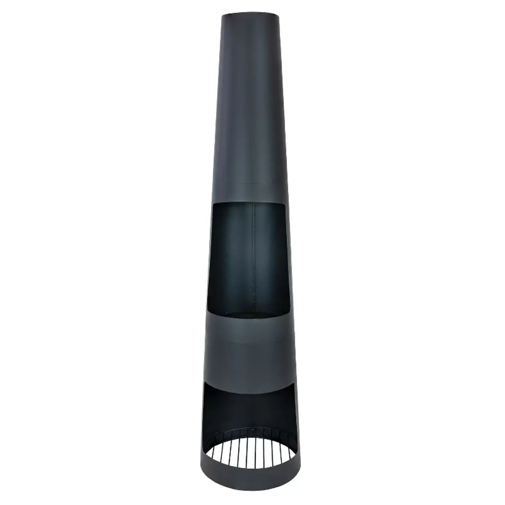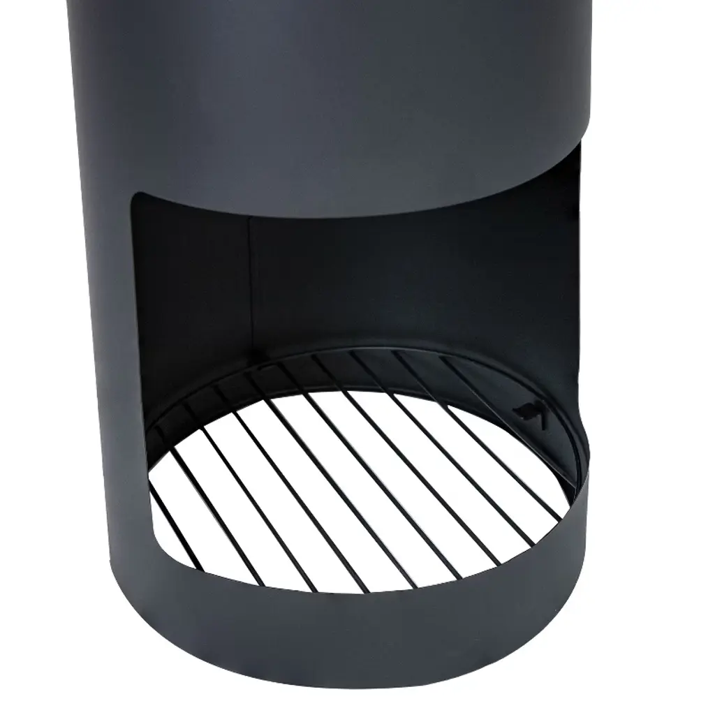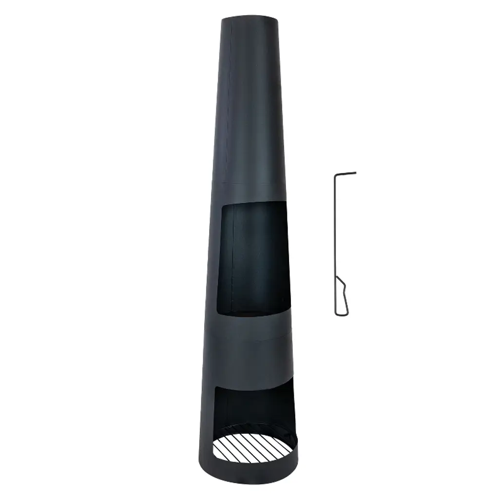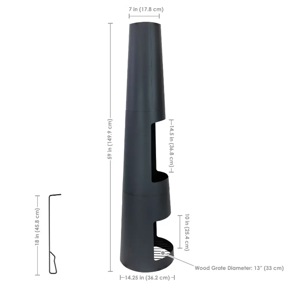 Enjoy the cozy warmth of roaring fire even if the yard or garden is small with this compact and stylish fire pit with chimney. Made from sturdy steel with a heat-resistant paint finish, this tall outdoor fire pit is built to last season after season. The base of the chiminea features a built-in log storage area to make sure that fresh firewood is always on hand to keep the bonfire burning. With its slim design, this stylish chiminea is a wonderful addition to small patios, campsites, or backyards. The relaxing warmth it produces makes it great for outdoor entertaining and gatherings.• SPACE-SAVING DESIGN: This fire pit chiminea measures 14.25" in diameter x 59" H and weighs 18.4 lbs. The top measures 7" in diameter. The log storage area is 17" H. The fire area opening measures 10.5" W at the bottom (9" W at the top) x 14.5" H. The fire pit bowl is 11.5" in diameter. The bowl has an inner diameter of 8.5" and an inner height of 3". The log storage area opening measures 12.75" W at the bottom (12" W at the top) x 10" H. It includes a removable 13" diameter wood grate.• STURDY CONSTRUCTION: This metal chiminea is built to last with a solid steel frame and a heat-resistant paint finish in classic black.• EFFICIENT DESIGN: This outdoor chimney fireplace includes a wood grate for optimal airflow, and the 18" L poker can be used to safely adjust the logs.• CONVENIENT LOG STORAGE: Keep firewood on hand with the built-in log storage located in the base of the wood-burning chiminea. Never run out of fuel and keep the bonfire burning.• WORRY-FREE PURCHASING: Sunnydaze Decor backs its products with a 1-year manufacturer's warranty.