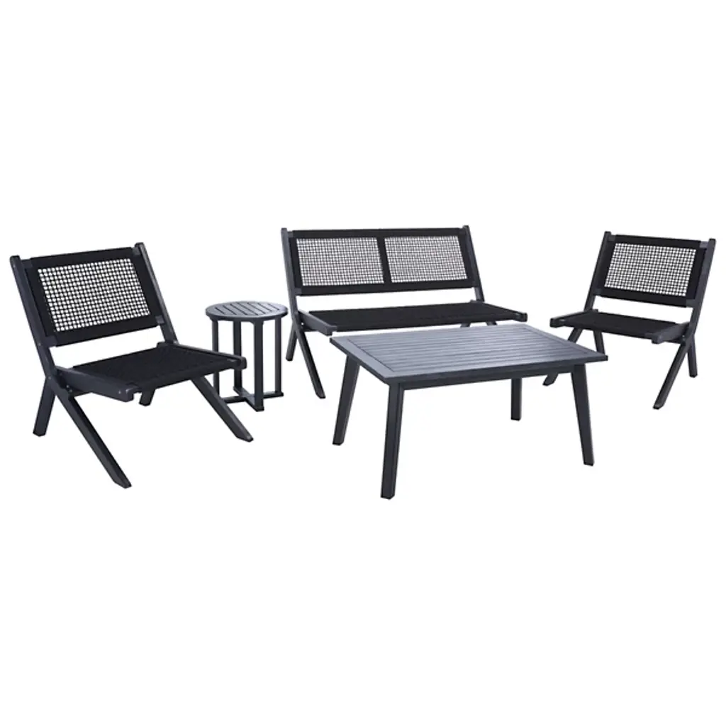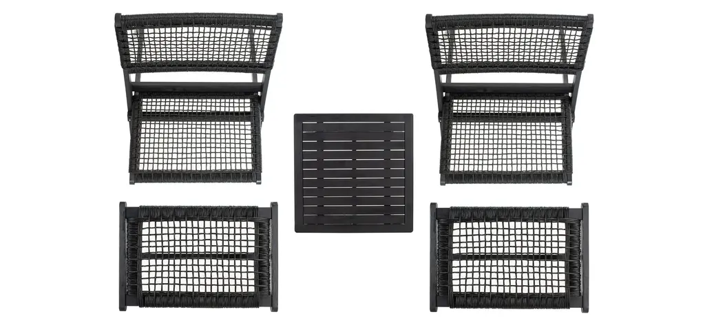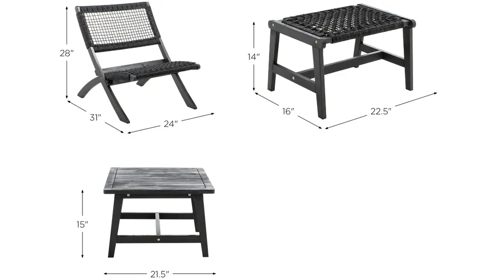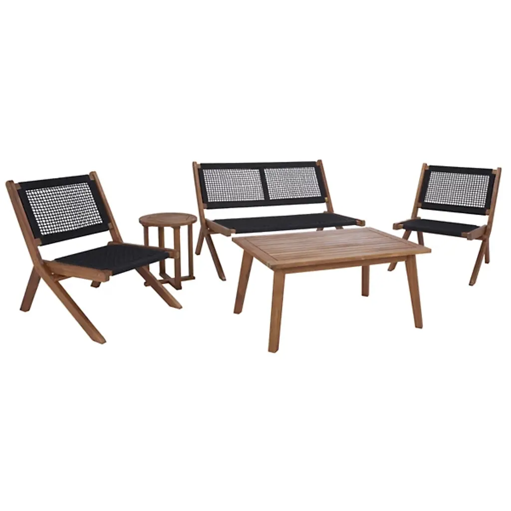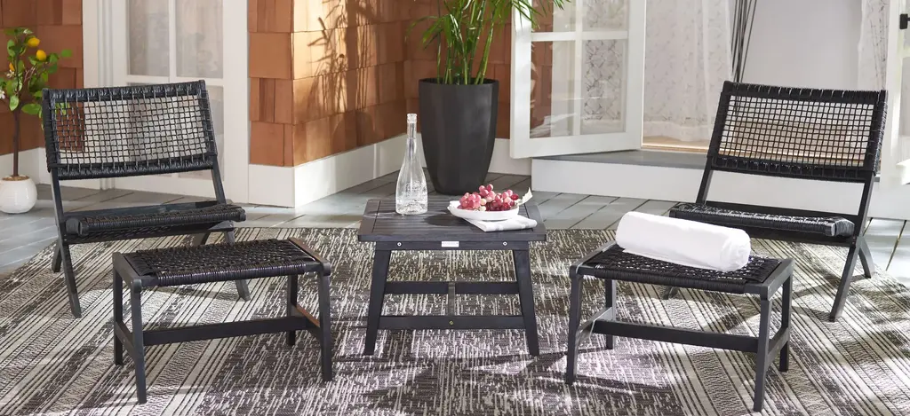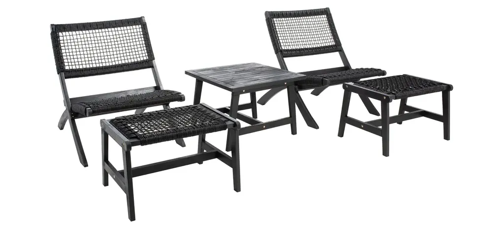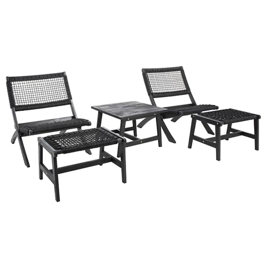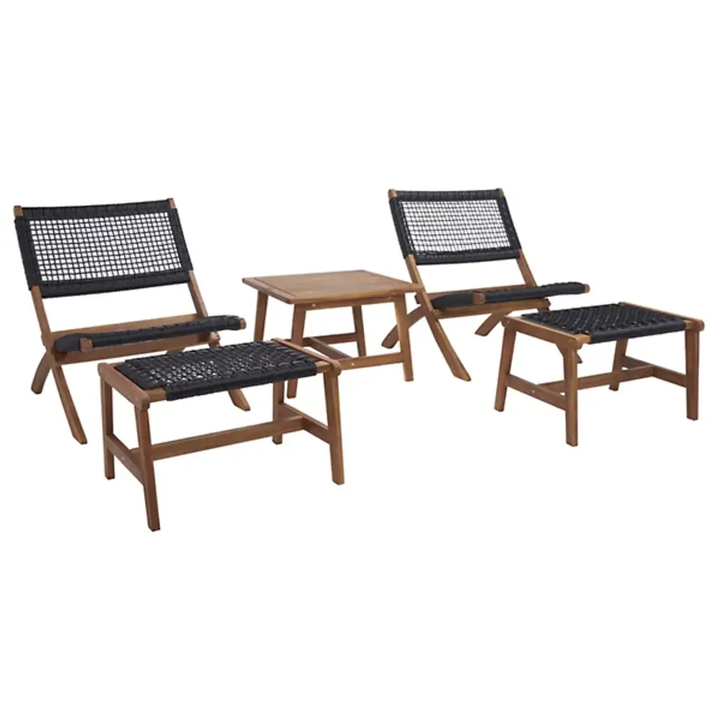 This Gresley 5-pc. Patio Set allows you to stretch out and enjoy the summer breeze with ease and style. Two natural finished acacia wood chairs and matching ottomans allow for lavish lounging in the sunshine, and an end table provides ample space for coffees, cocktails, or snacks.