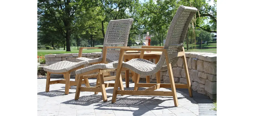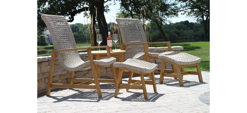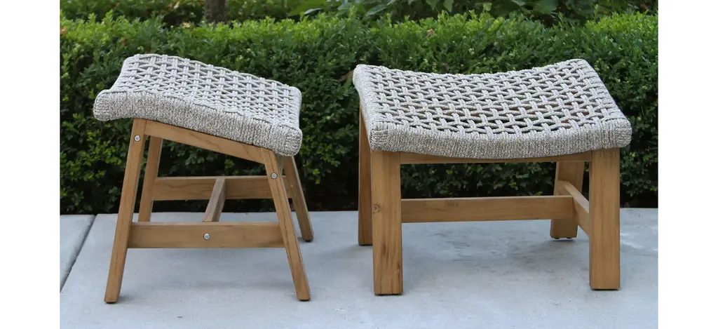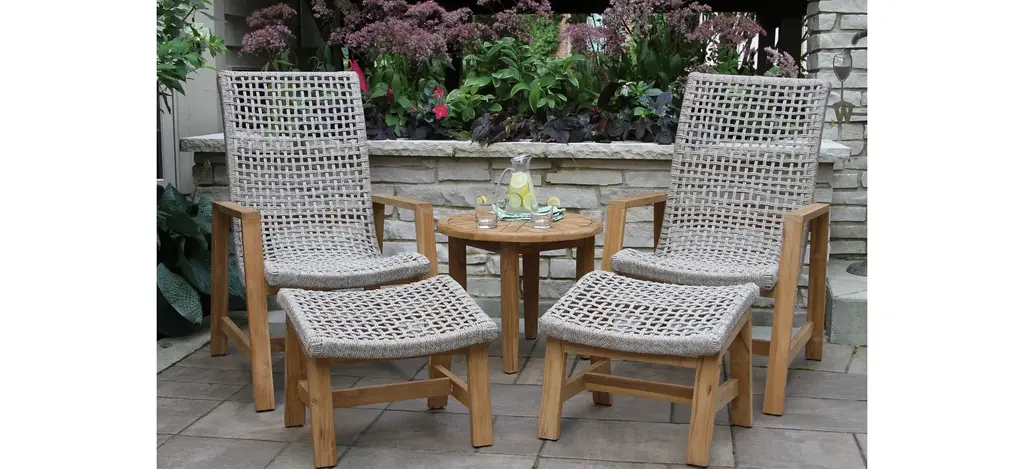 Add a luxury statement piece to your patio with the Nautical 5-pc. teak outdoor lounge set with ottomans. Perfect for the poolside paired with a all teak accent table, this set will become the focal point of your patio or deck. With teak hardwood and reinforced nautical rope, these chairs are genuinely one-of-a-kind.