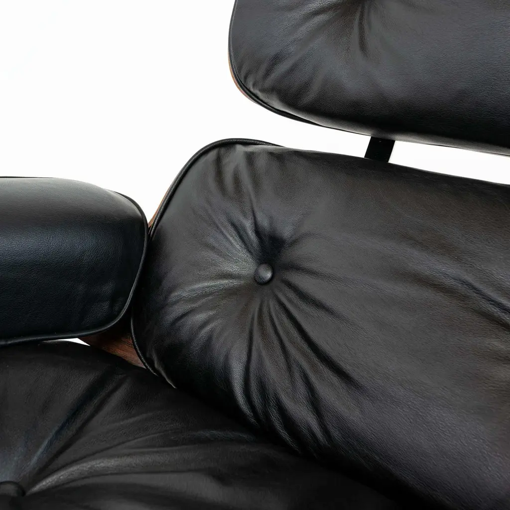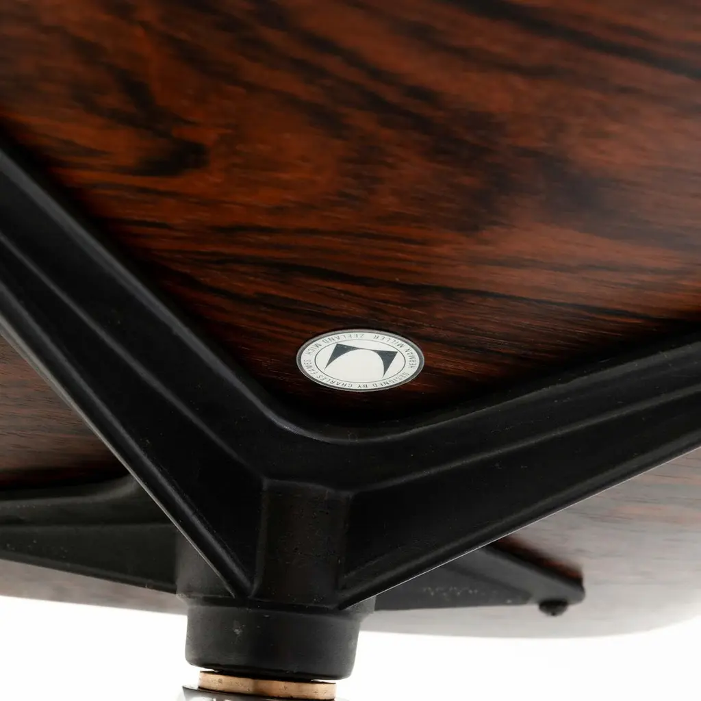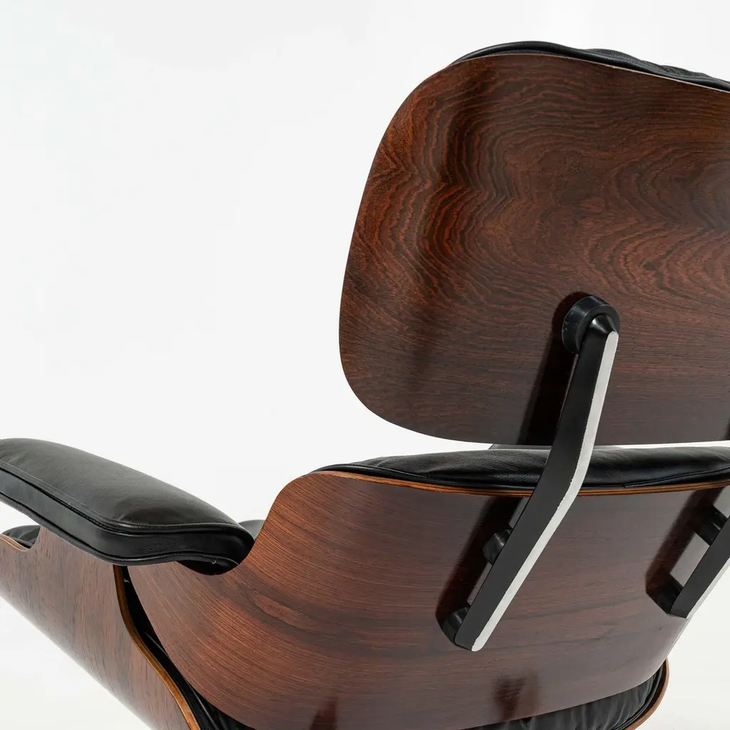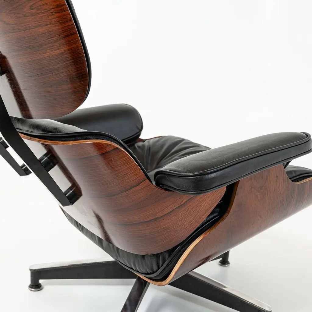 Rare and collectible 1958 Eames lounge chair with ottoman, model 670-671 includes all distinct 1st generation details, restored and reupholstered, ready for use.1st gen details:1. Three screw armrests.2. Boot glide ottoman.3. White medallion logo (in circulation between 1956-1964)4. Silver cushion clips at up right angle.5. Down-filled cushionsThis particular 1st generation has beautifully striking grain across all the shells, with non matching shells. According to the original owners, the chair suffered a bad shock mount fail, and was restored and replaced with parts from another 1st generation Eames Lounge Chair 670 in the late 70, early 80s.