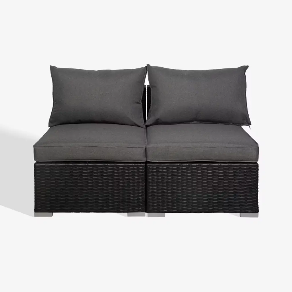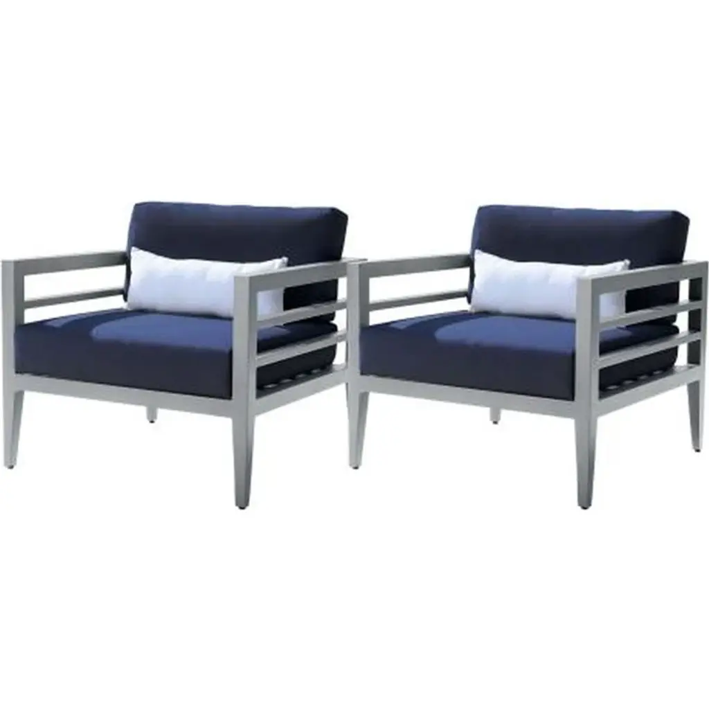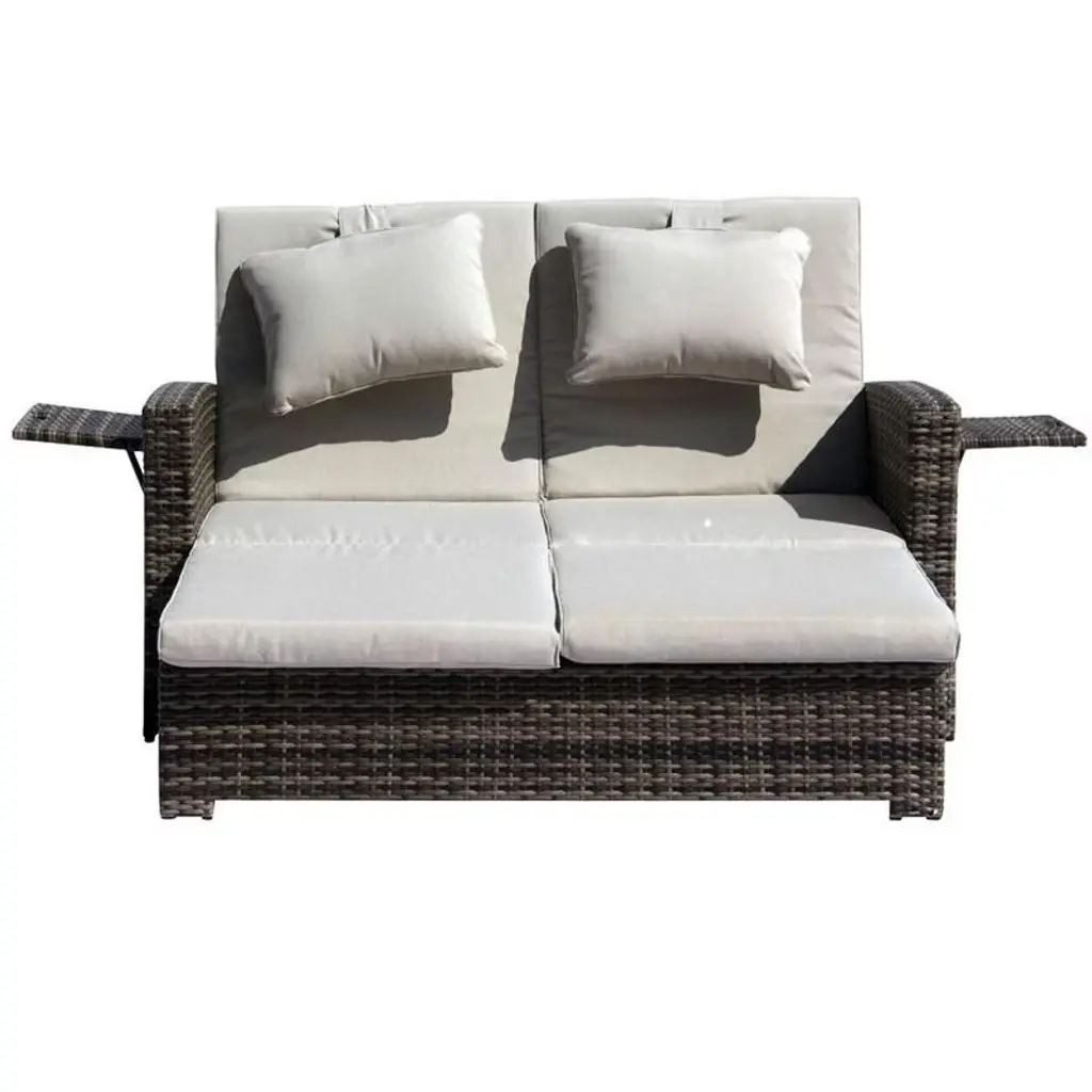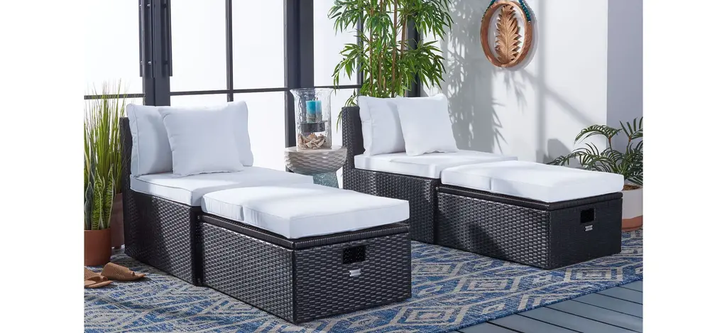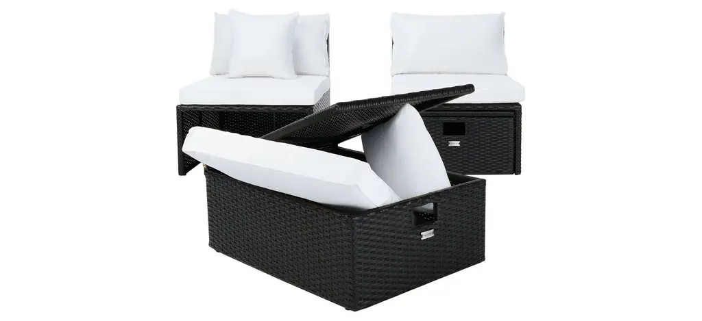 A brilliant blend of style and substance, this contemporary Beatrix 4-pc. Patio Set is the ultimate in dynamic duos. Crafted with a texture rich frame and plush matching cushions, also includes clever built in storage ottomans for smart and chic sunbathing.