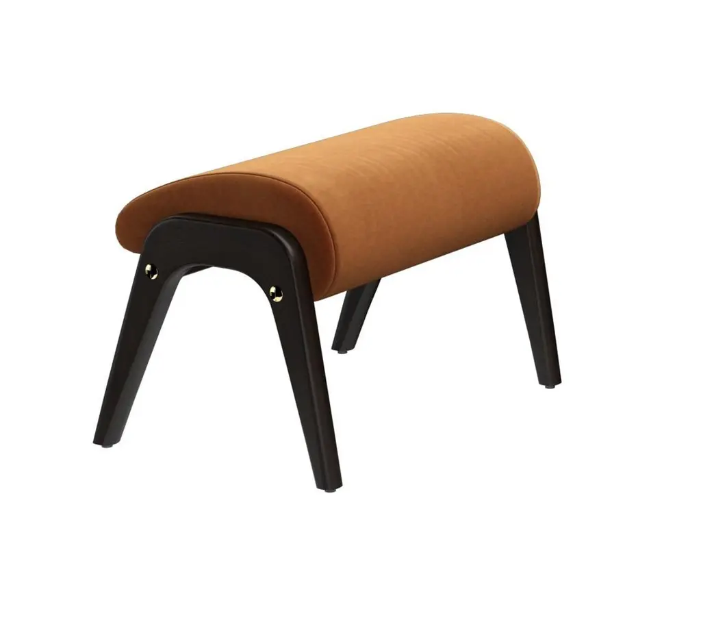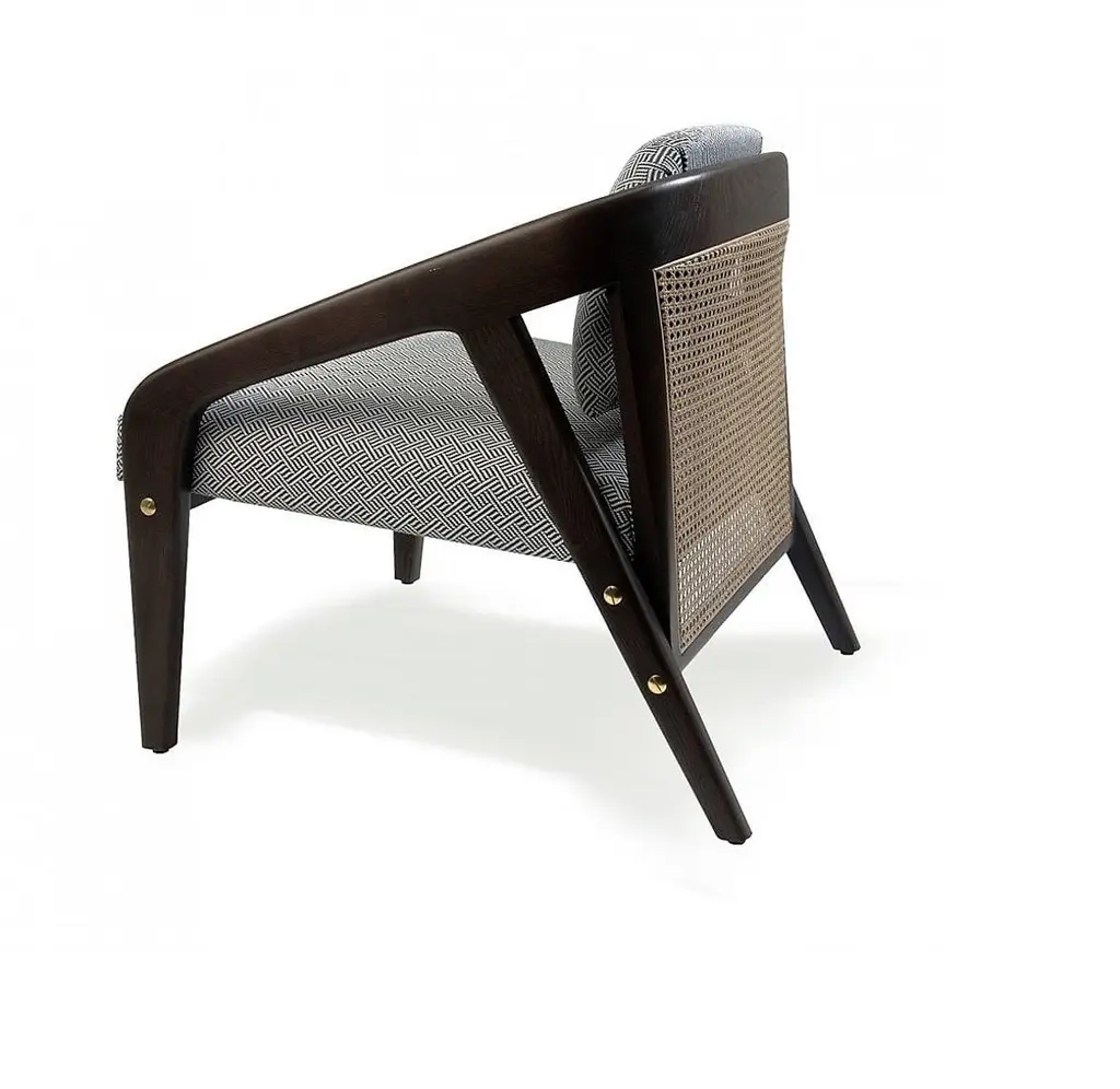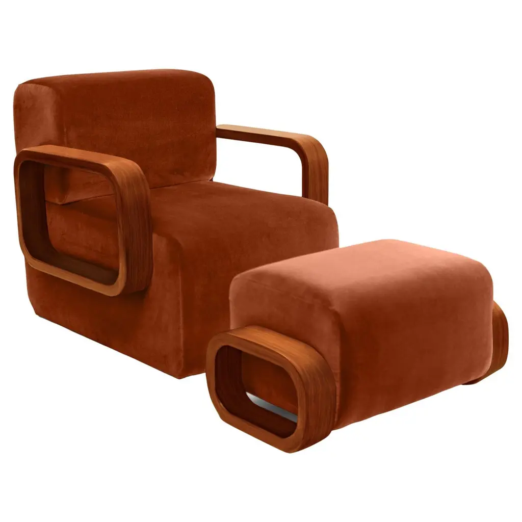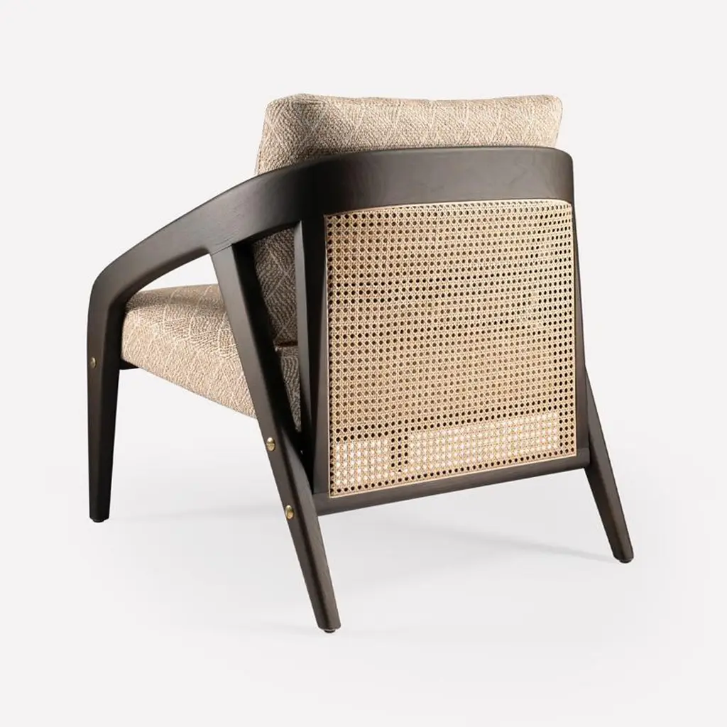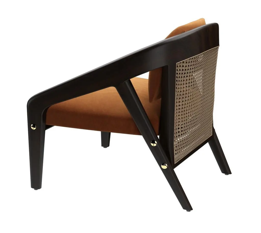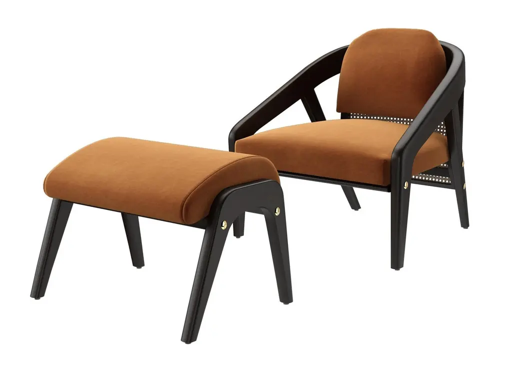 A refined expression of mid-century modern design, this armchair and ottoman set pairs architectural wood framing with tactile natural textures. Crafted in solid wood with a dark walnut finish, the silhouette features gently angled legs, curved armrests, and detailed brass hardware, evoking timeless craftsmanship.The chair’s back is elegantly finished in natural cane, offering both breathability and a nod to classic design. Upholstered in a natural woven fabric, the seat and back cushions are generously proportioned for comfort, while the ottoman mirrors the chair’s sculptural base and soft lines, completing the composition with understated sophistication.Dark stained solid oak wood structure.Natural woven rattan back.Stainless steel accents in gold finish.Available in COM upon request.Showing in caramel velvet.Ottoman Dimensions: H 41 cm x W 60 cm x D 43 cm.Contact us to enquire about COM/COL production, requirements and material shipping instructions.Please contact us if you have any questions about customization and pricing. We will be glad to check with the factory’s technical team if sizes, finishes, and colors can be customized. We do our best to expedite production and to ship and deliver product within the listed lead time, however current lead times might be longer due to global shipping backlog and delays. These delays are out of our control and cannot be a reason to cancel an order.