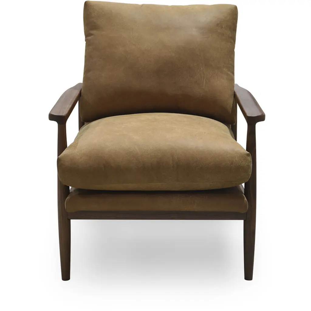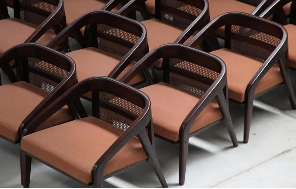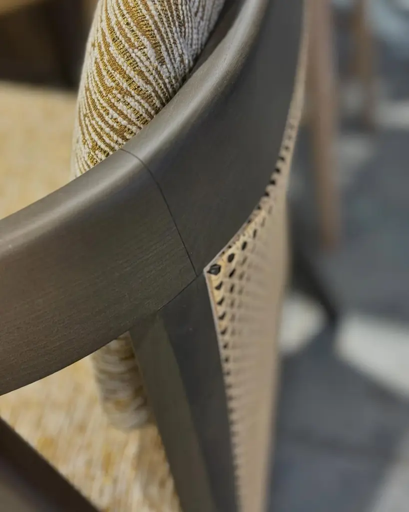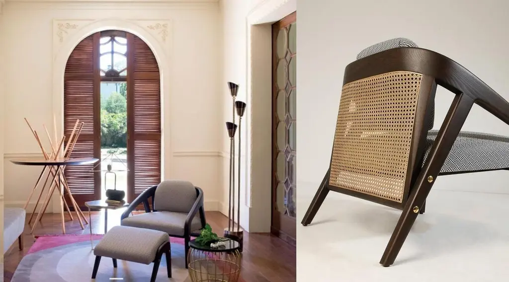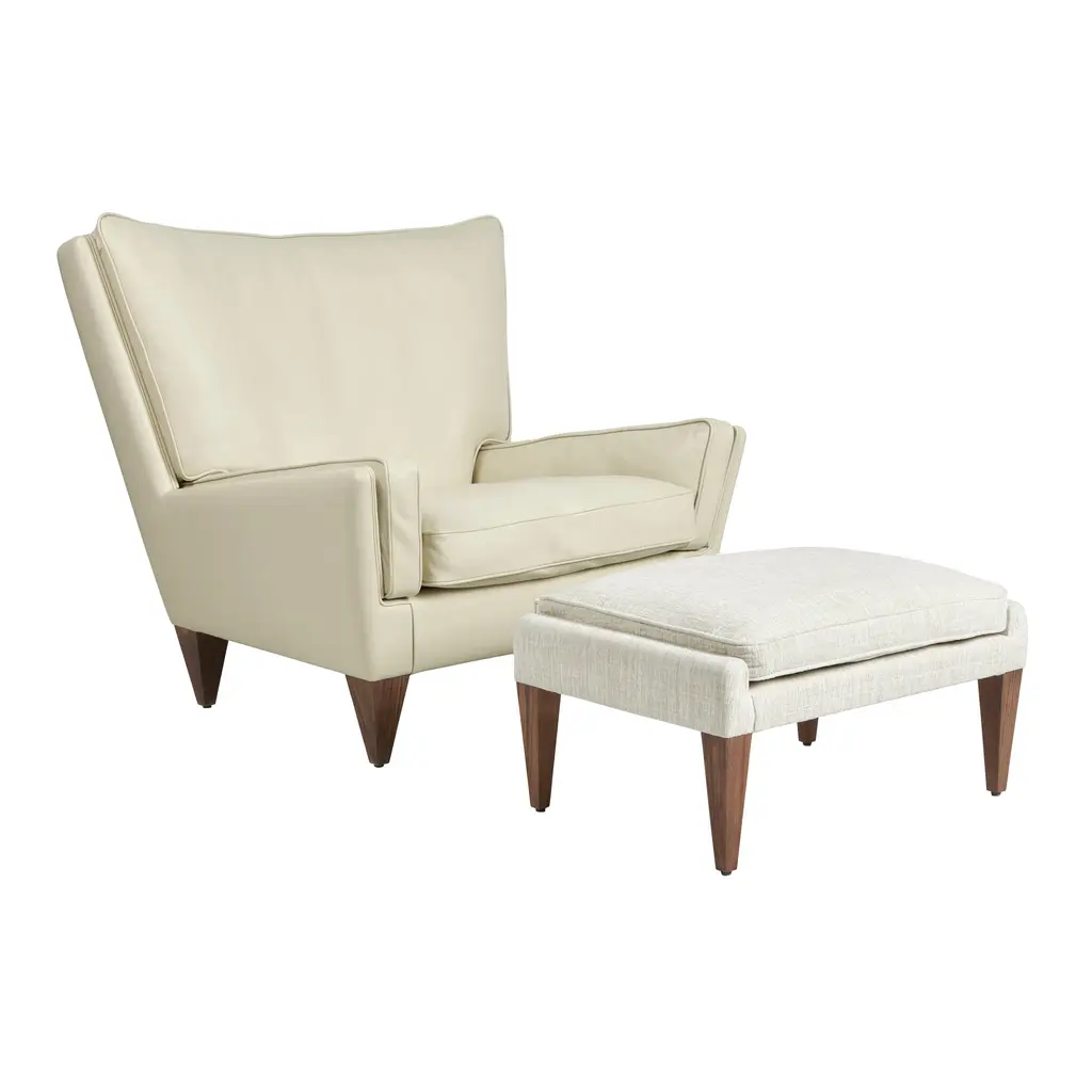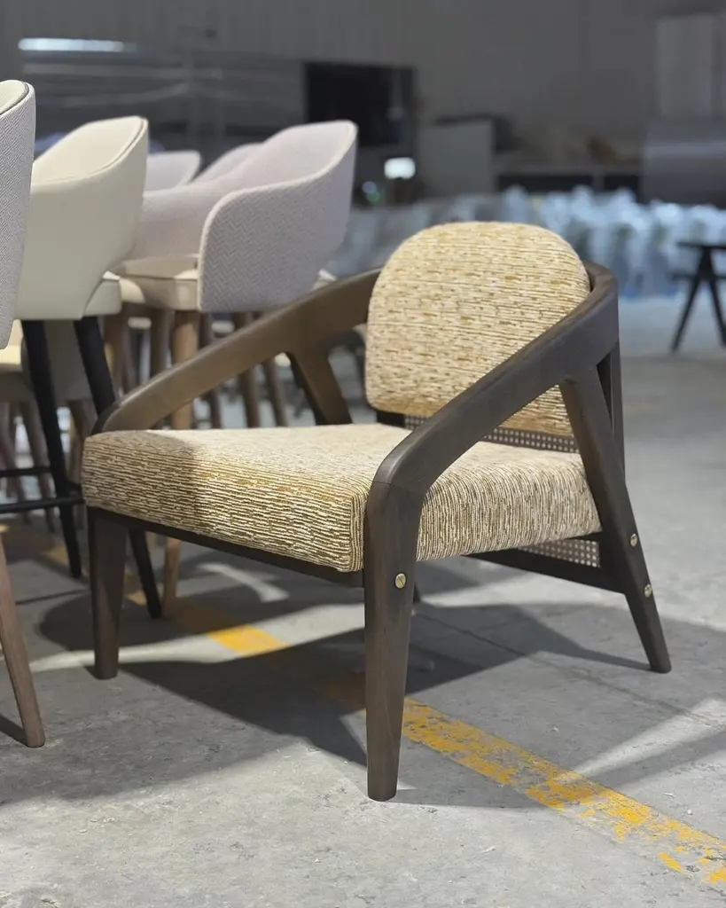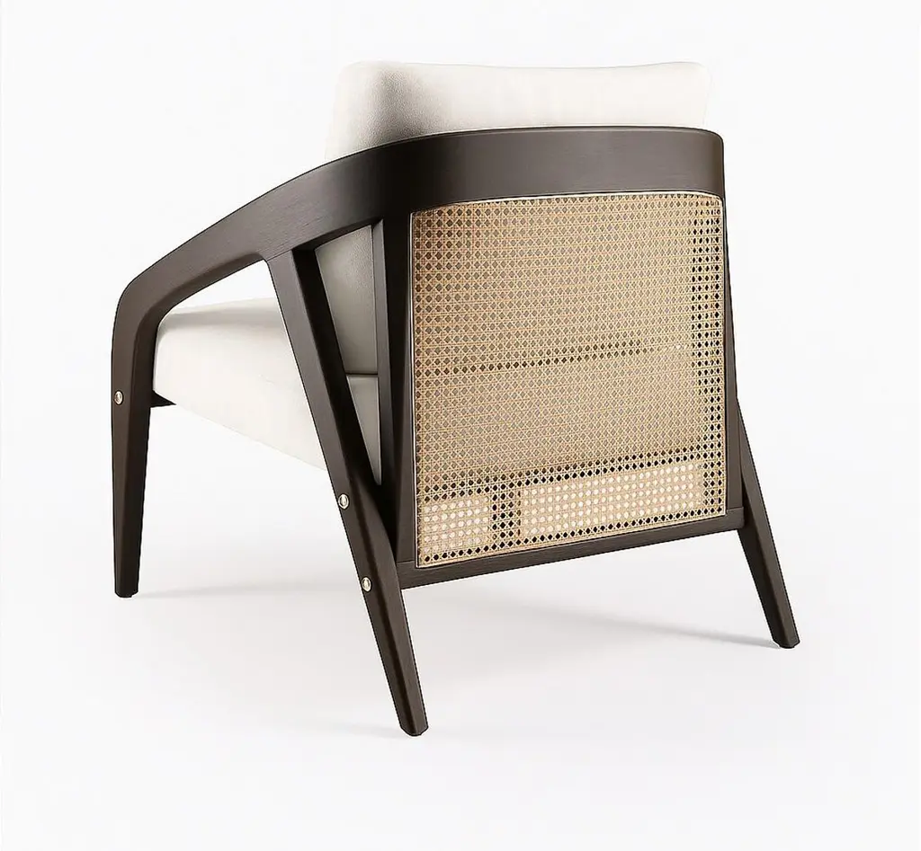 A refined expression of mid-century modern design, this armchair and ottoman set pairs architectural wood framing with tactile natural textures. Crafted in solid wood with a dark walnut finish, the silhouette features gently angled legs, curved armrests, and detailed brass hardware, evoking timeless craftsmanship.The chair’s back is elegantly finished in natural cane, offering both breathability and a nod to classic design. Upholstered in a natural woven fabric, the seat and back cushions are generously proportioned for comfort, while the ottoman mirrors the chair’s sculptural base and soft lines, completing the composition with understated sophistication.Dark stained solid oak wood structure.Natural woven rattan back.Stainless steel accents in gold finish.Available in COM upon request.Showing in caramel velvet.Ottoman Dimensions: H 41 cm x W 60 cm x D 43 cm.Contact us to enquire about COM/COL production, requirements and material shipping instructions.Please contact us if you have any questions about customization and pricing. We will be glad to check with the factory’s technical team if sizes, finishes, and colors can be customized. We do our best to expedite production and to ship and deliver product within the listed lead time, however current lead times might be longer due to global shipping backlog and delays. These delays are out of our control and cannot be a reason to cancel an order.
