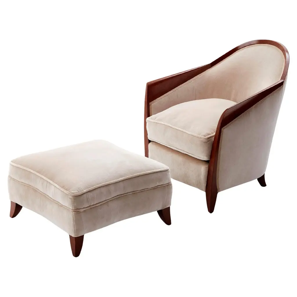 Mid-Century Style Cane Armchair & Ottoman In Beige Velvet & Walnut Frame