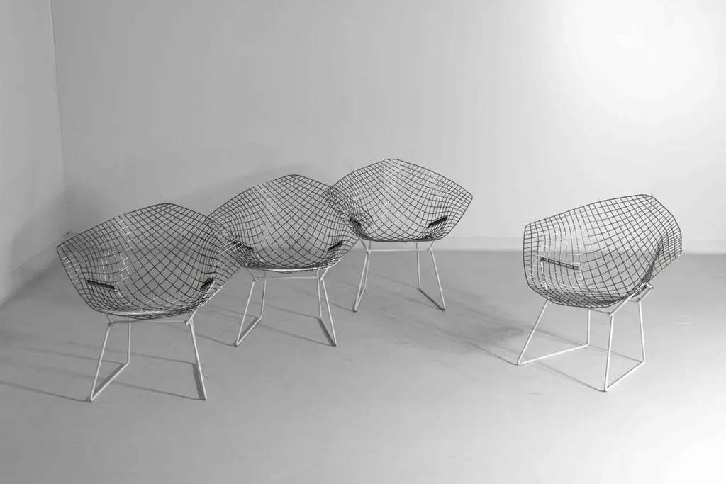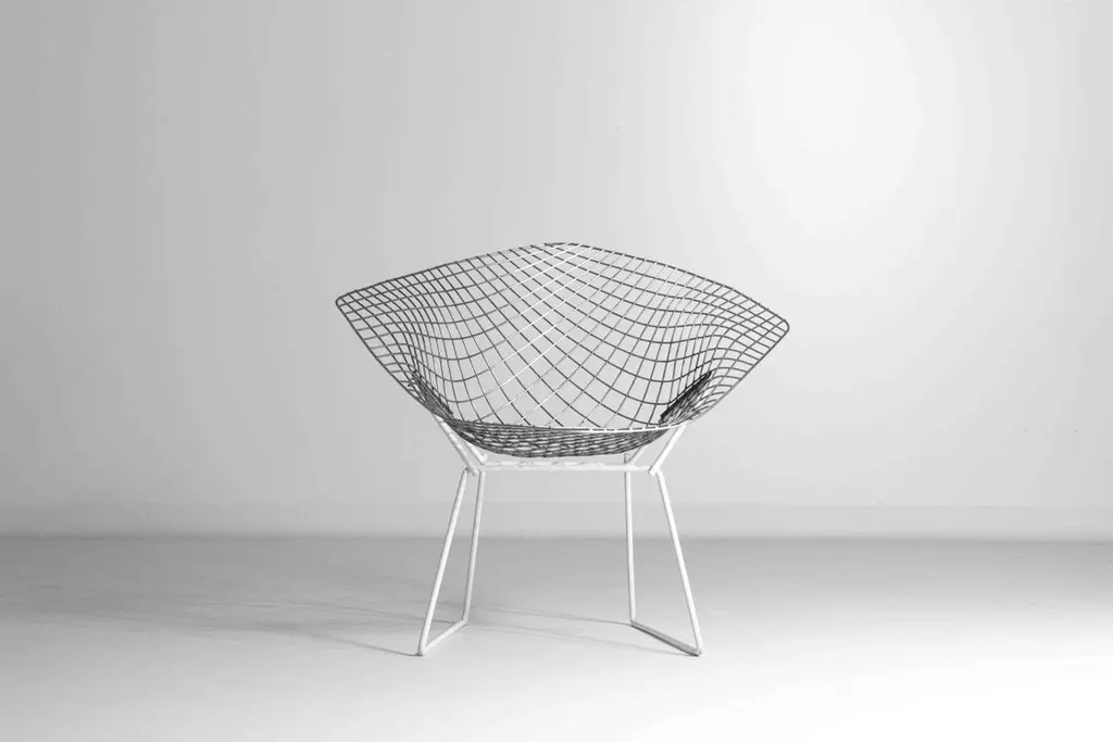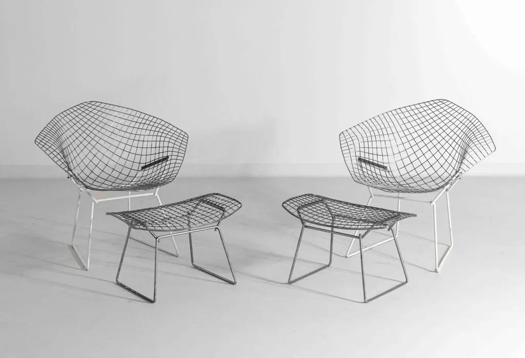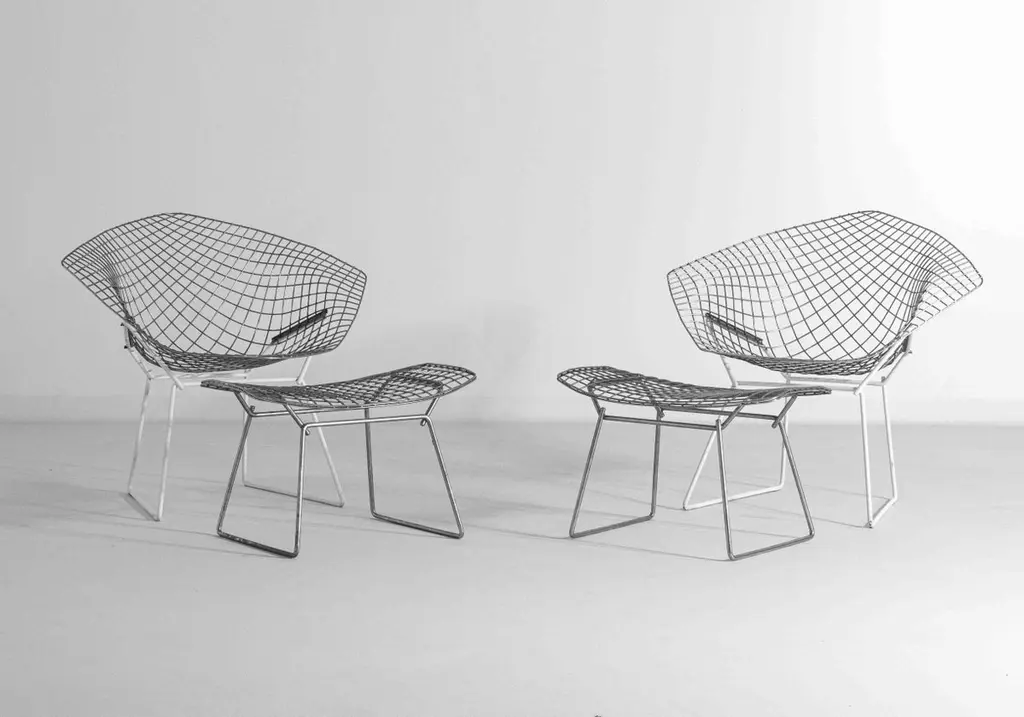 Harry Bertoia’s Diamond Chair, introduced in 1952, is a masterpiece of mid-century design. Crafted from welded steel rods, the chair’s open, airy structure gives the illusion of floating space, earning it the nickname “sitting on air.” Bertoia, a trained sculptor, was known for his obsession with metal and designed the chair to combine strength and elegance. This rare versions of the Diamond Chair come with a matching footstool. These pieces are highly collectible, especially when paired with the original ottoman, and are distinguished by their ergonomic form and timeless modern aesthetic.
