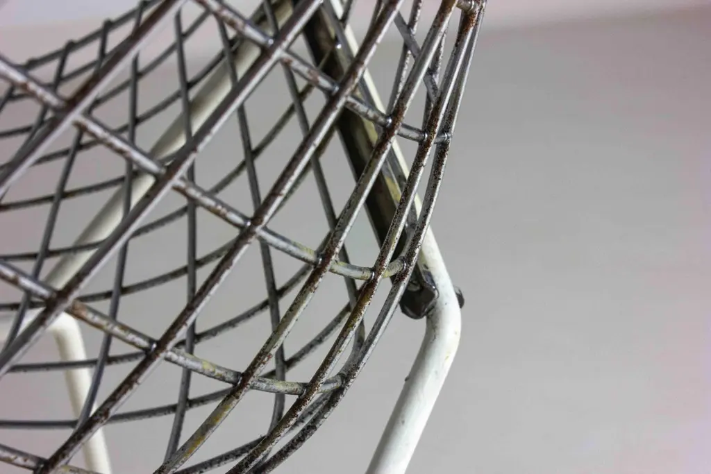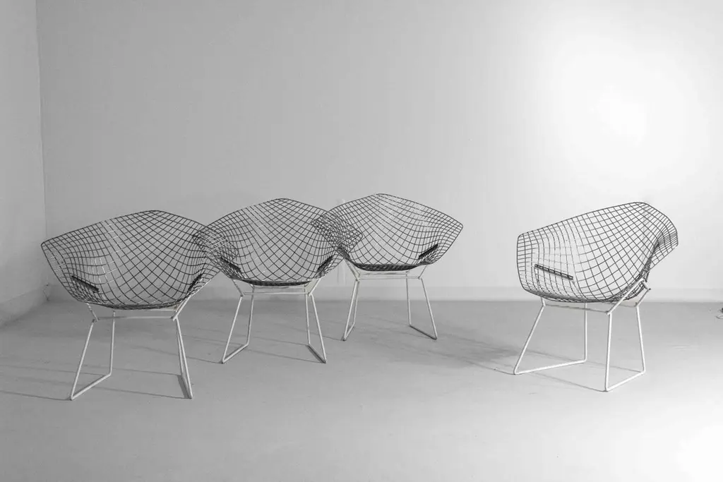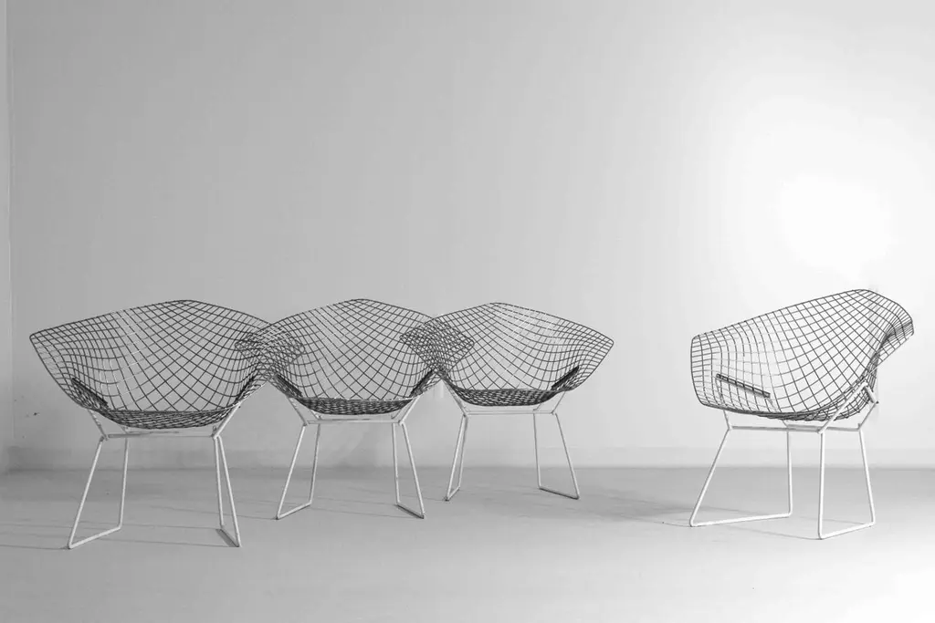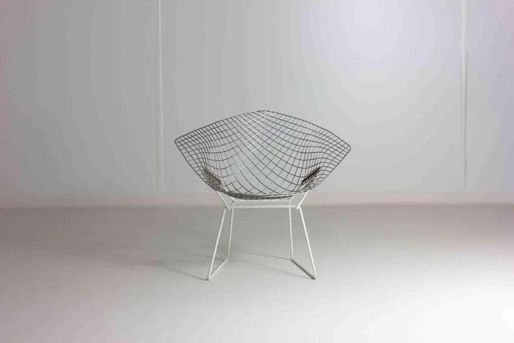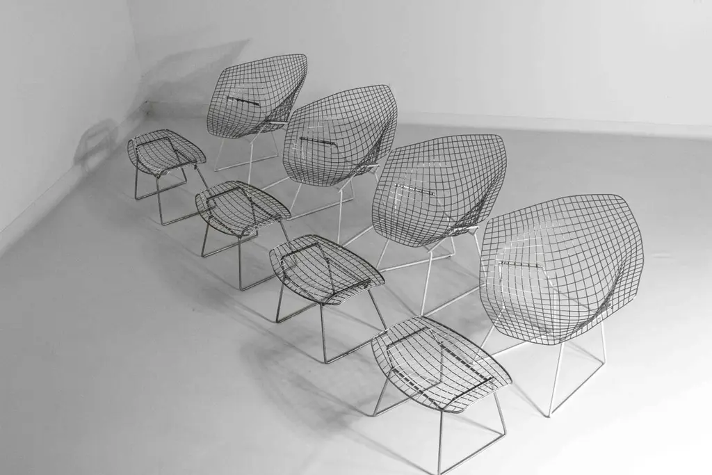 Harry Bertoia’s Diamond Chair, introduced in 1952, is a masterpiece of mid-century design. Crafted from welded steel rods, the chair’s open, airy structure gives the illusion of floating space, earning it the nickname “sitting on air.” Bertoia, a trained sculptor, was known for his obsession with metal and designed the chair to combine strength and elegance. This rare versions of the Diamond Chair come with a matching footstool. These pieces are highly collectible, especially when paired with the original ottoman, and are distinguished by their ergonomic form and timeless modern aesthetic.