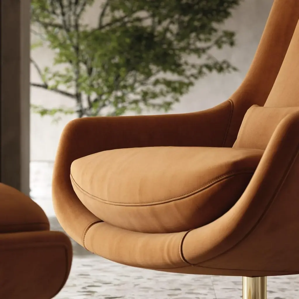Swivel lounge chair with a curved body shape. The metallic base can swivel 360 degrees. Shown here in Leather and Columbia Tofee Fabric.Stainless steel base in polished Copper. See photos metal base colors. Available in COM, COM required 6 yardsContact us to enquire about COM/COL production, requirements and material shipping instructions.870 W x 880 D x 1000 H - SH450 mm34.25" W x 34.75" D x 39.5" H - SH 17.75"Ottoman Dimensions:680 W x 700 D x 420 H - SH420 mm26.75" W x 27.56" D x 16.5 H - SH 16.5"Please contact us if you have any questions about customization and pricing. We will be glad to check with the factory’s technical team if sizes, finishes, and colors can be customized. We do our best to expedite production and to ship and deliver product within the listed lead time, however current lead times might be longer due to global shipping backlog and delays. These delays are out of our control and cannot be a reason to cancel an order.Our pricing includes all costs for international shipping to the U.S., as well as duties and customs clearance fees. Please be aware that local delivery within the U.S. is not included. We offer white glove, front door, and warehouse delivery options. For shipments outside the U.S., kindly reach out to us for a detailed quote