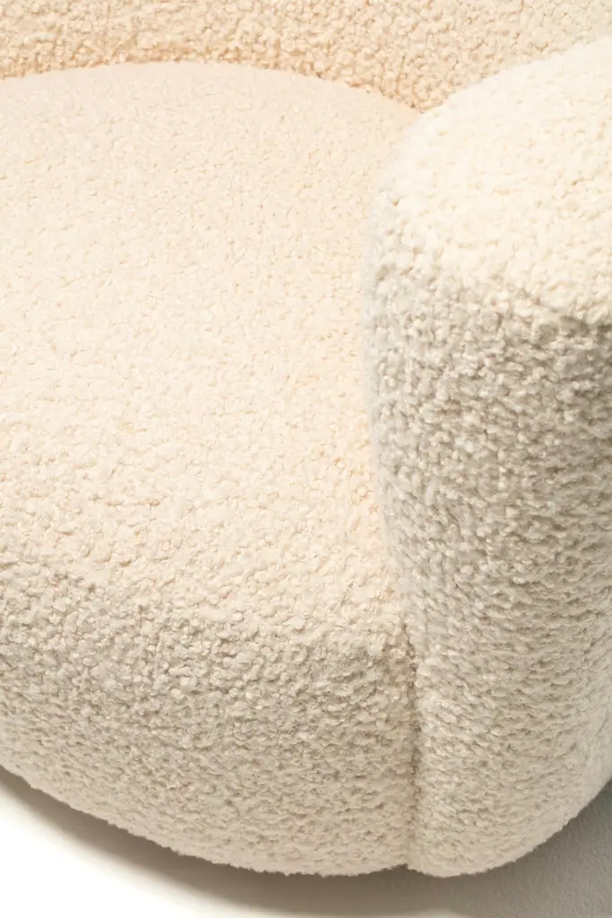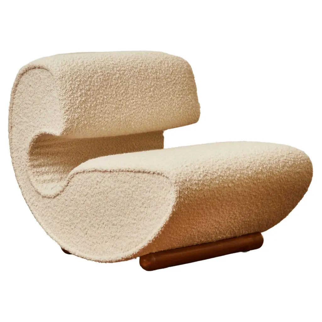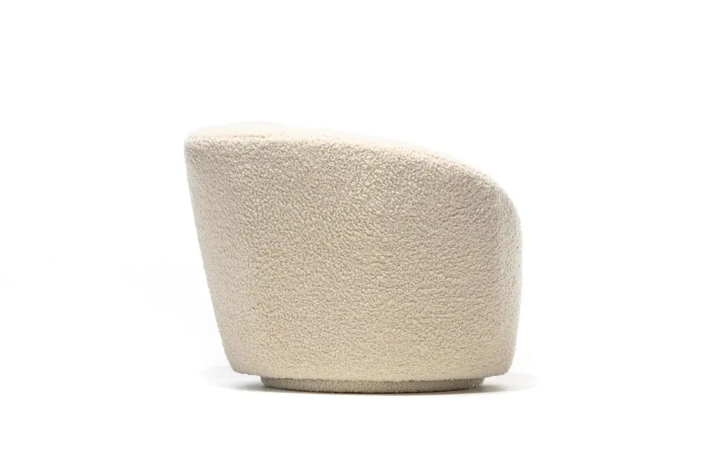 Amongst the most popular Vladimir Kagan designs, this Nautilus swivel lounge chair is sculptural, comfortable and fun, and is shown in fresh ivory bouclé upholstery. The Bouclé is uber luxurious and super soft. The Nautilus chair has a corkscrew shape with sloped back and arm. And it swivels making it a great choice for open floor plans - you may align your sight with any person or object in the room simply with a gentle swivel. Matching contoured custom Ottoman is on casters and seamlessly rolls into place like a puzzle piece inviting you to relax and put your feet up with a good book or a glass of your favorite vino. Newly professionally reupholstered in heavy duty ivory bouclé. Go ahead and treat yourself. Want to see more beautiful things? Scroll down below and click "View All From Seller" or favorite our shop to get your 1stDibs on our new inventory.Nautilus chairs: 36” W x 33” D x 29” H (Seat Height 17”)Ottoman: 33” W x 21” D x 17” H.
