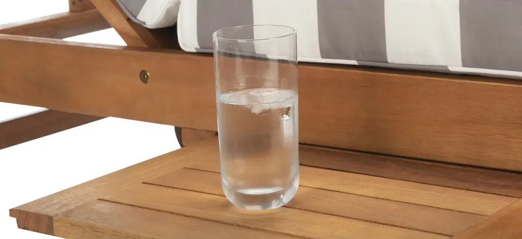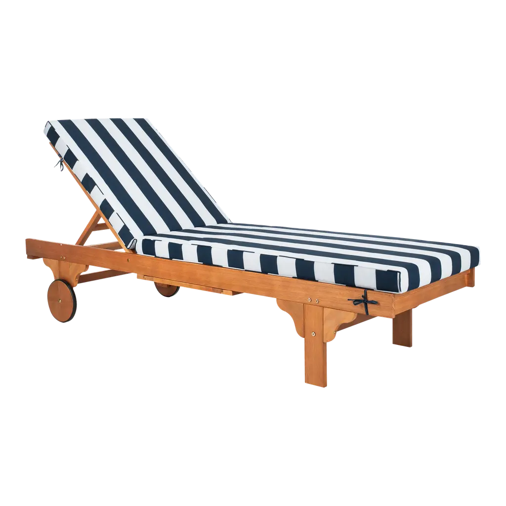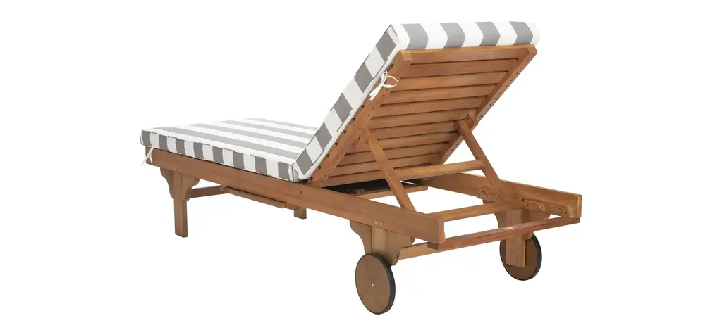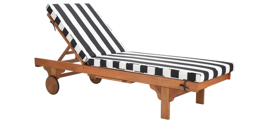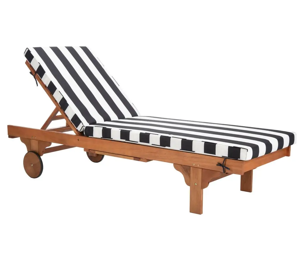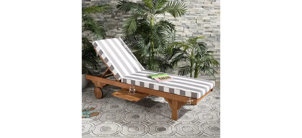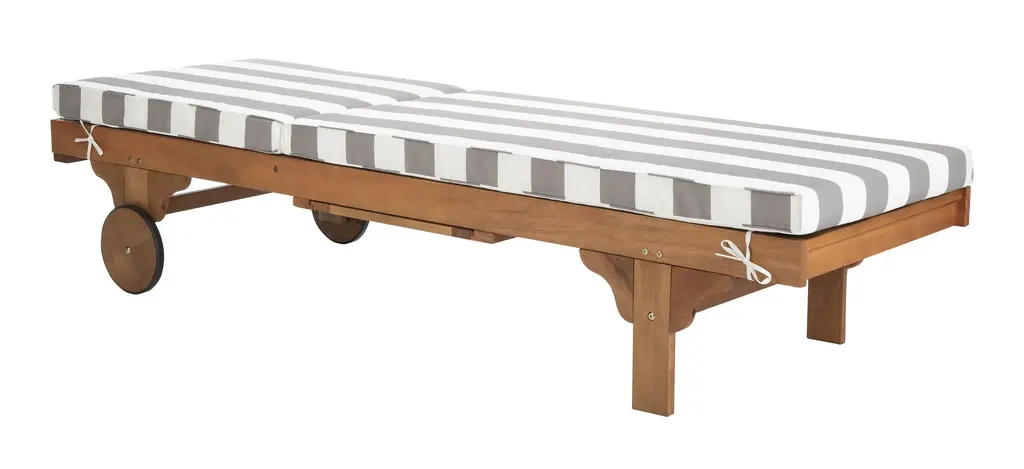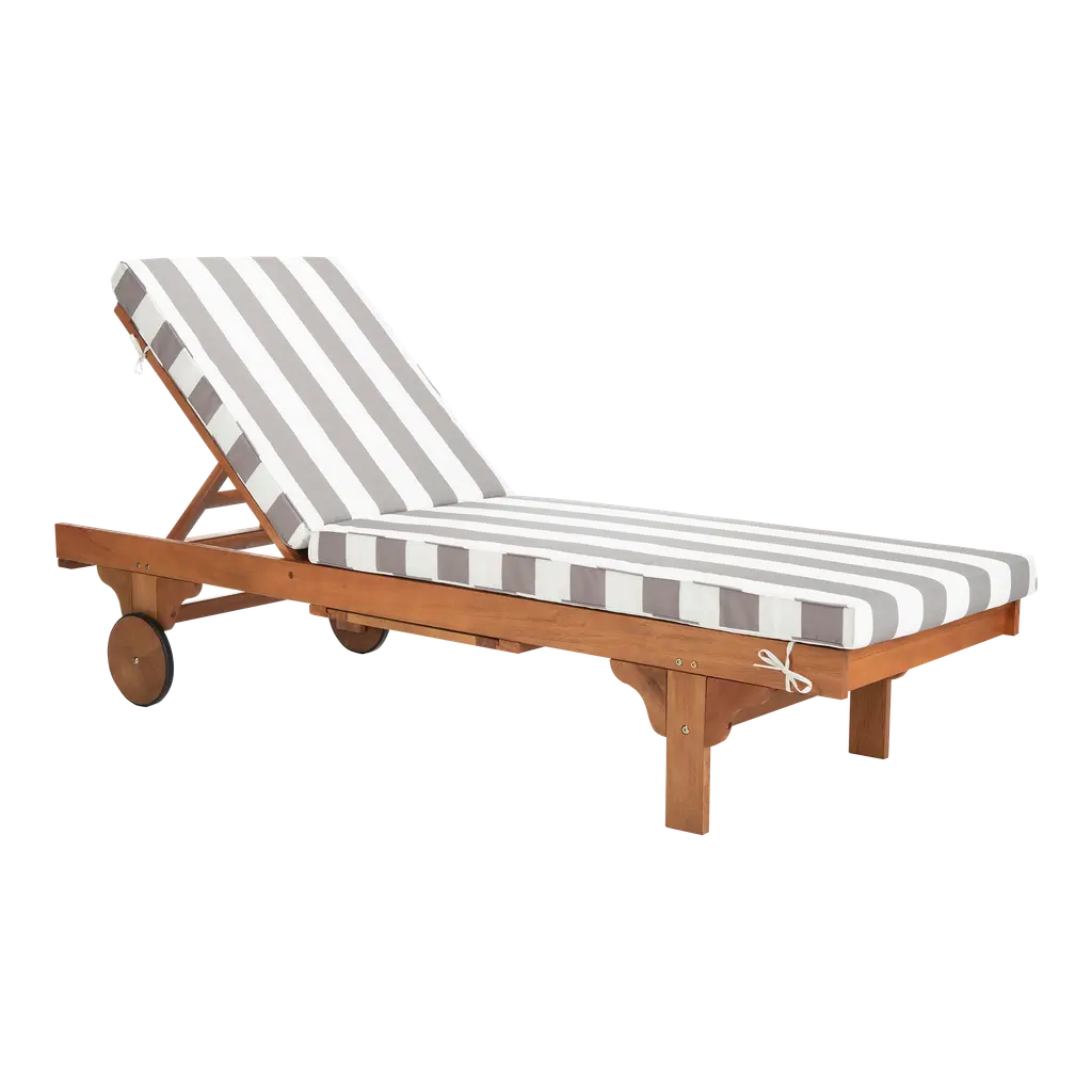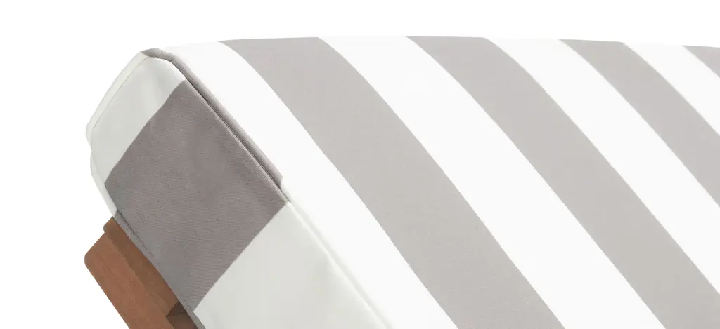 A fresh update of an English garden classic, the Artria outdoor chaise lounge recalls the manicured landscapes of Rhode Island seaside mansions. Crafted with gray and white striped fabric with a natural finish on eucalyptus wood, Artria comes with a sliding table for your drinks and refreshments.