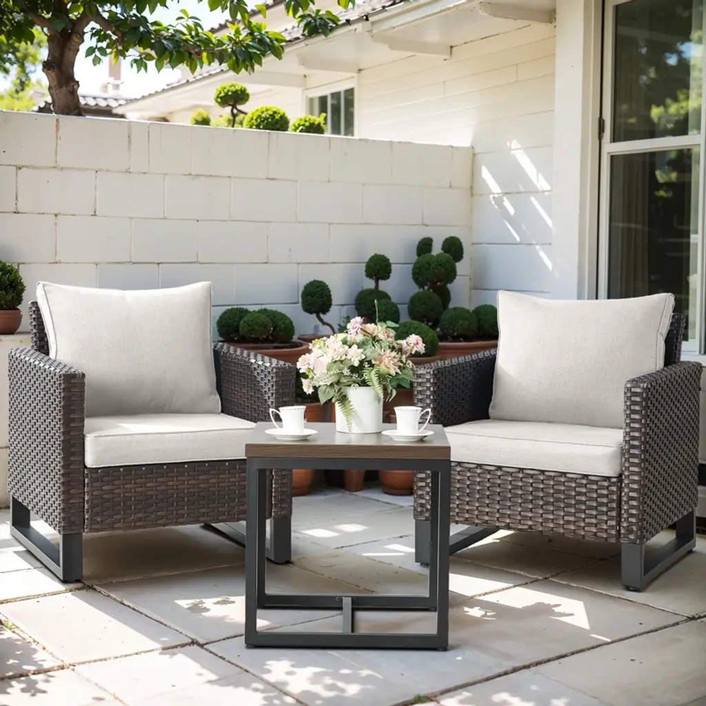 Discover the Essence of Outdoor Comfort! Elevate your front porch with our exclusive Rattan Outdoor Furniture Sale featuring a stunning 3-Piece Patio Set. Each weather-resistant item boasts woven detailing, creating a textured and breezy modern appearance. Whether entertaining guests or savoring moments of solitude with your morning coffee, our furniture creates a cozy and chic ambiance.