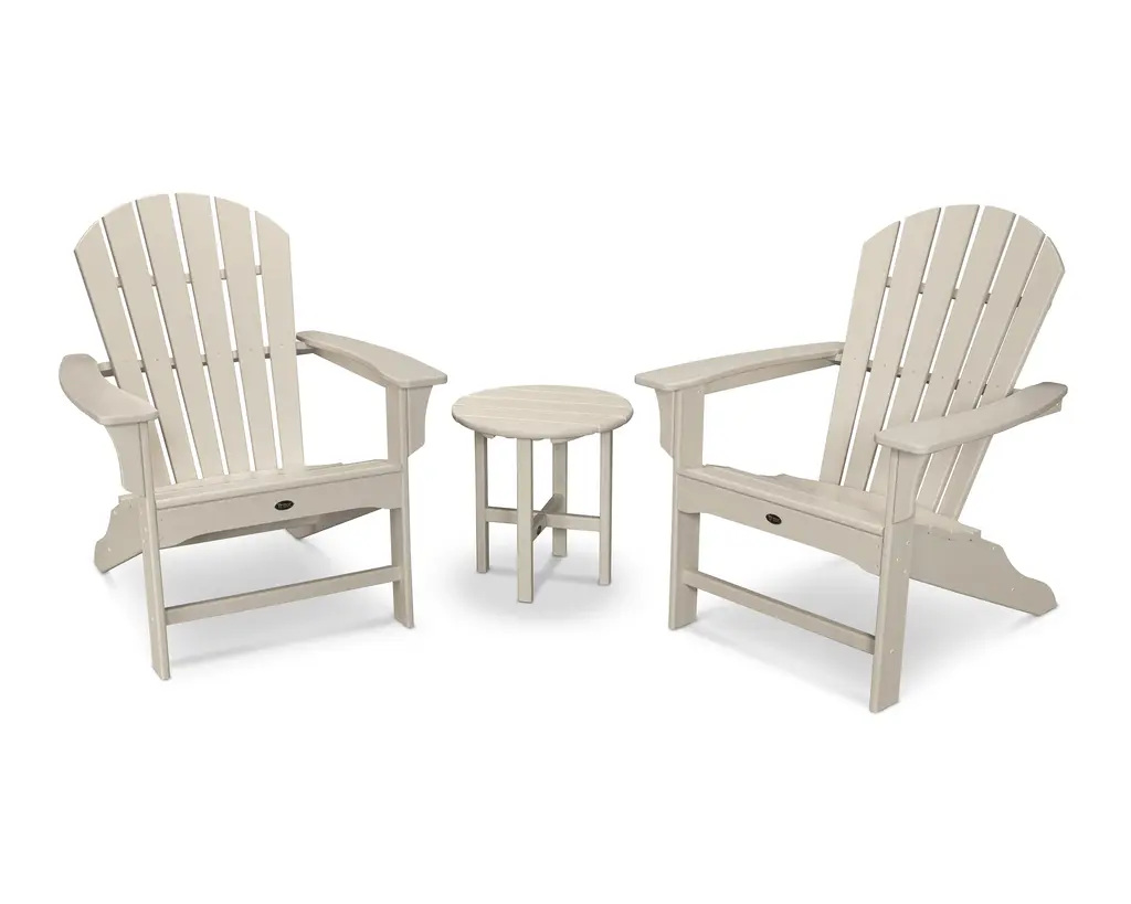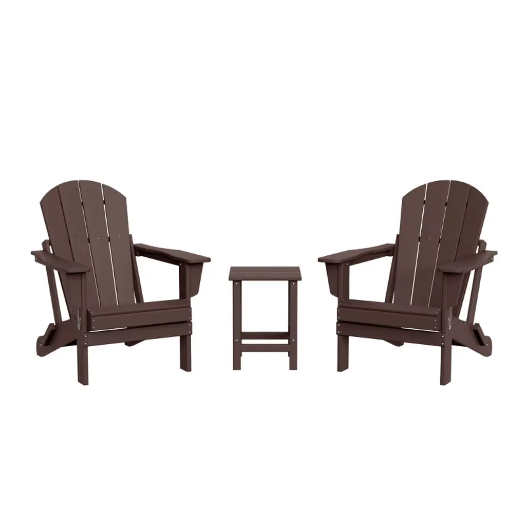 A sturdy and stylish addition to your favorite outdoor space, this Adirondack set is made using Polywood--an eco-friendly, synthetic material that mimics the look of painted wood without any of the upkeep. A warm teak finish completes the look. Made in the USA.